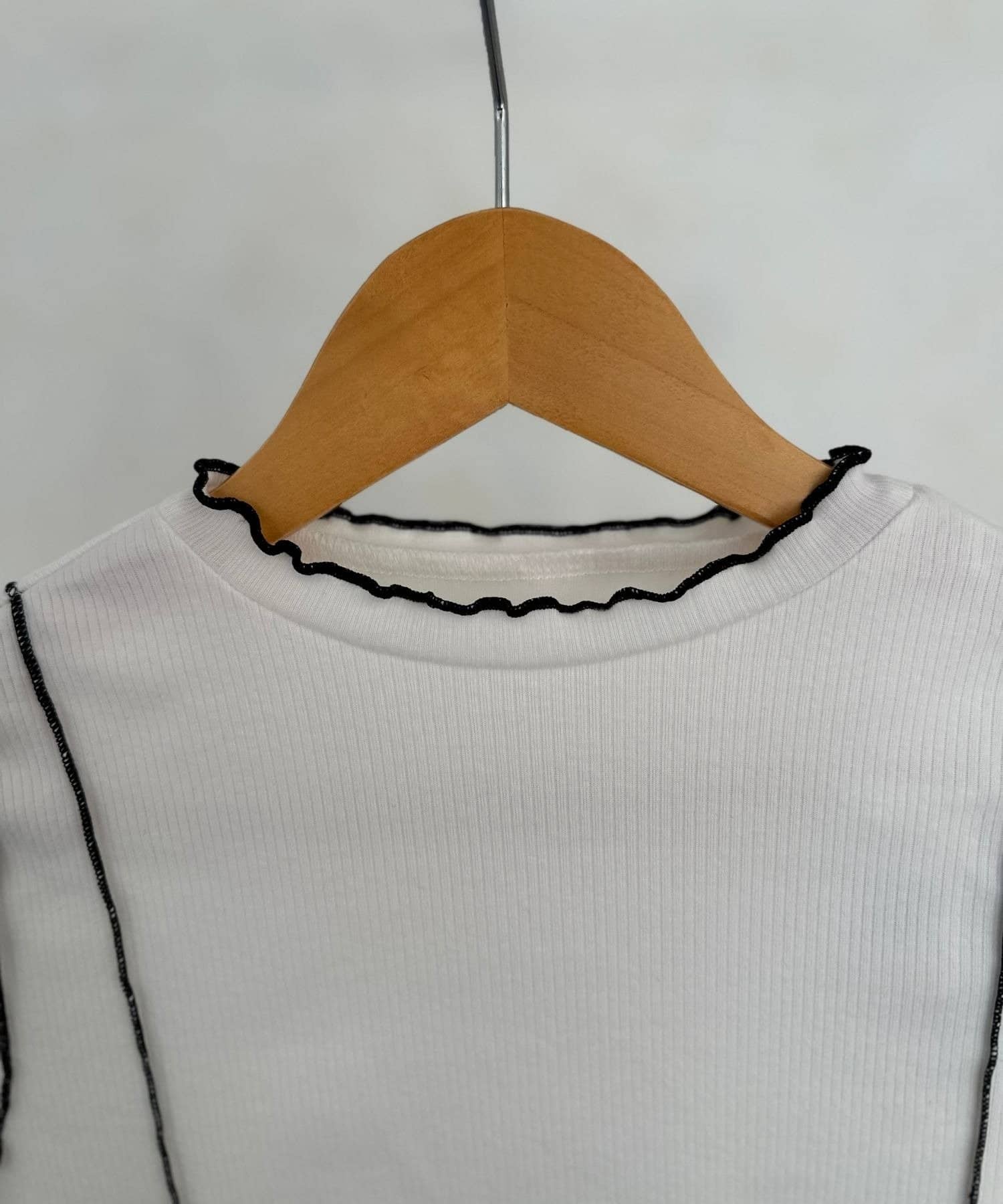 シンプルなデザインながらも、トレンド感のあるメローフリルと、アクセントになるパイピングが、おしゃれ度を格上げ。