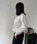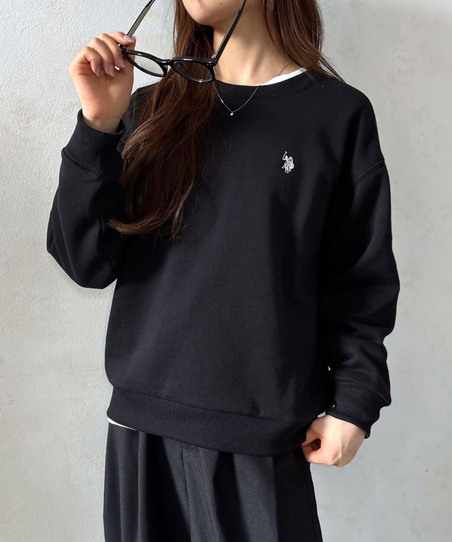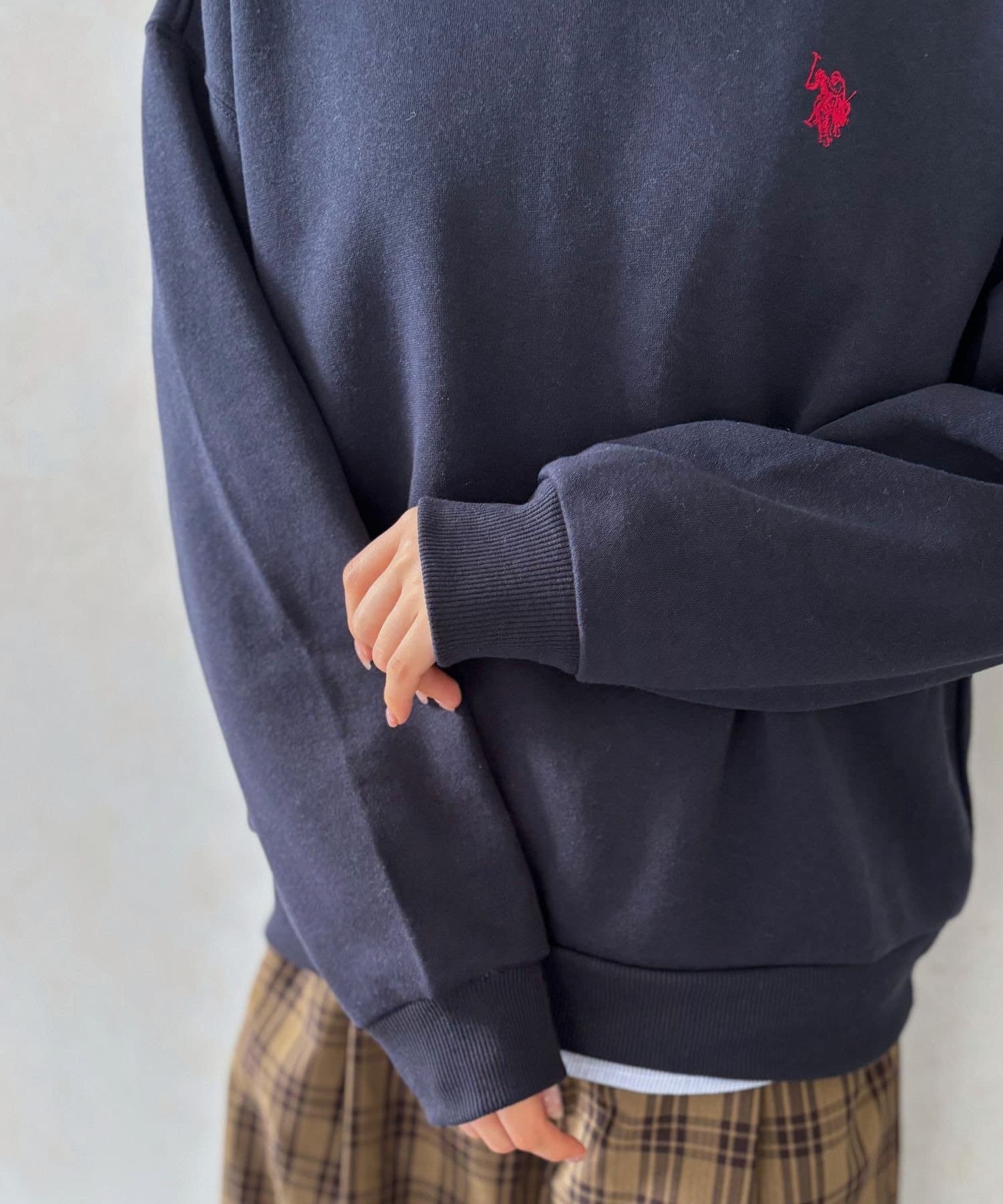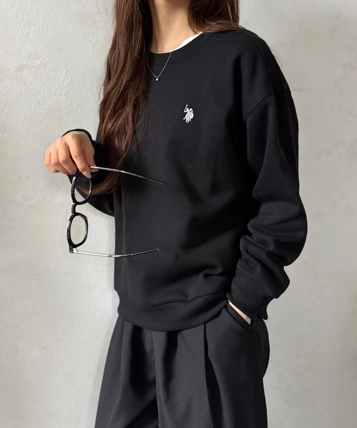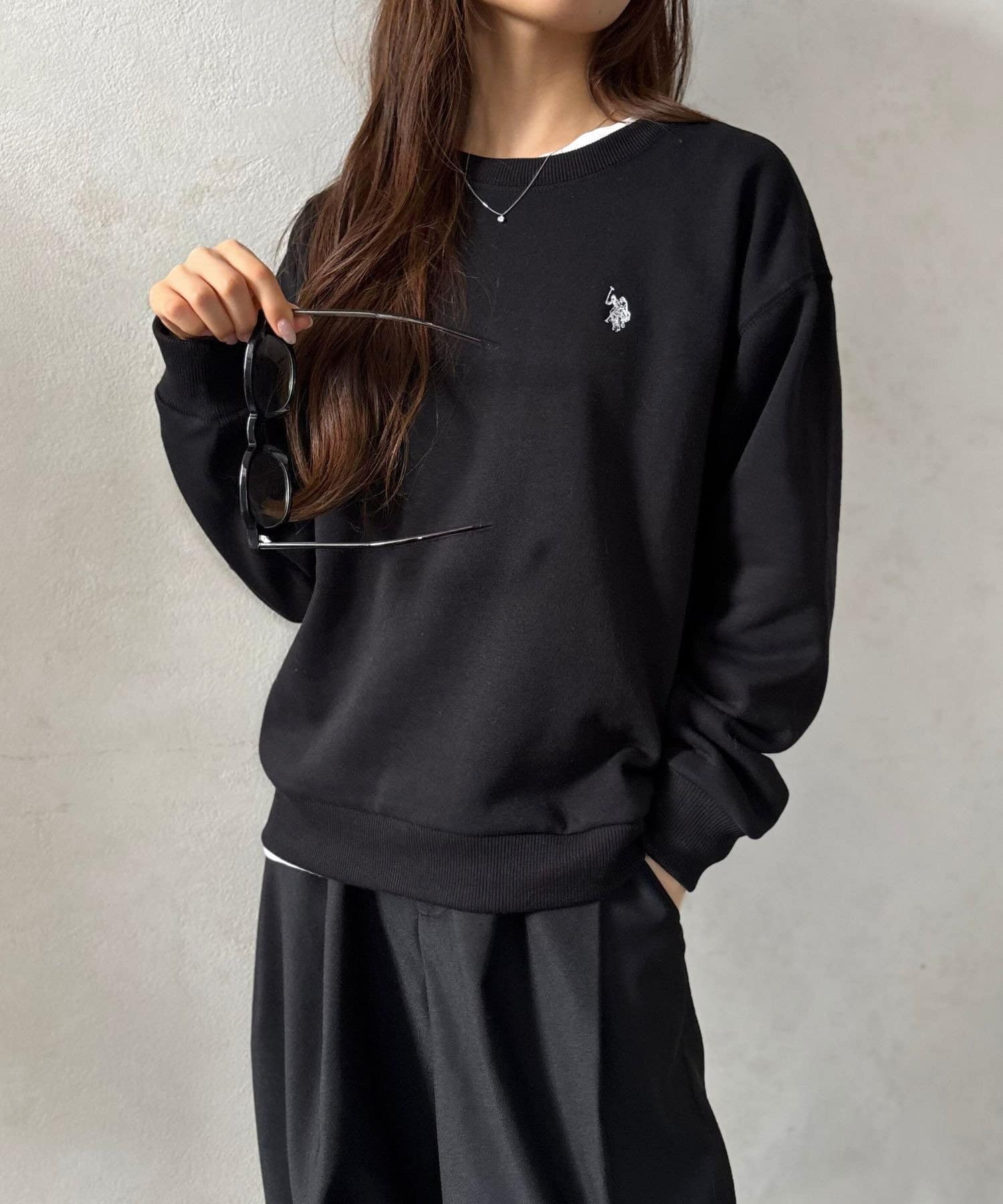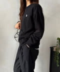 胸元のさりげないブランドロゴが、カジュアルながらも上品な印象をプラス。