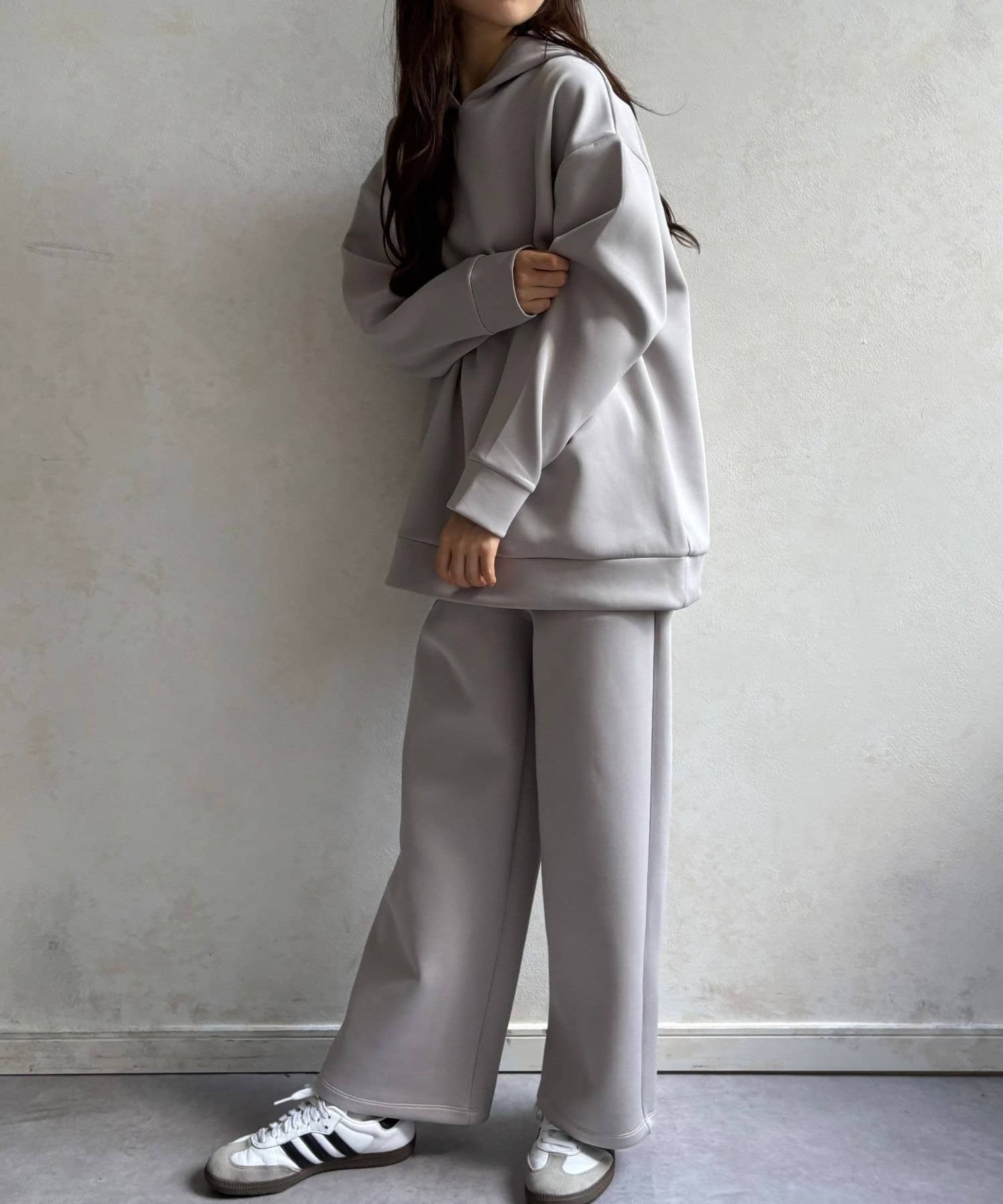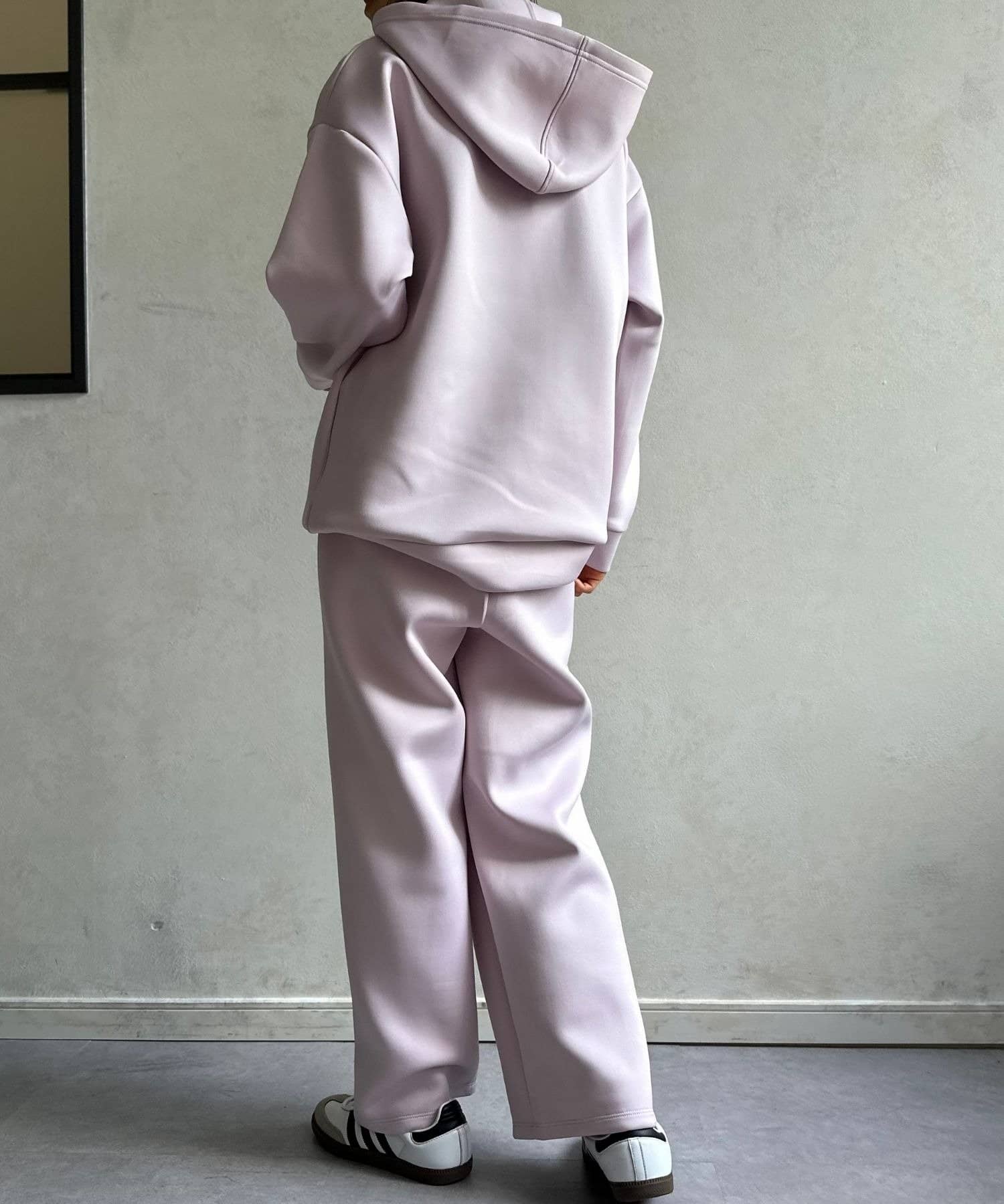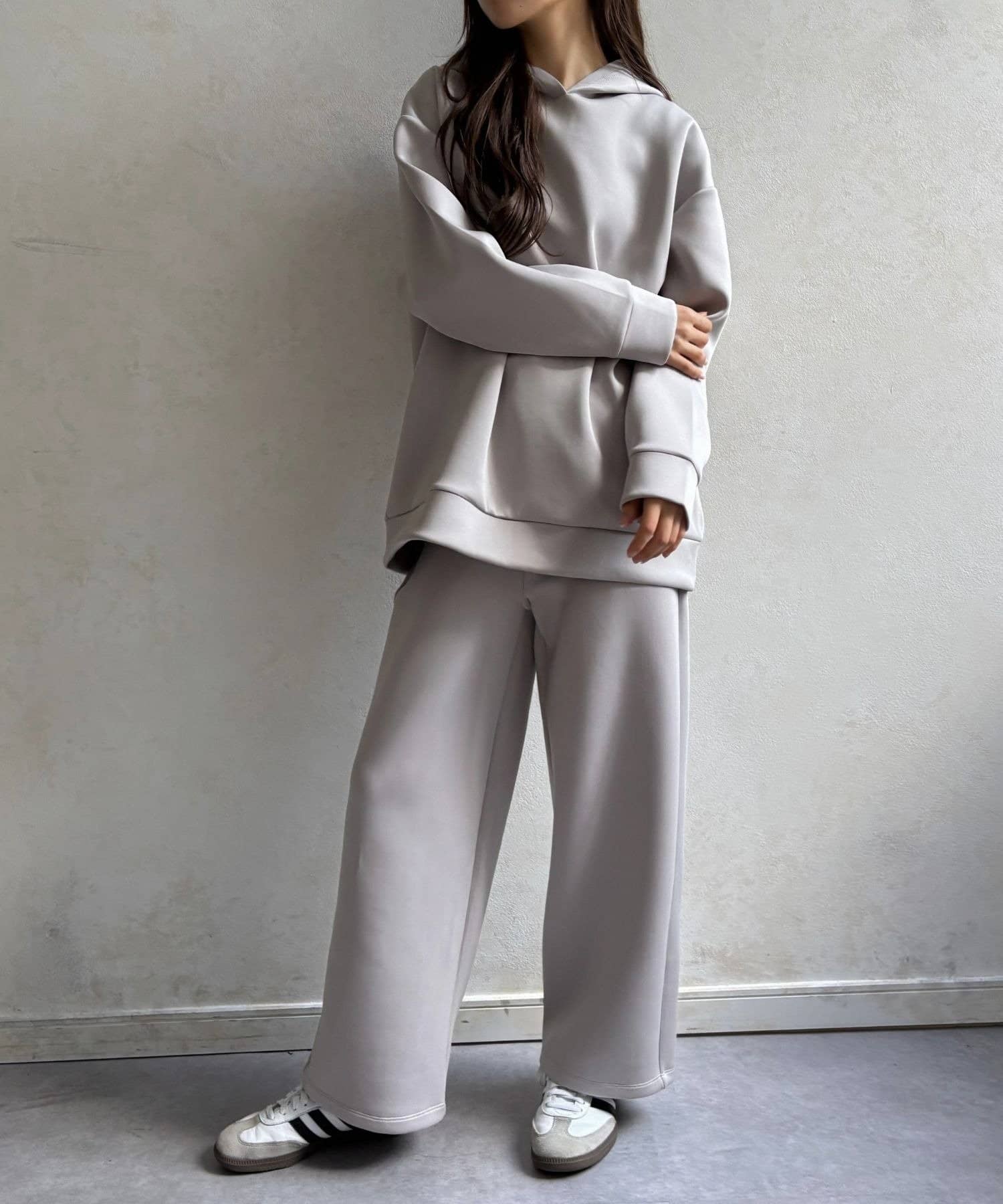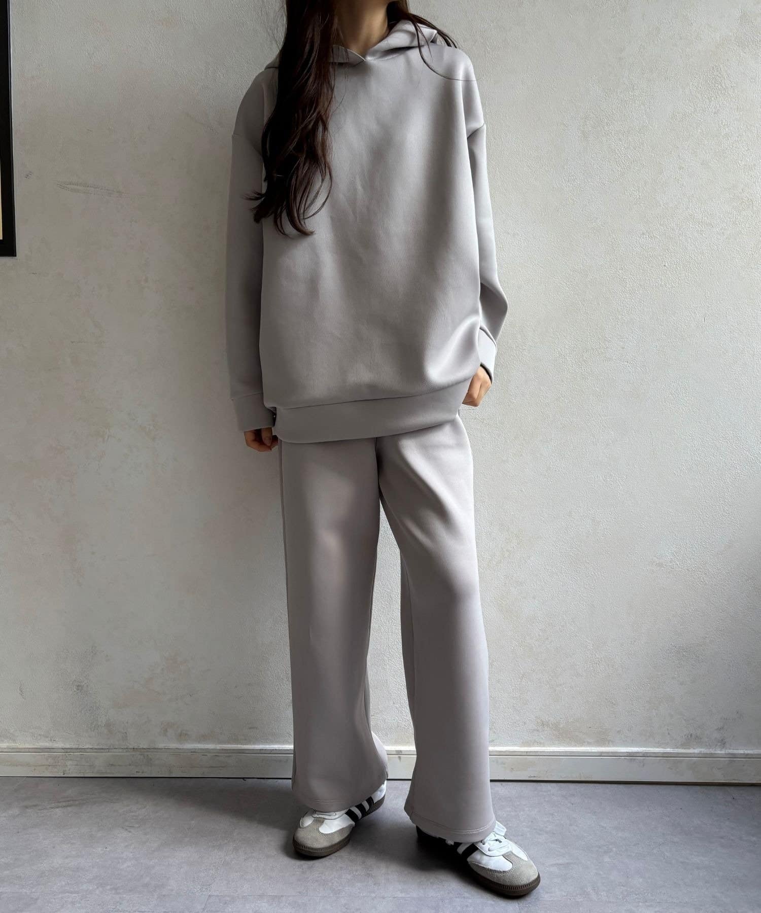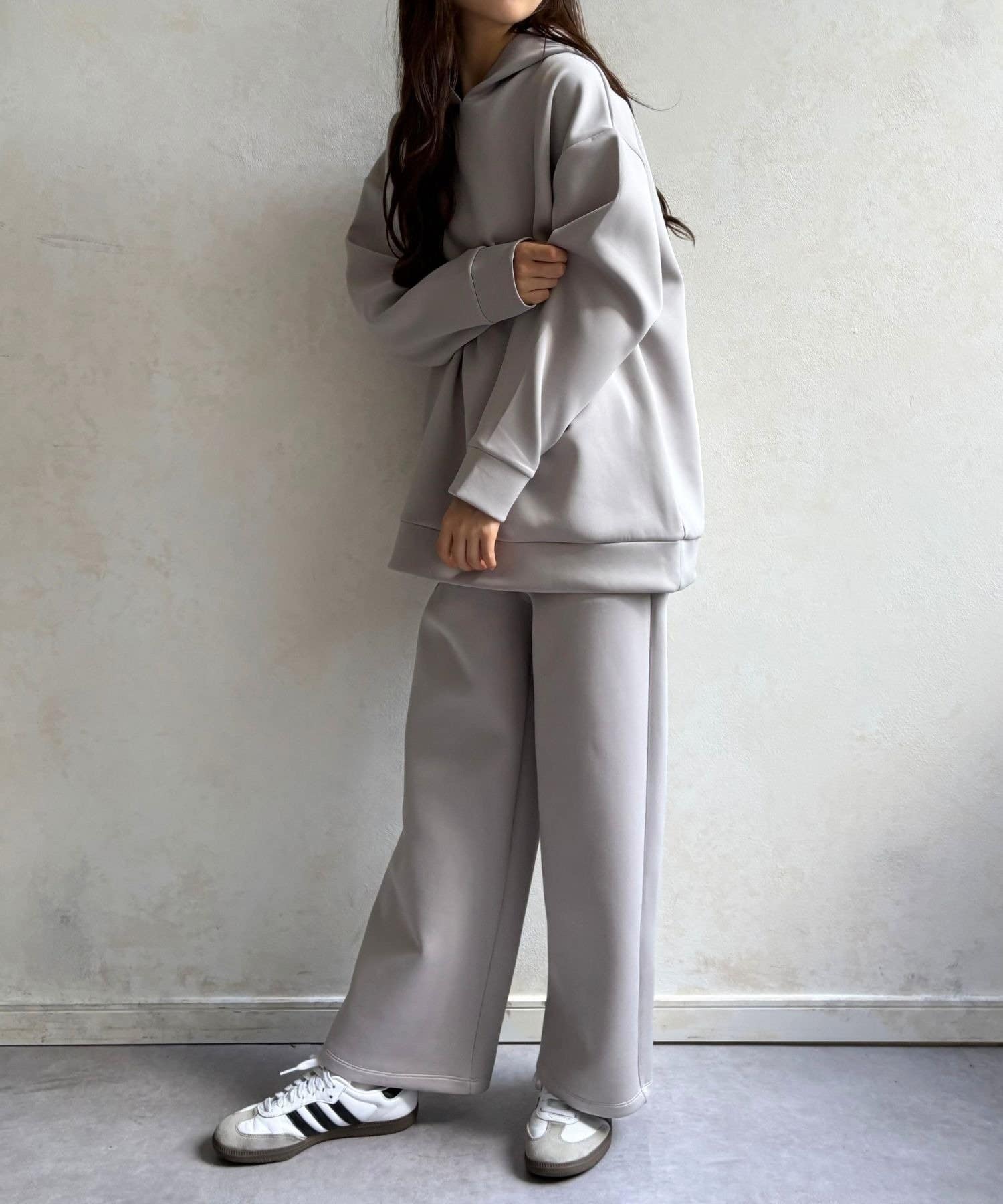 伸縮性があるので動きやすく、おうちでのリラックスタイムにもぴったり。ちょっとそこまでのお出かけにも、自信を持って着ていけます。