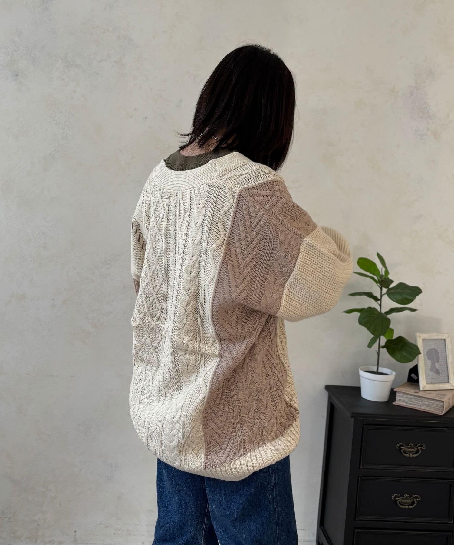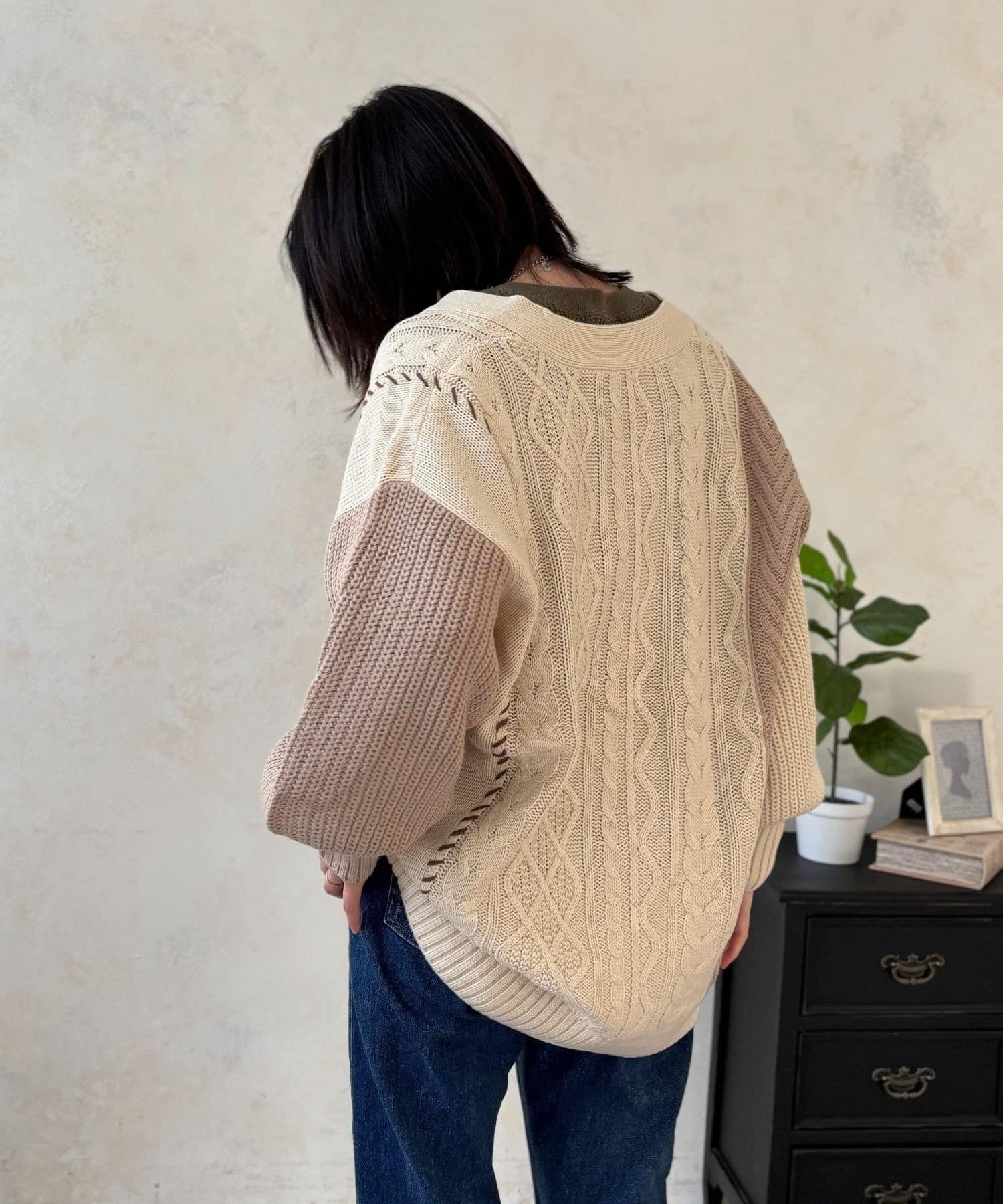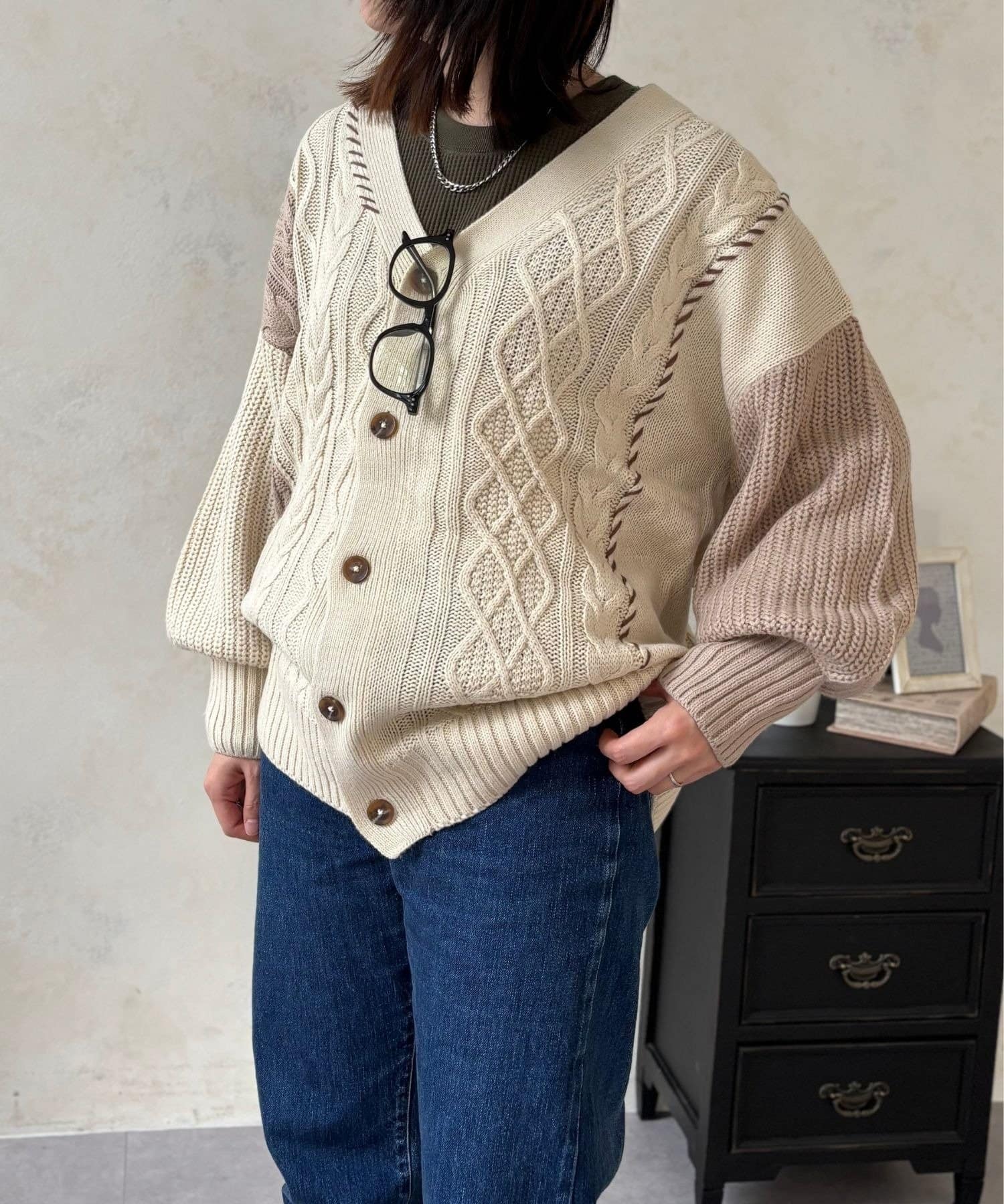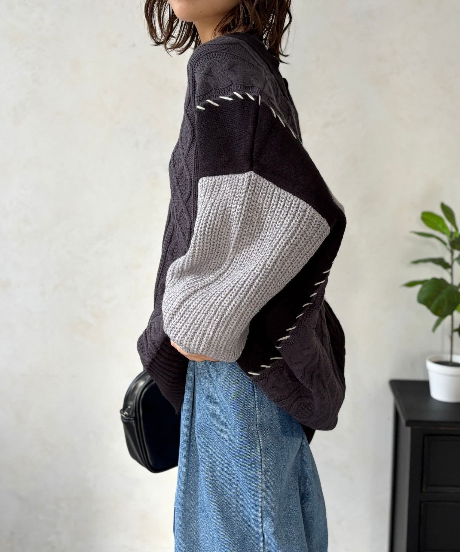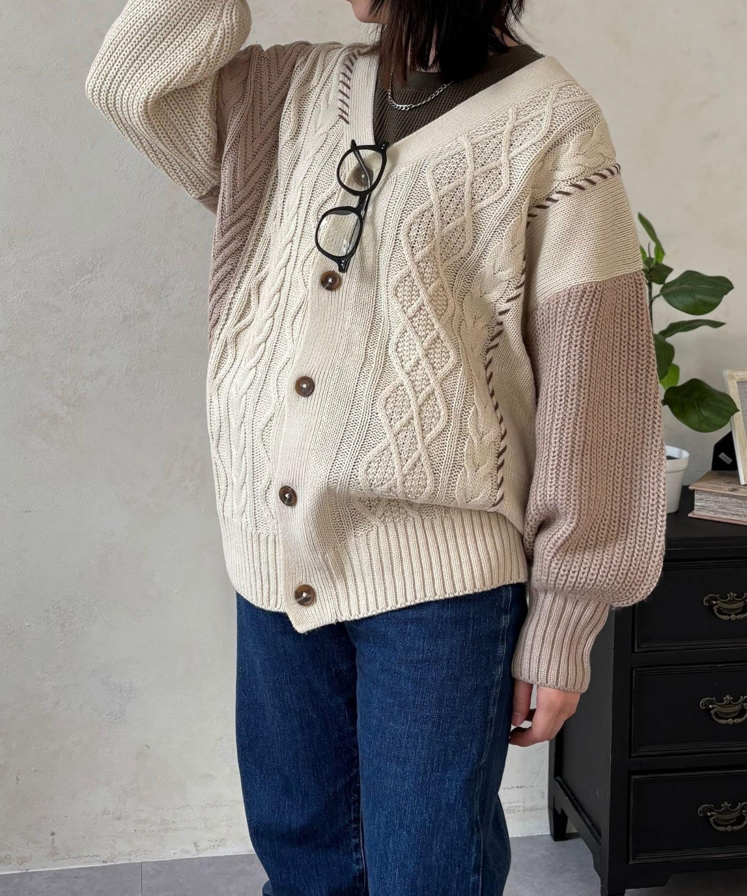 ざっくり感がたまらない、体系カバーが叶う切替ハンドステッチカーデ