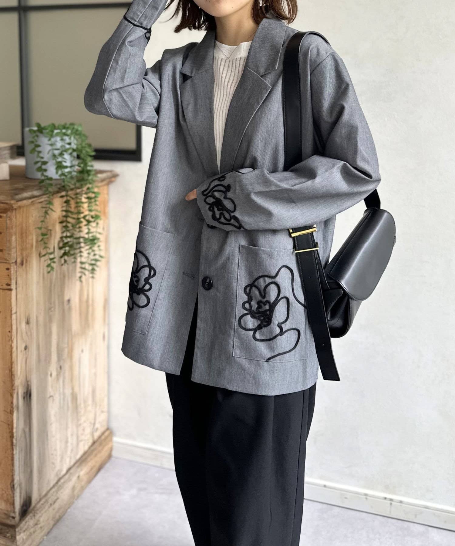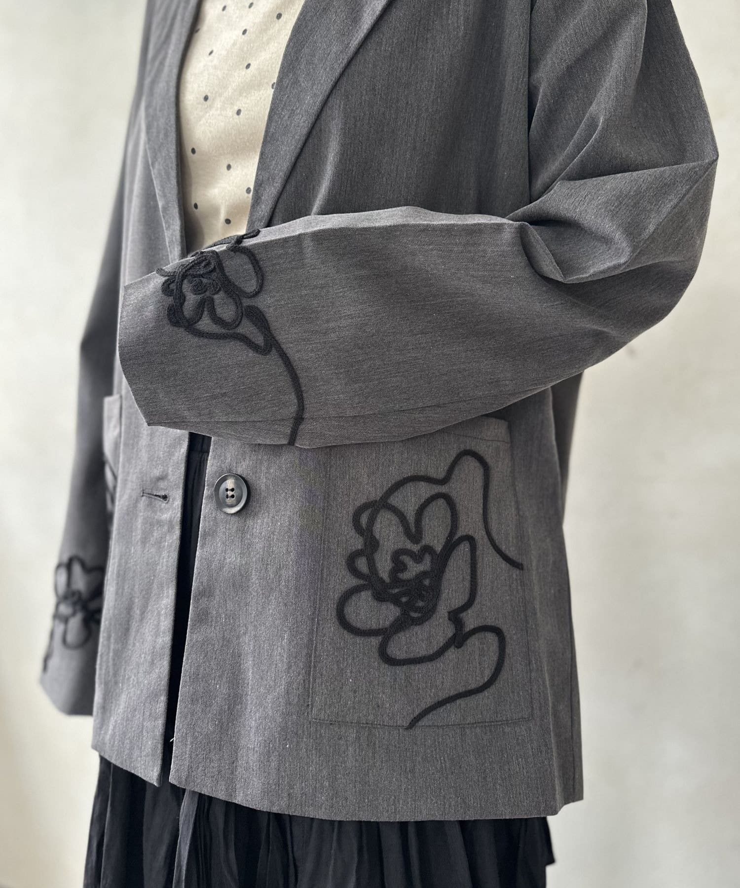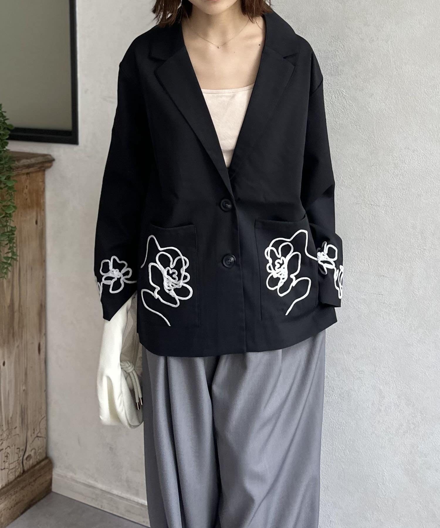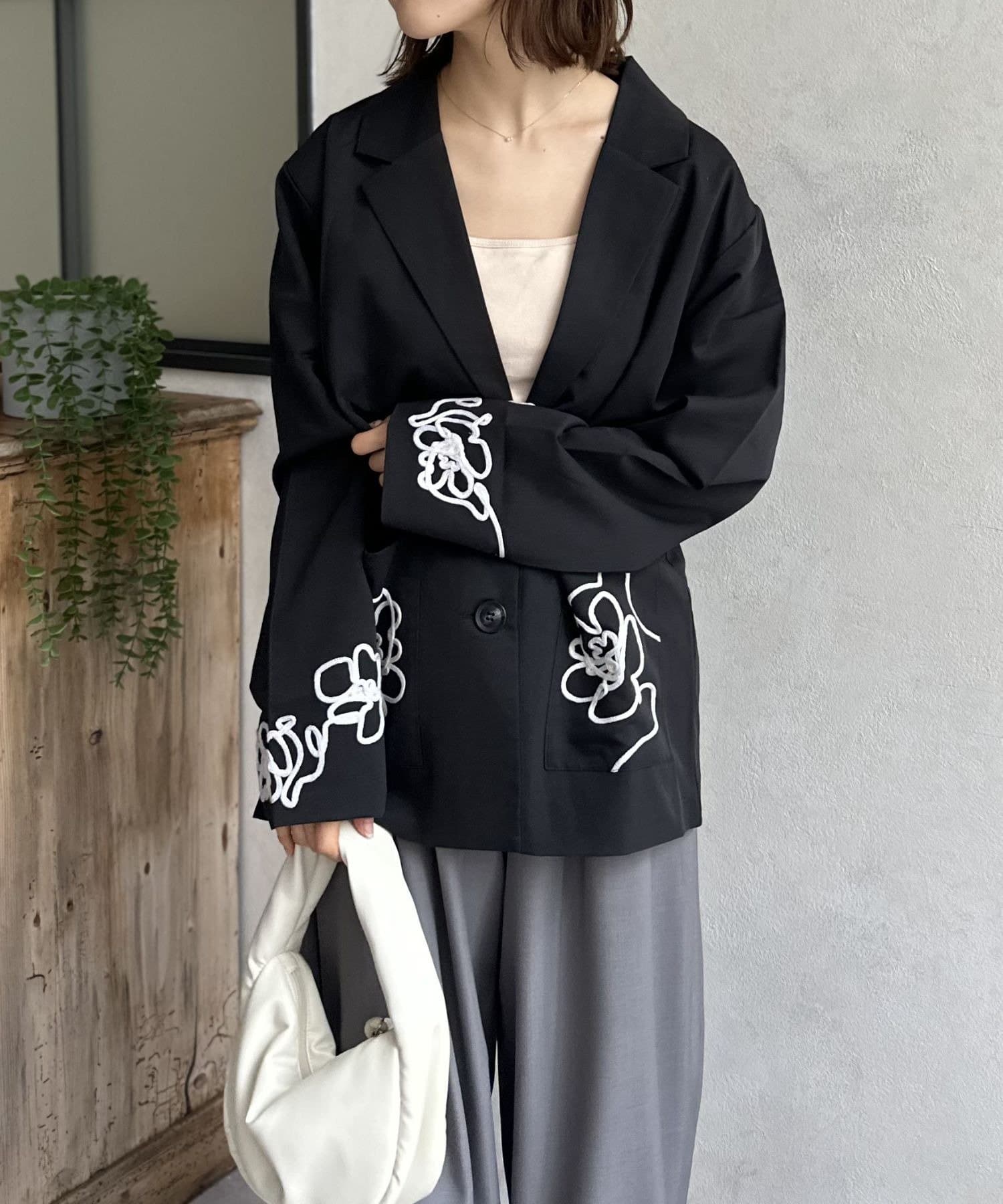 立体的で存在感のあるフラワーモチーフのコード刺繍が、シンプルなジャケットにモードなエッセンスをプラス。