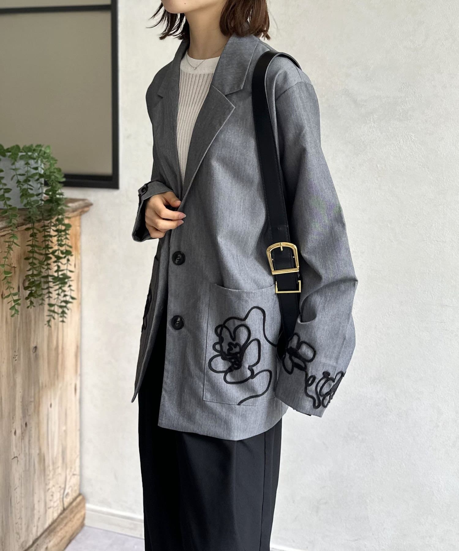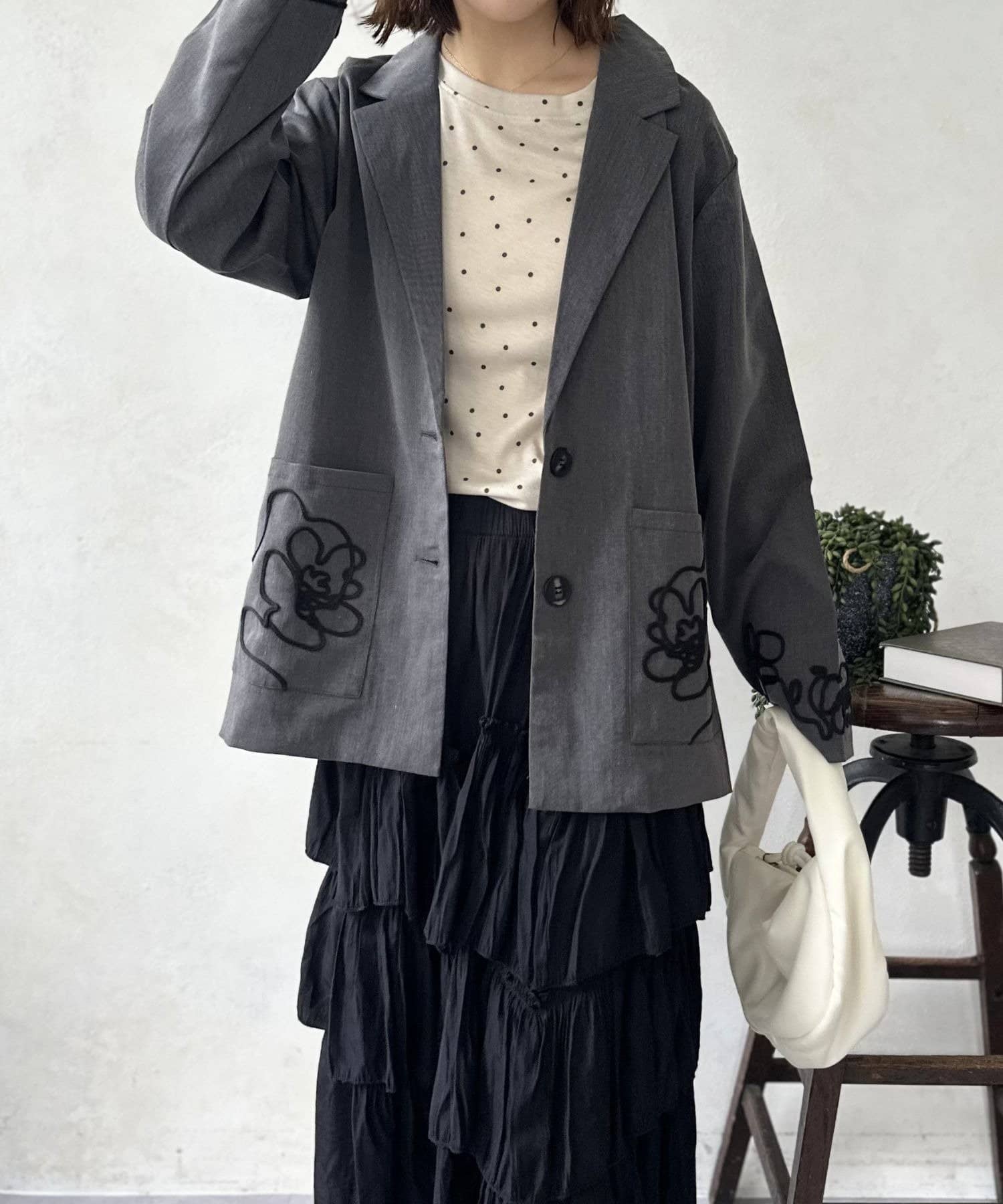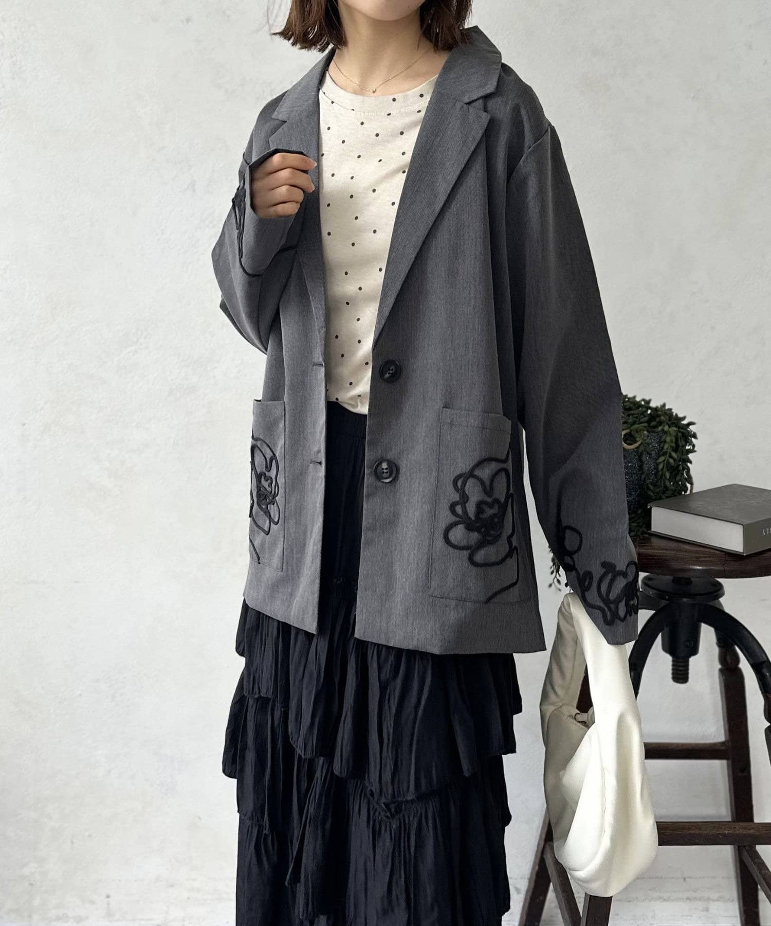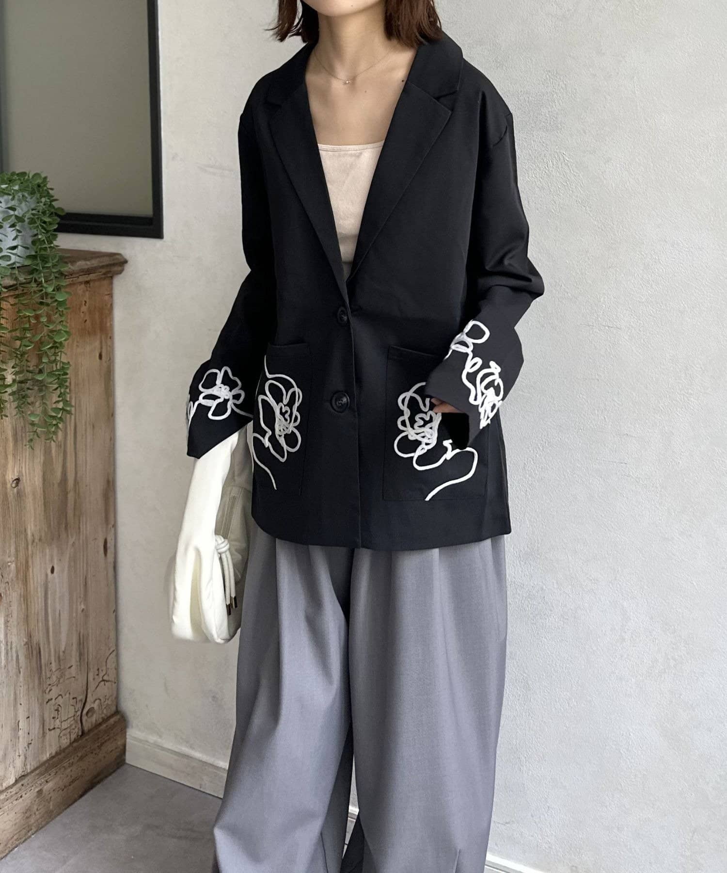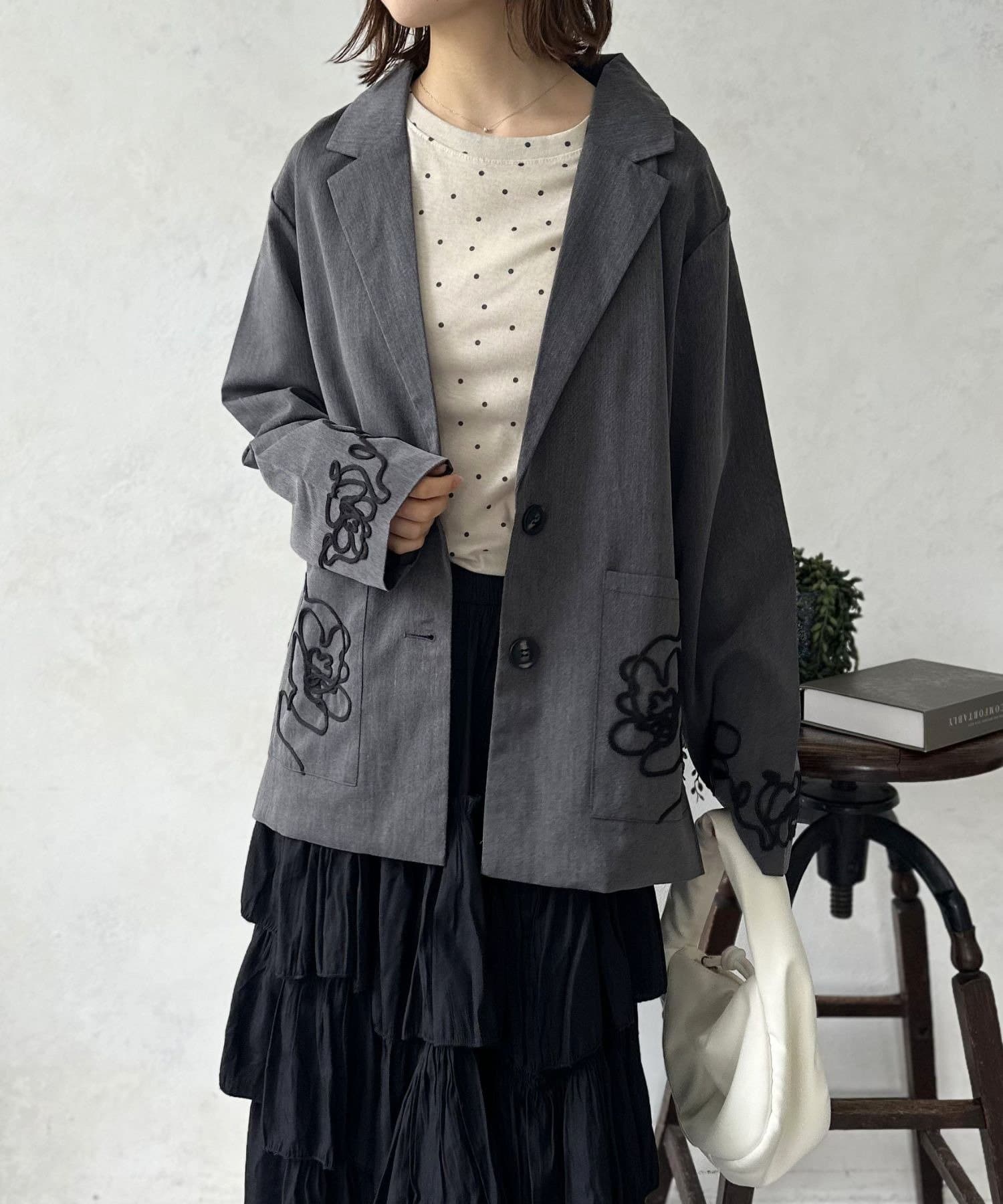立体的で存在感のあるフラワーモチーフのコード刺繍が、シンプルなジャケットにモードなエッセンスをプラス。