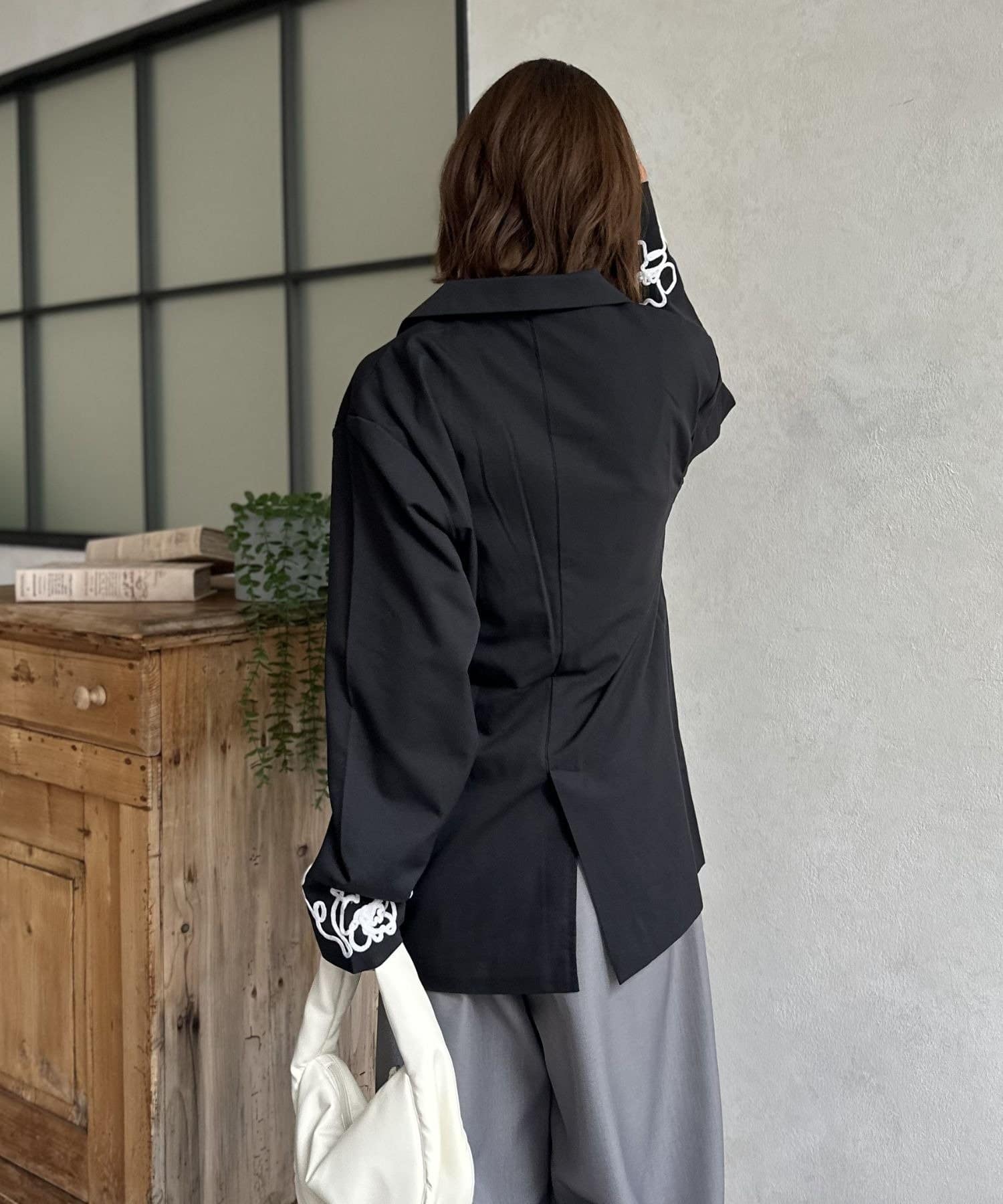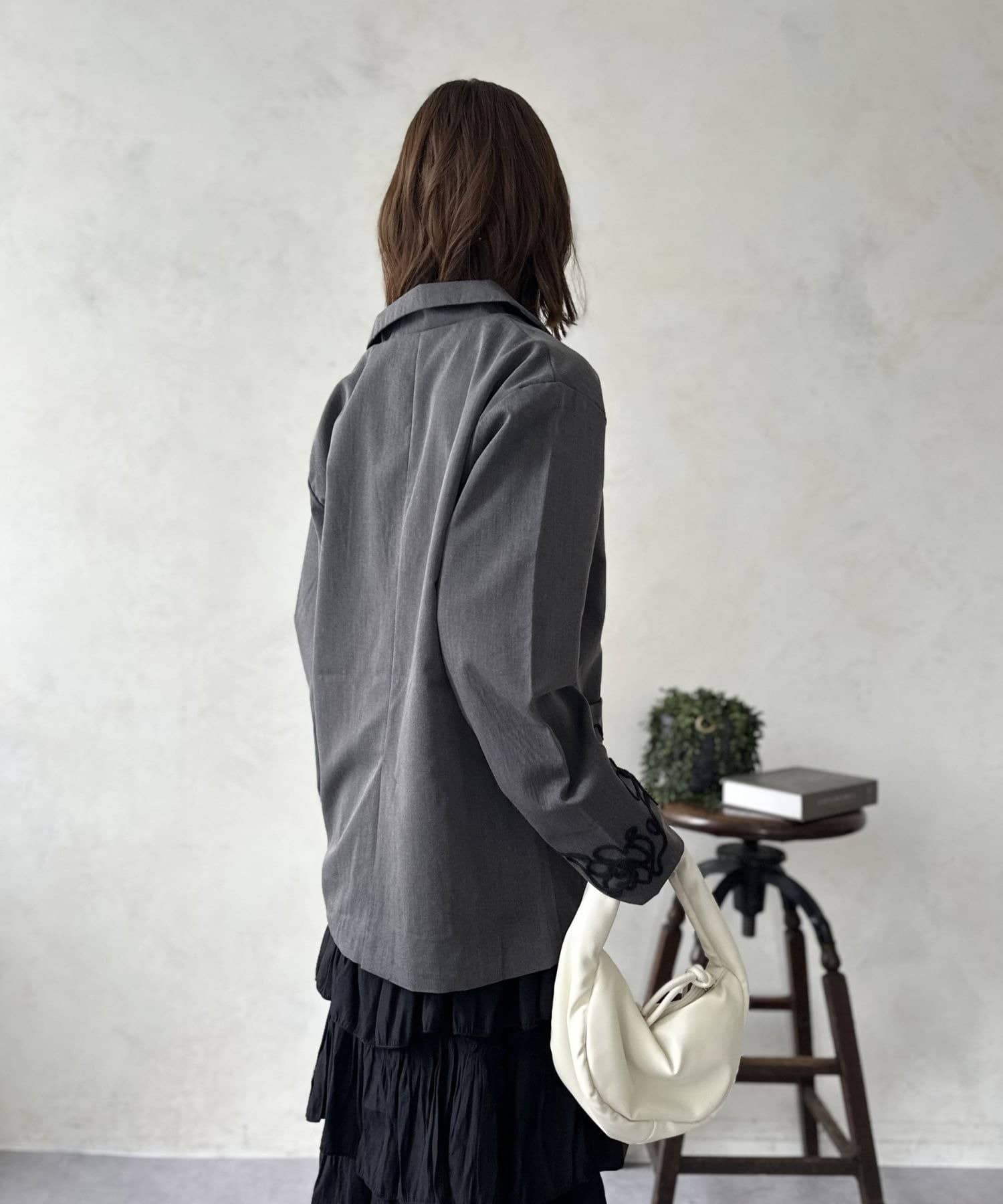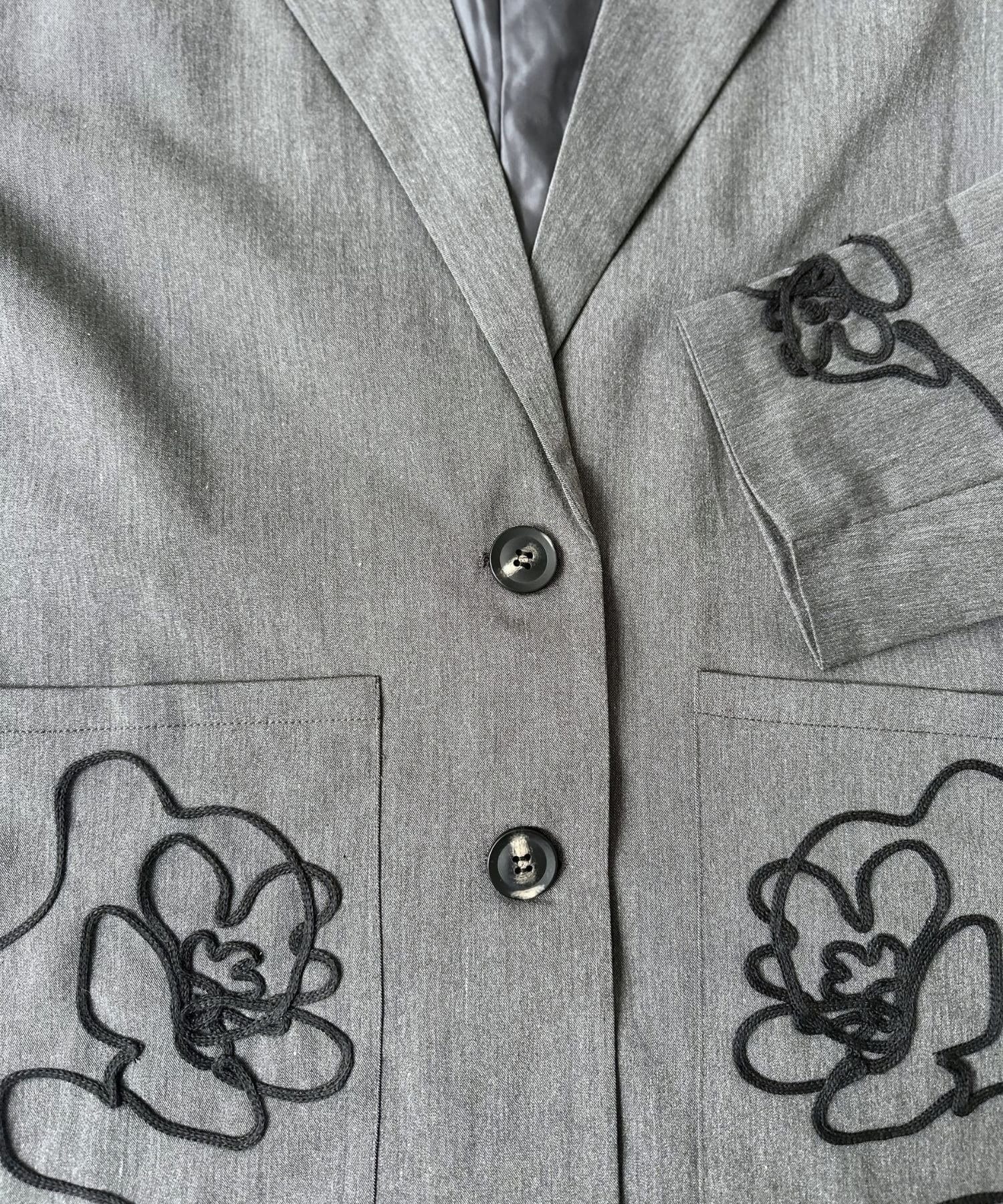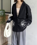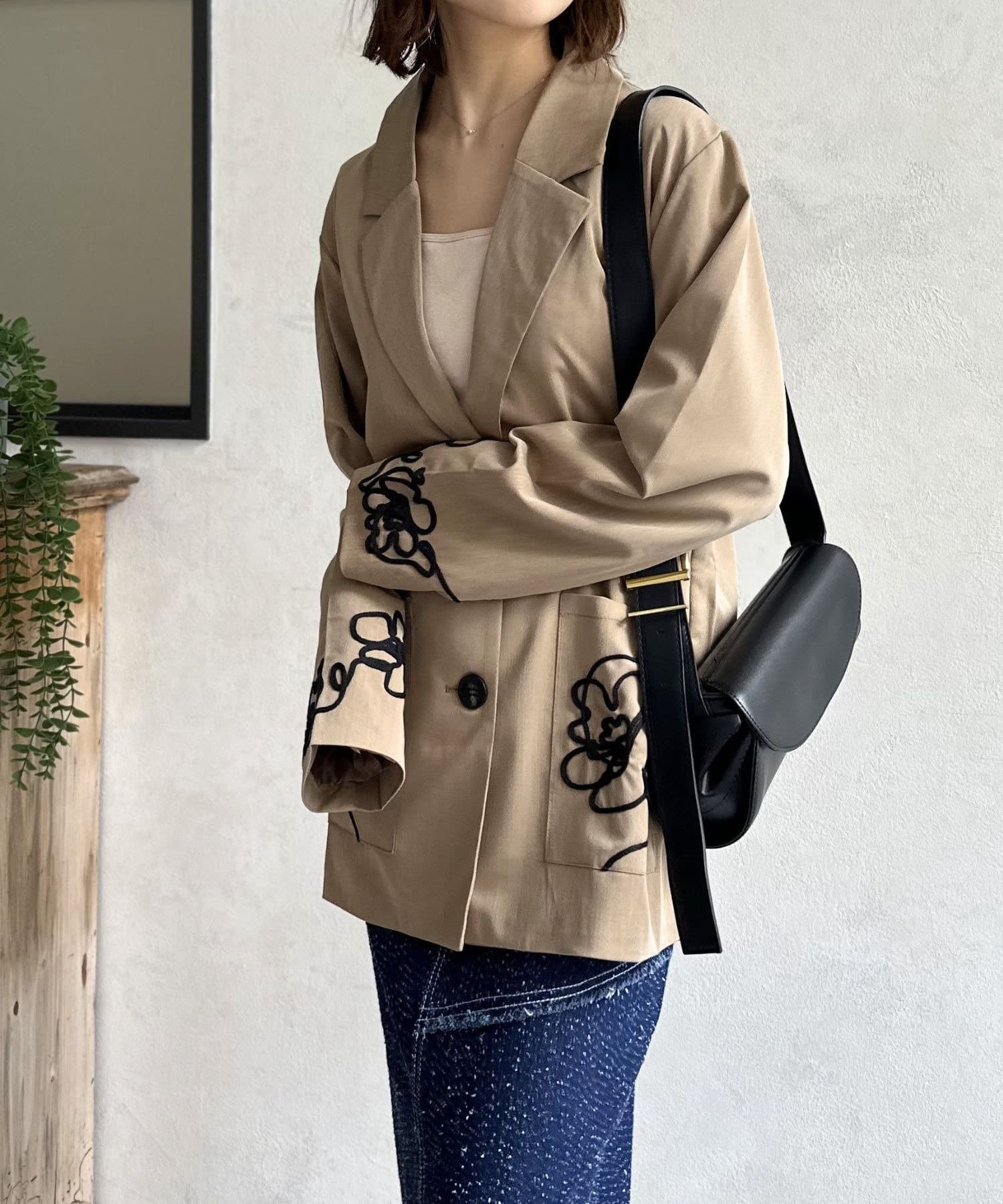 立体的で存在感のあるフラワーモチーフのコード刺繍が、シンプルなジャケットにモードなエッセンスをプラス。
