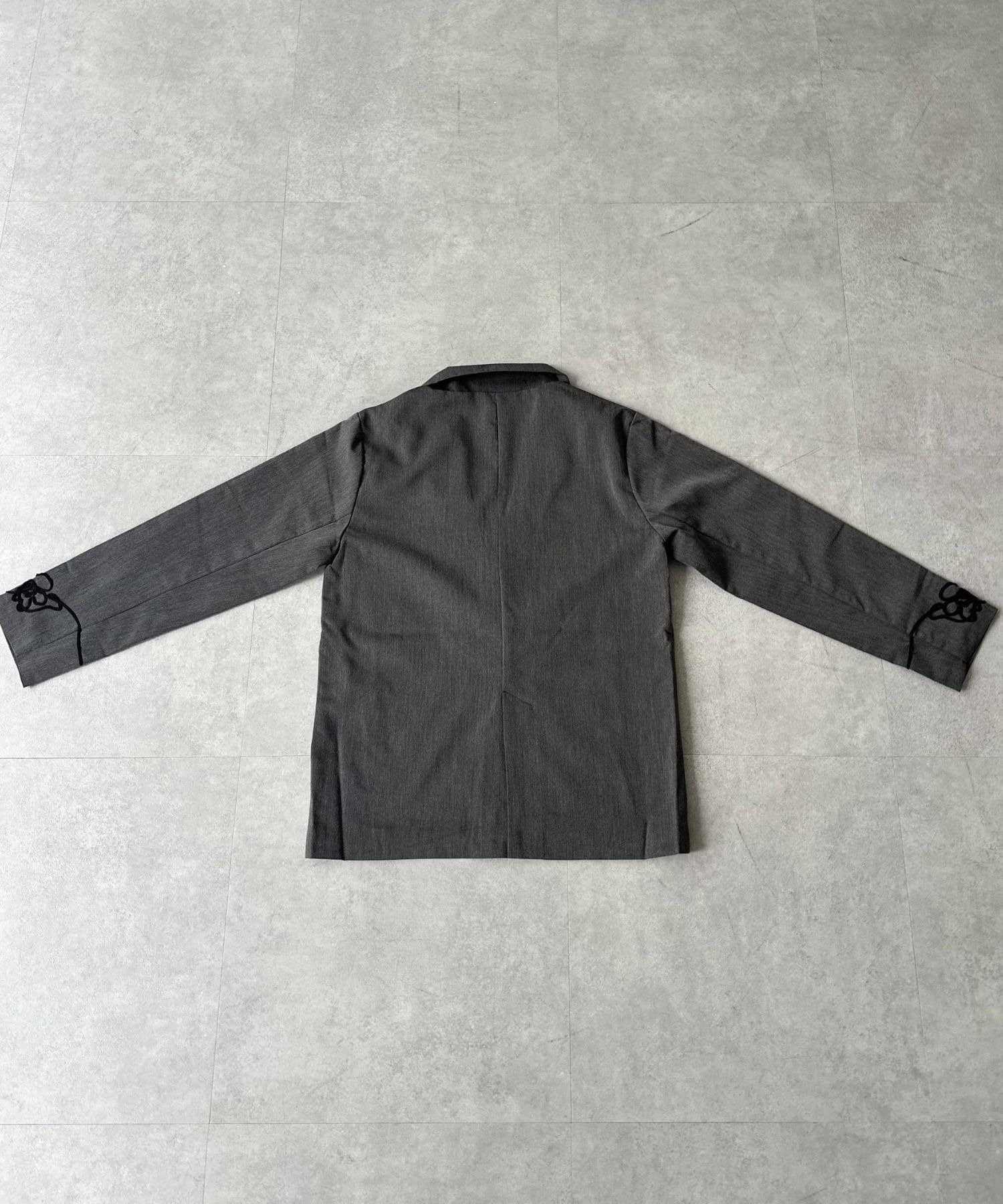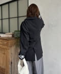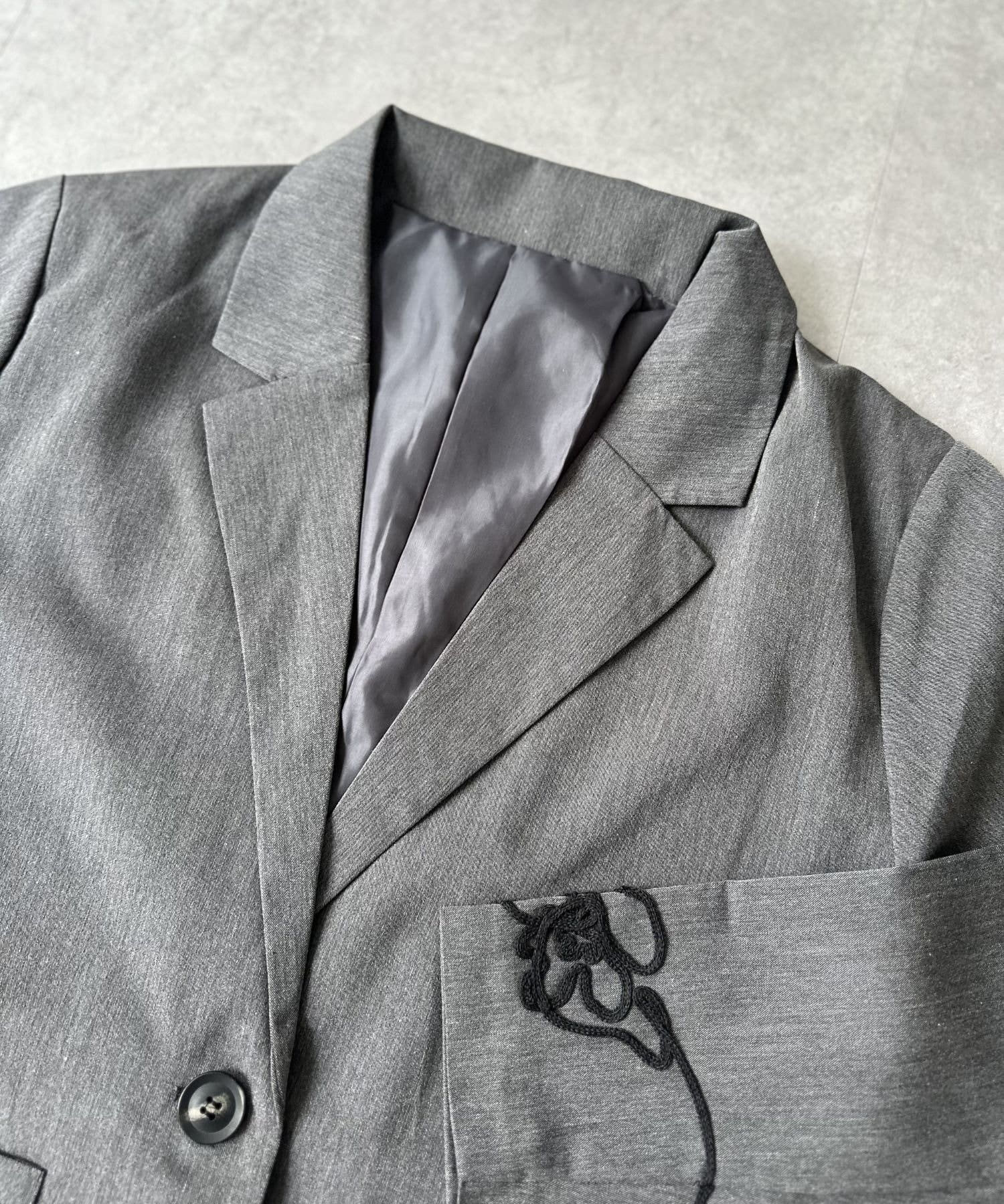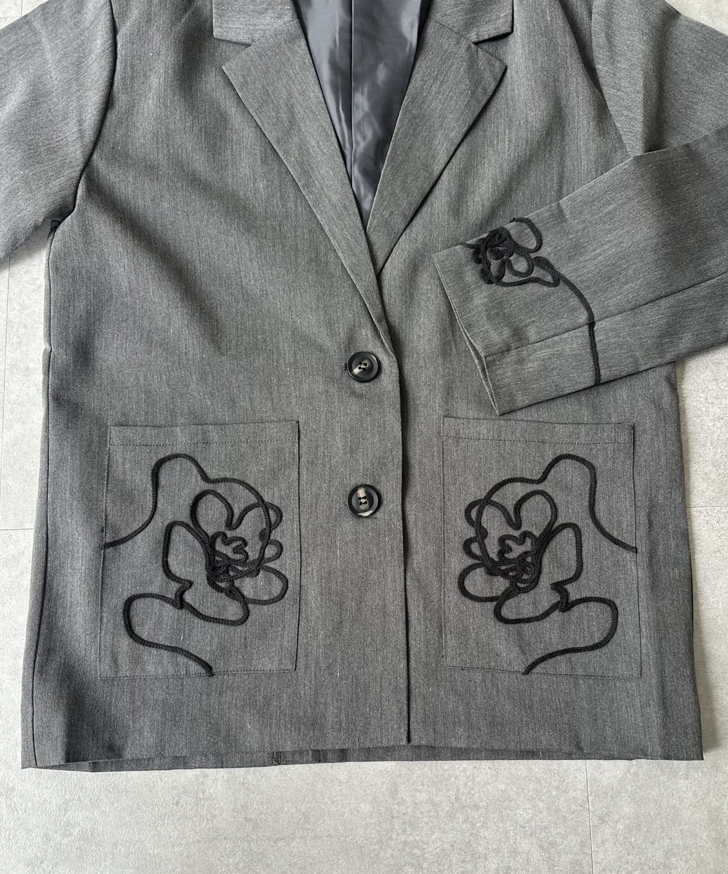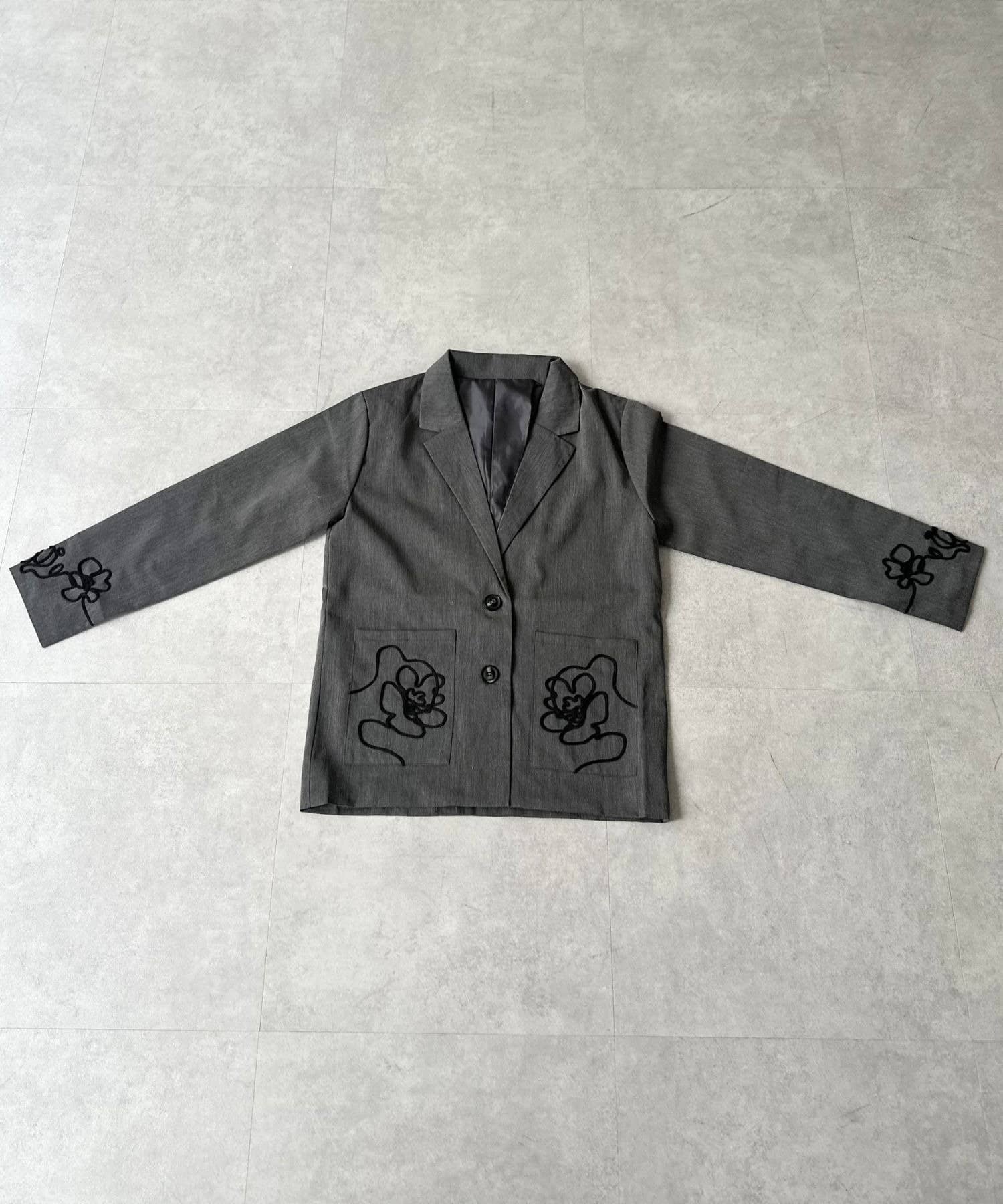 立体的で存在感のあるフラワーモチーフのコード刺繍が、シンプルなジャケットにモードなエッセンスをプラス。
