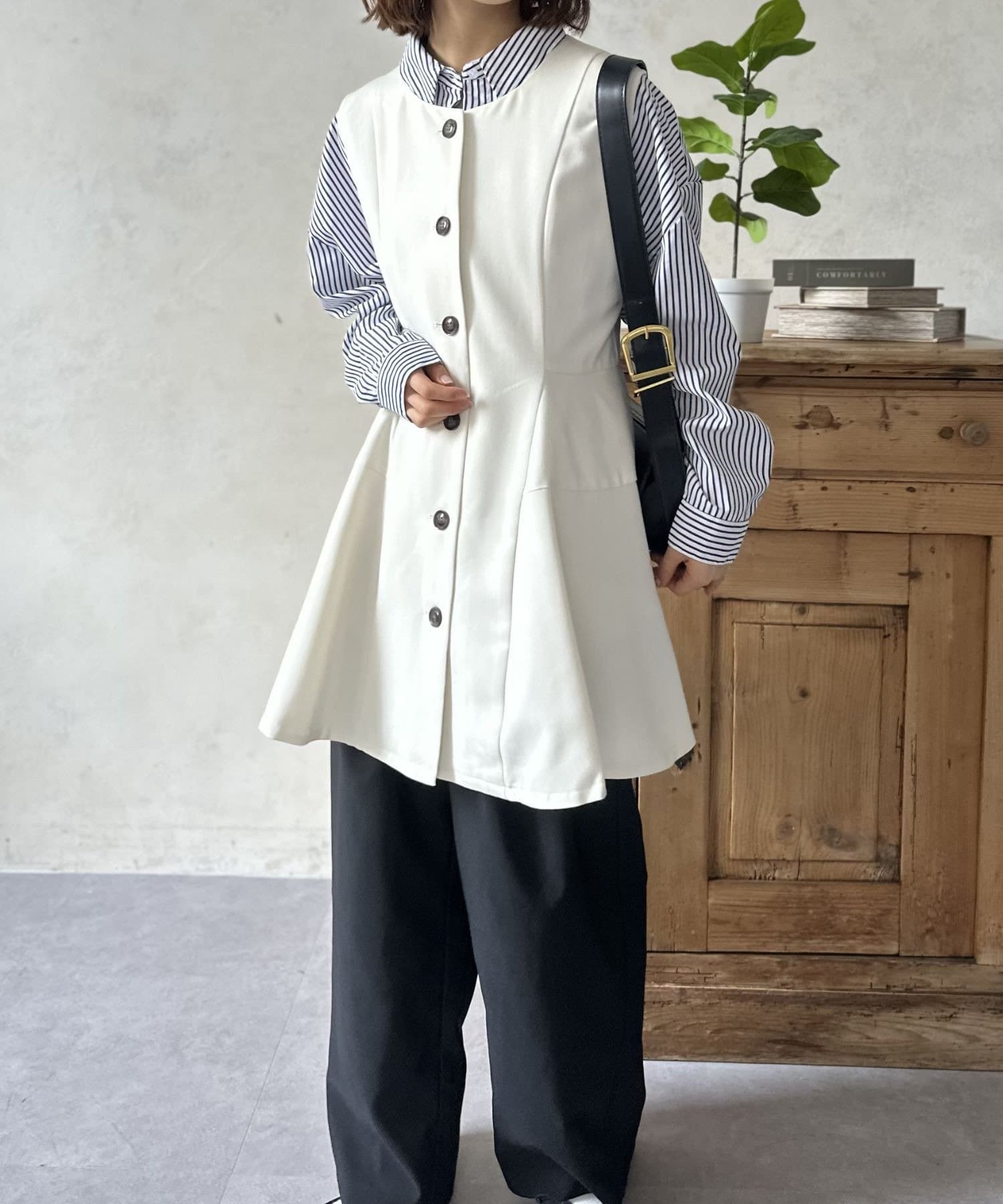 前のボタンをいくつか開けて襟を抜いて着こなせば、さらにトレンド感のある着こなしが楽しめます。