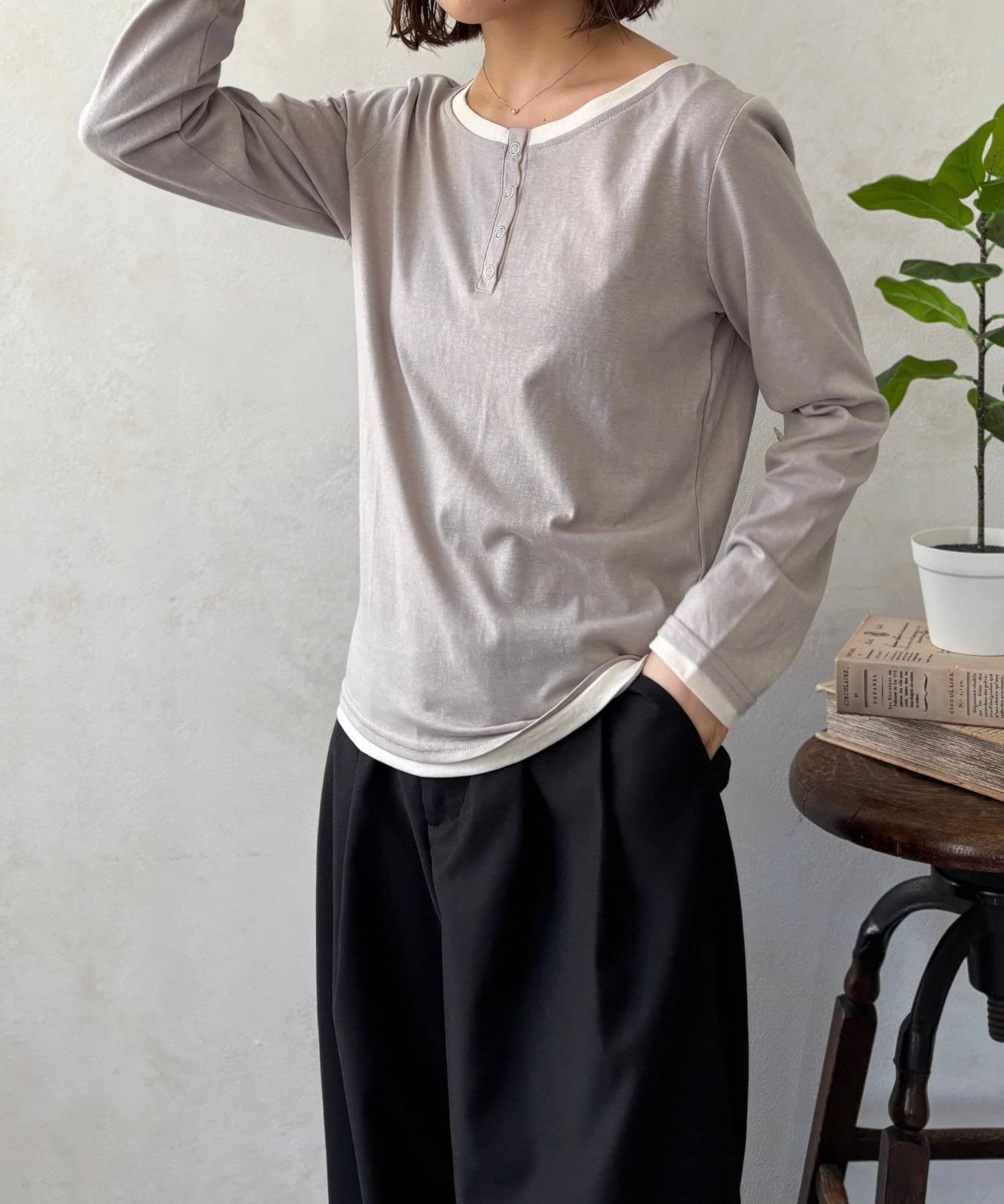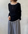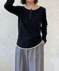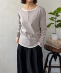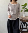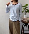 首元は程よい開き具合のヘンリーネックデザインで、ボタンの留め方次第でがらりと印象を変えることができます。