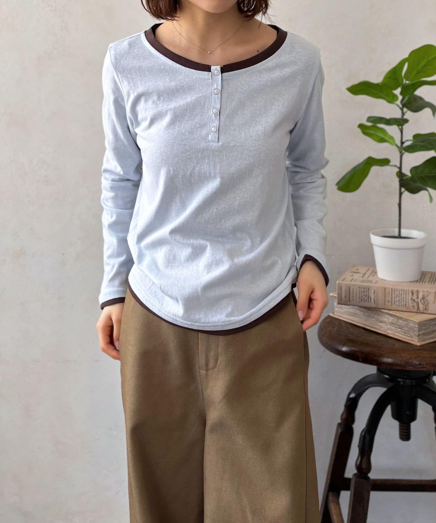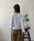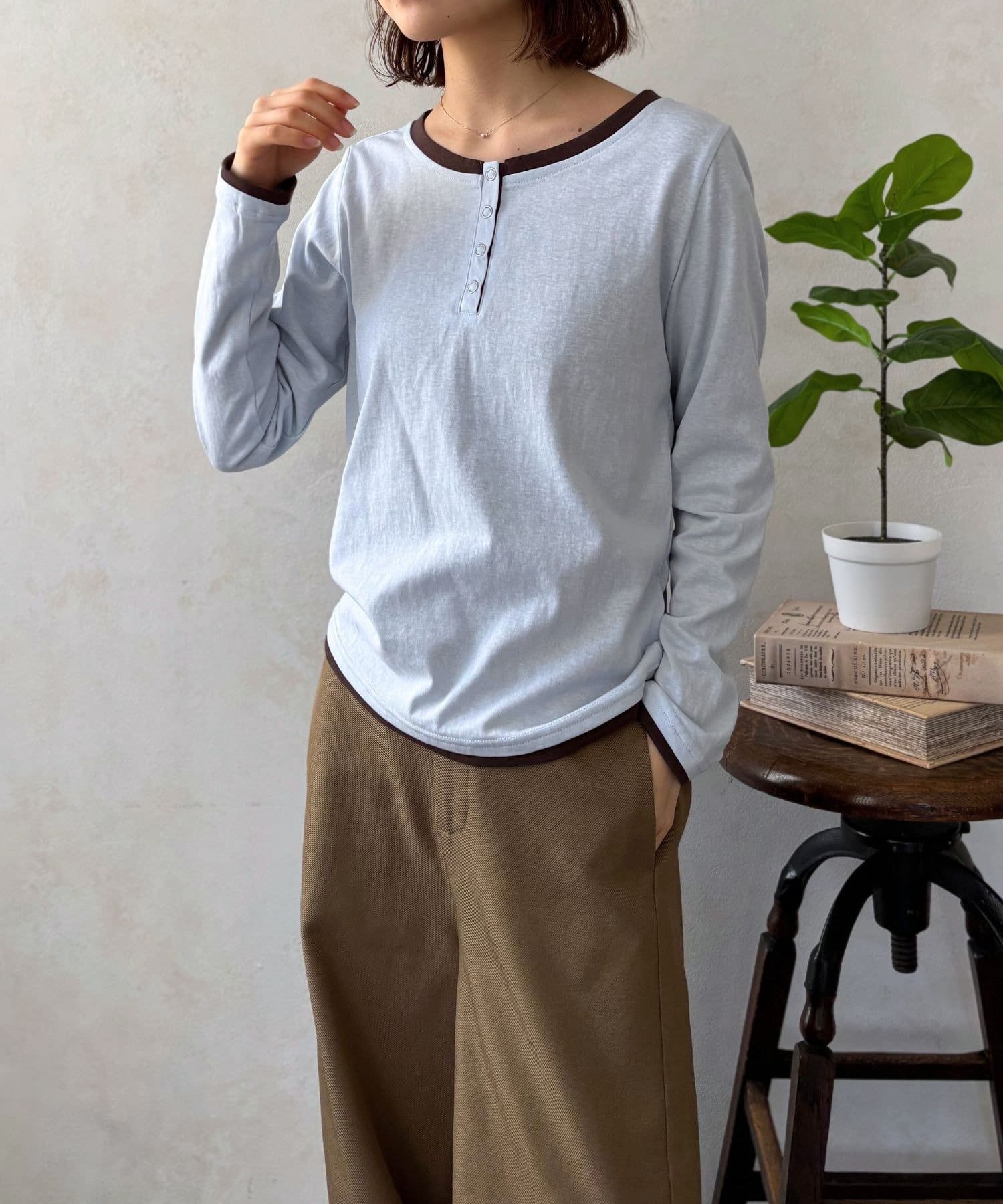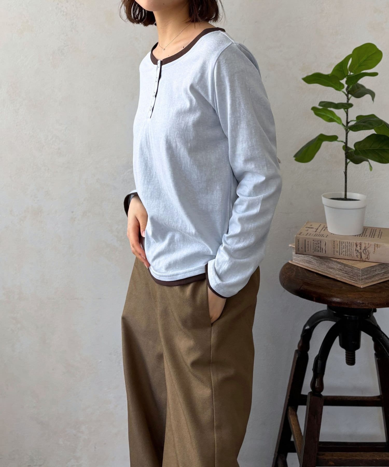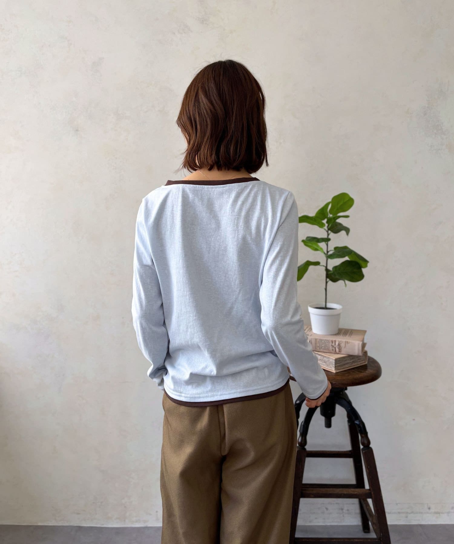 首元、袖口、そして裾からちらりとのぞく配色カラーが、シンプルなカットソースタイルにトレンド感とこなれ感をプラスしてくれます。