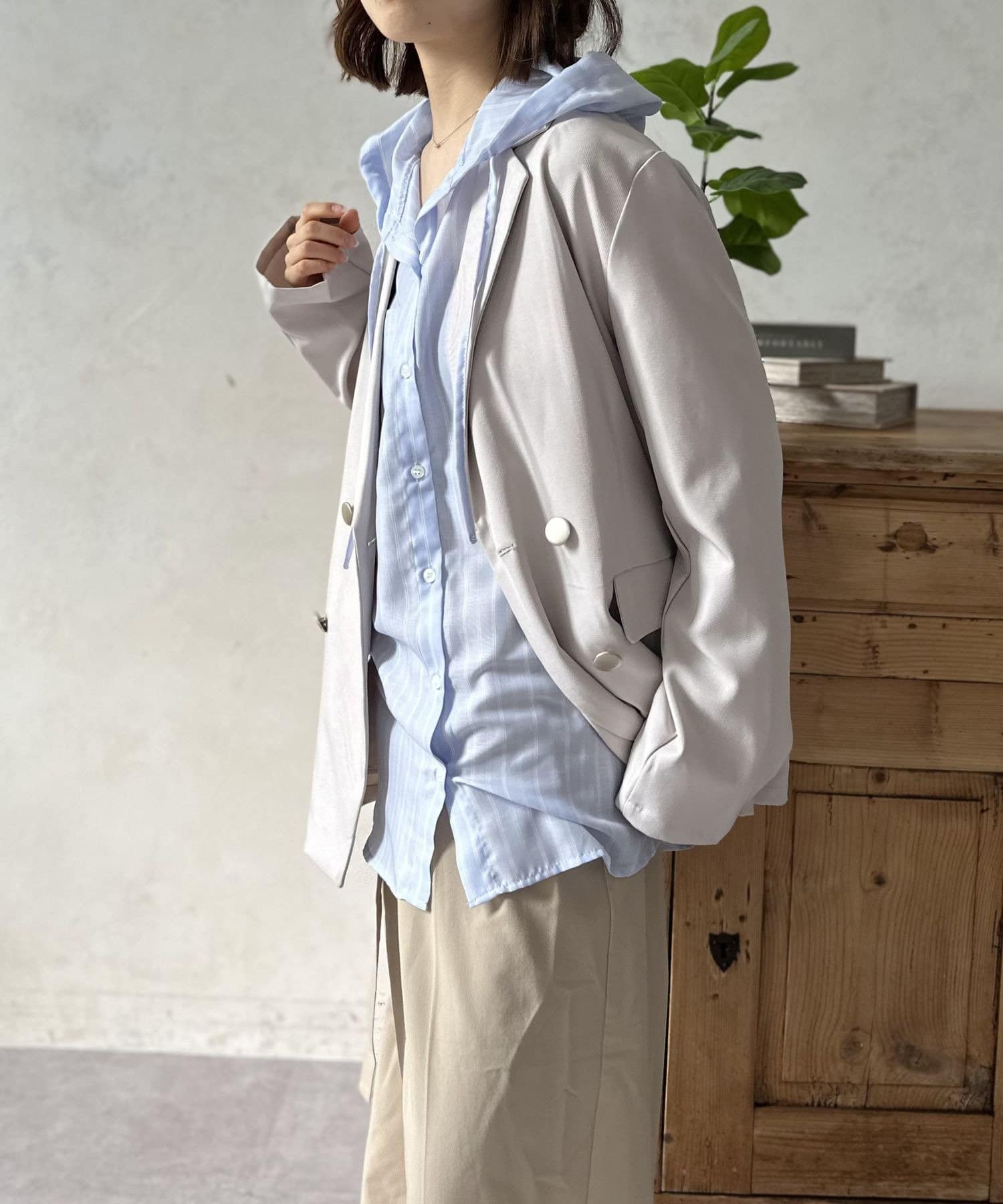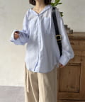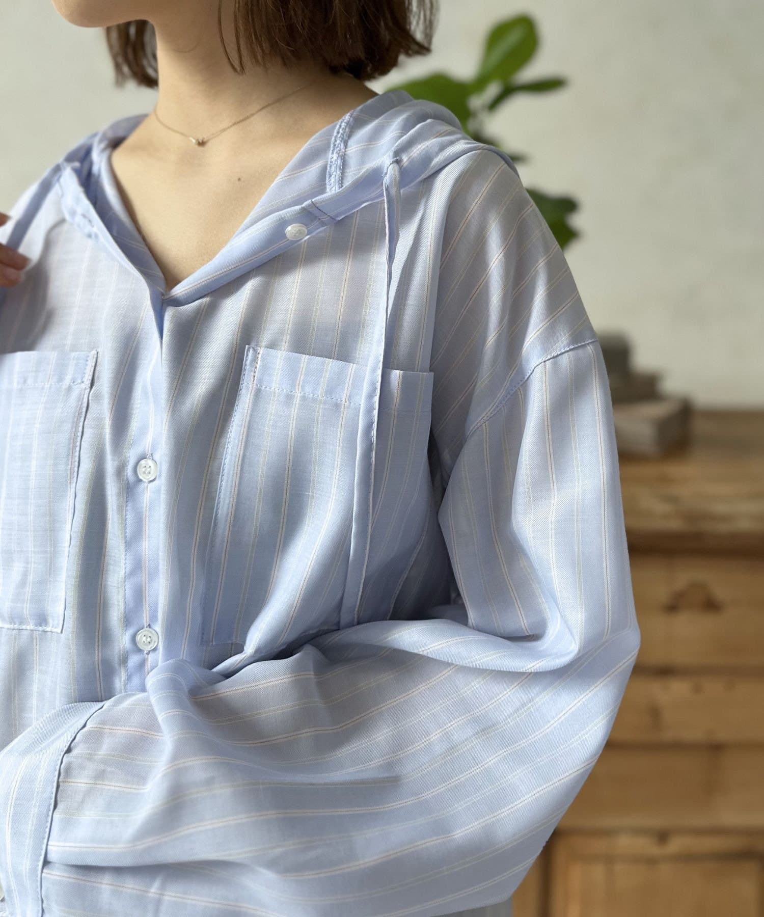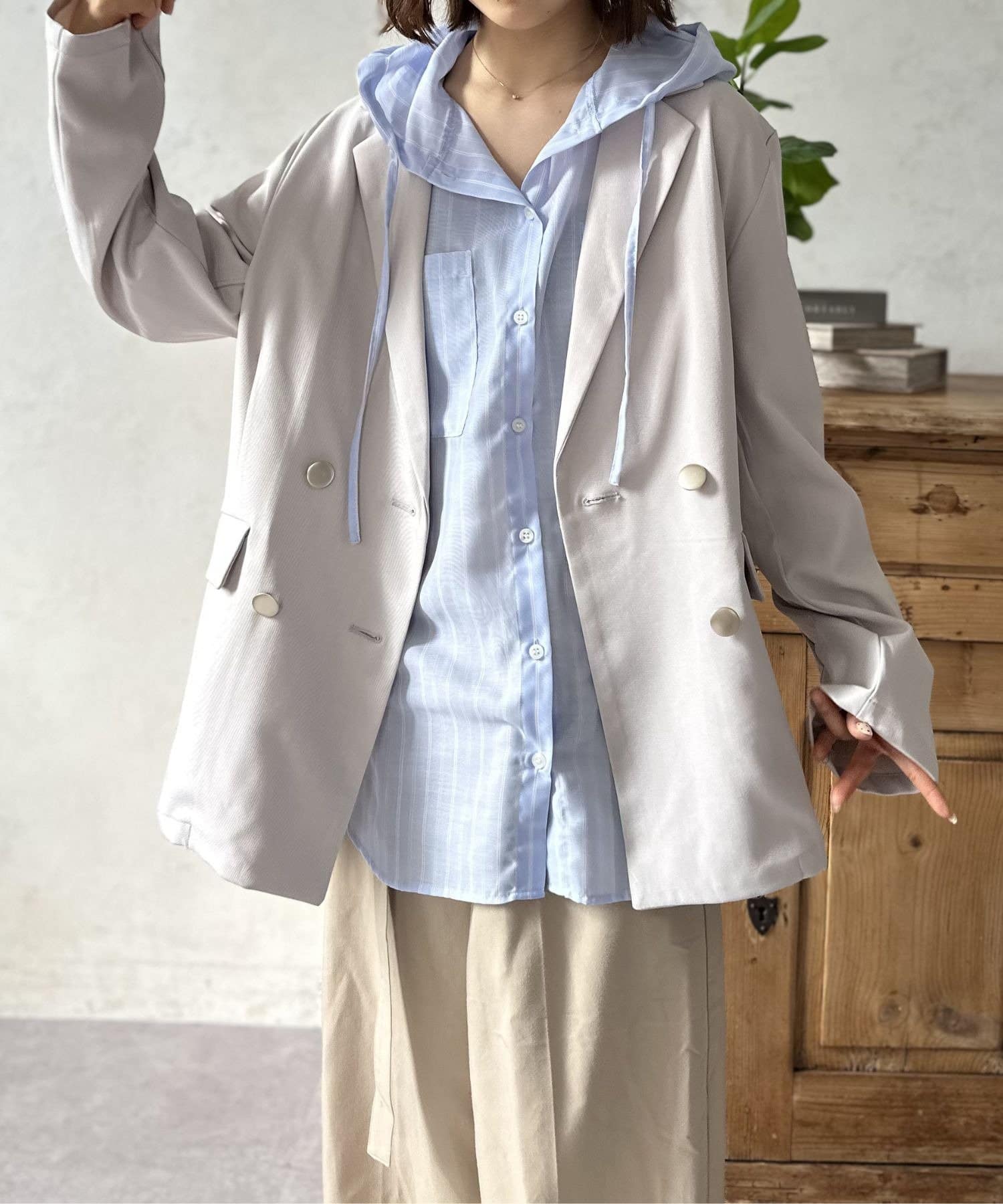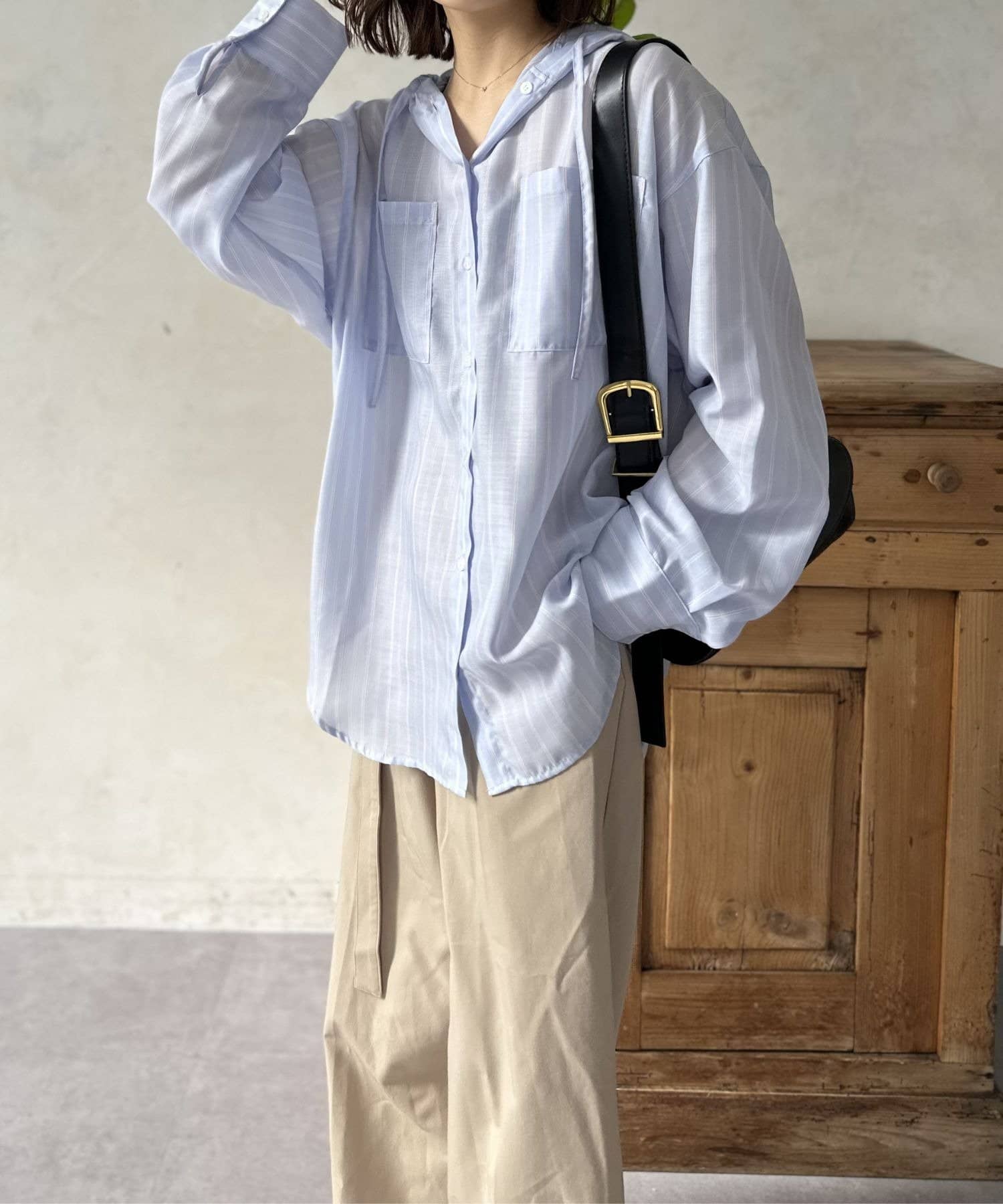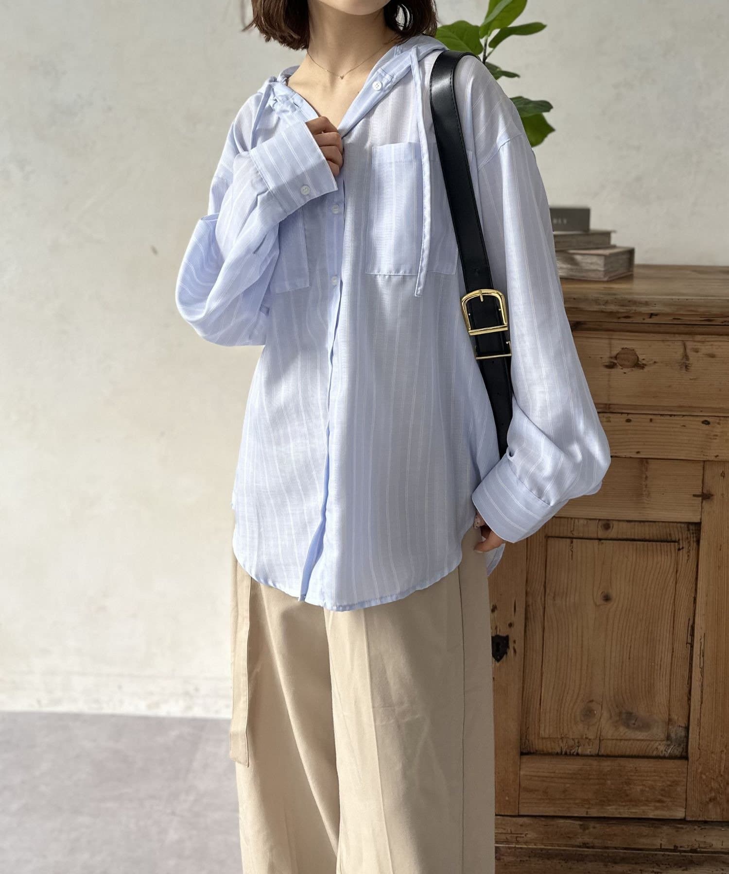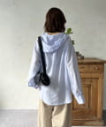 きれいめなシャツにフードをドッキングすることで、程よいカジュアルダウンが叶い、こなれた雰囲気を演出します。