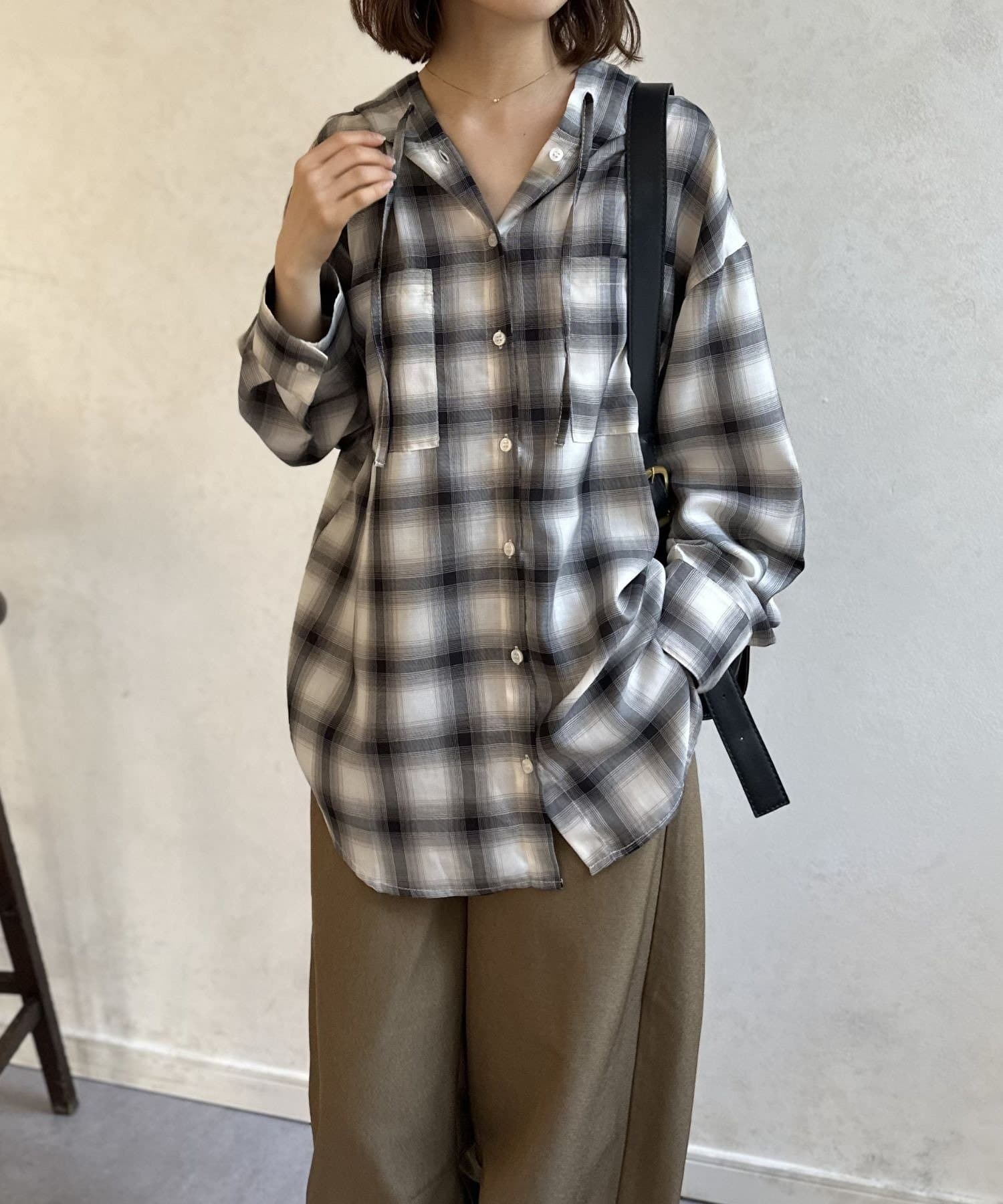 トレンドのシアー素材と定番チェック柄を掛け合わせた、主役級のフードチェックロングシャツ