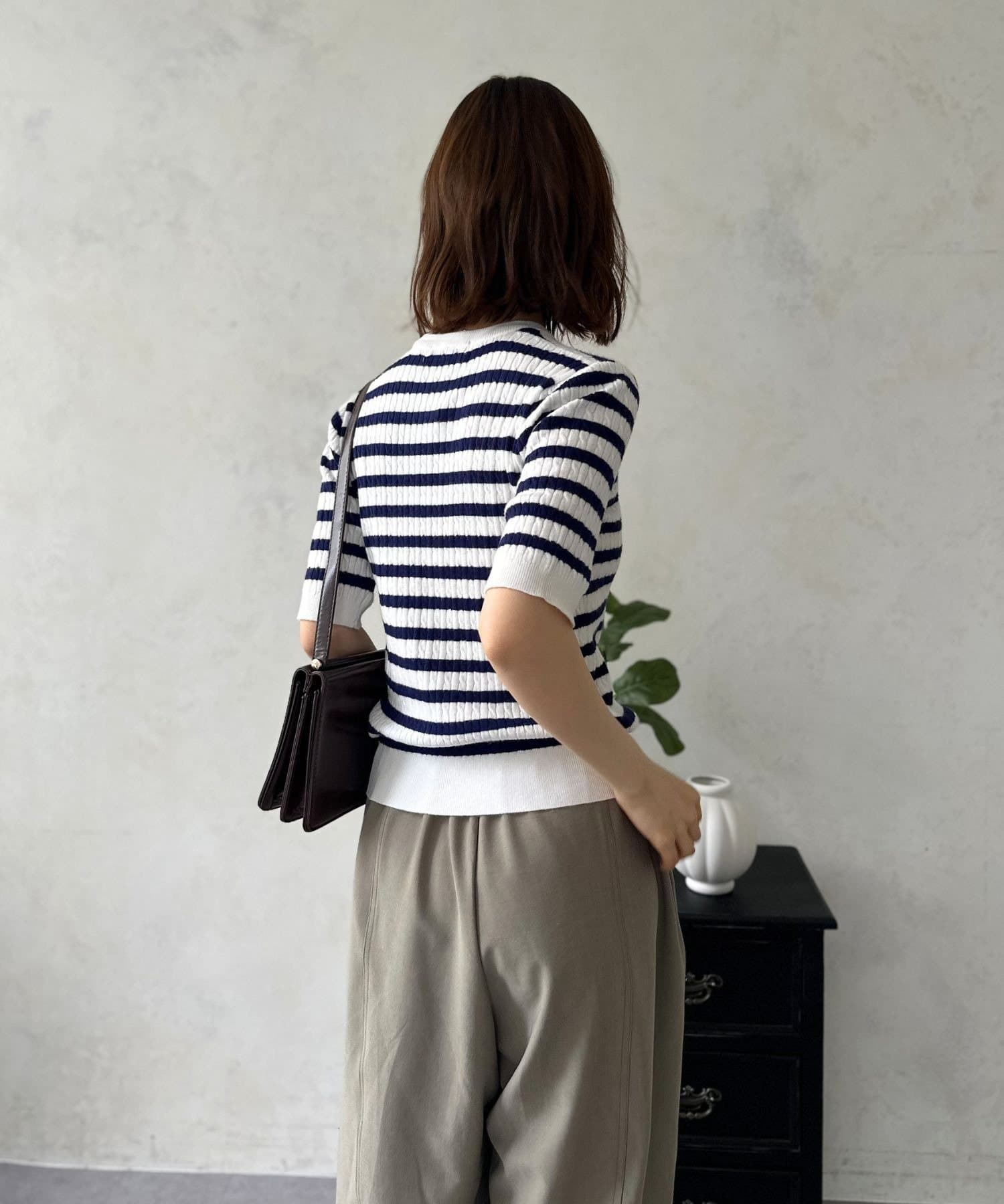 詰まりすぎないクルーネックは、顔周りをシャープに見せ、ネックレスなどのアクセサリーとの相性も抜群です。