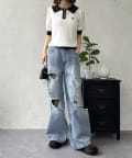 コンパクトな着丈なので、トレンドのハイウエストボトムスとの相性も抜群です。タックインしてもウエスト周りがもたつかず、すっきりとした印象で着こなせます。