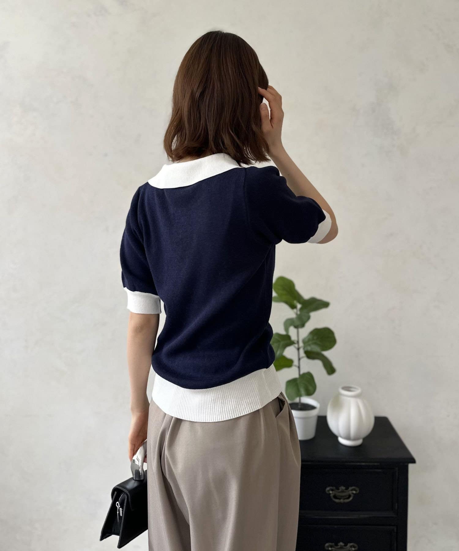顔周りをキリっと引き締め、小顔効果も期待できるバイカラーの襟元。クラシカルなポロシャツのデザインを、旬のムードにアップデートしてくれます。