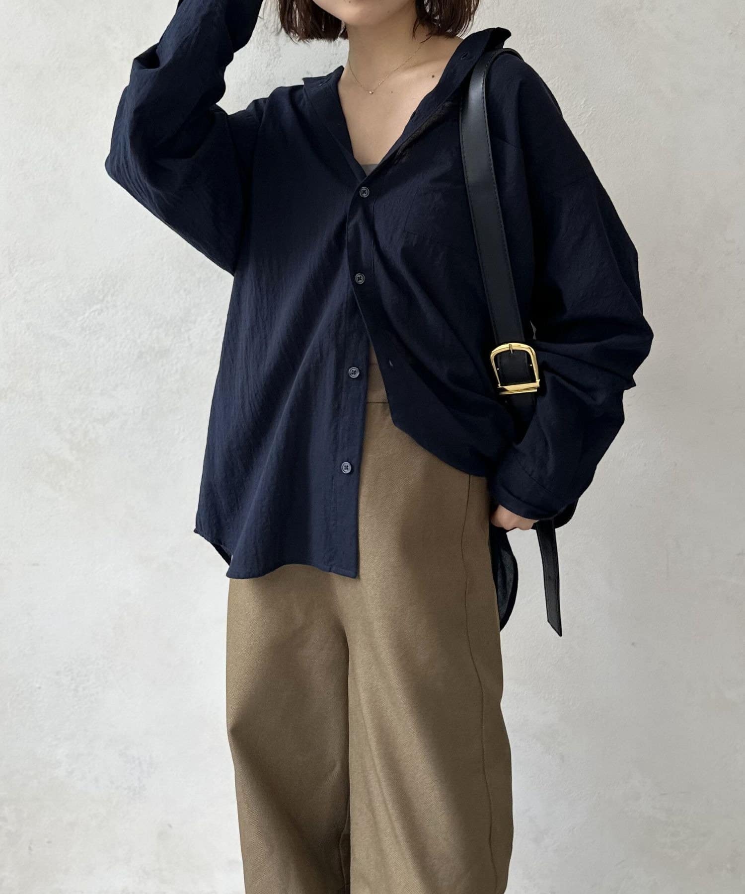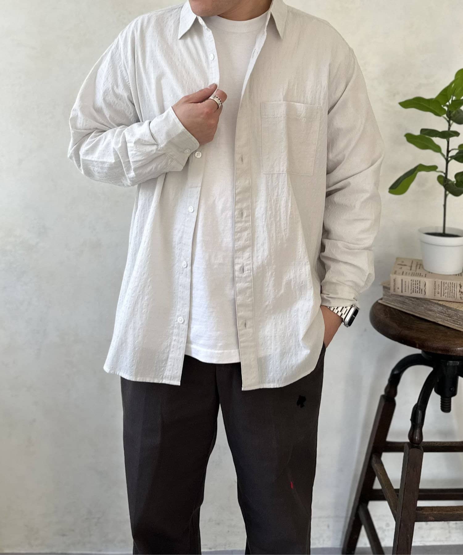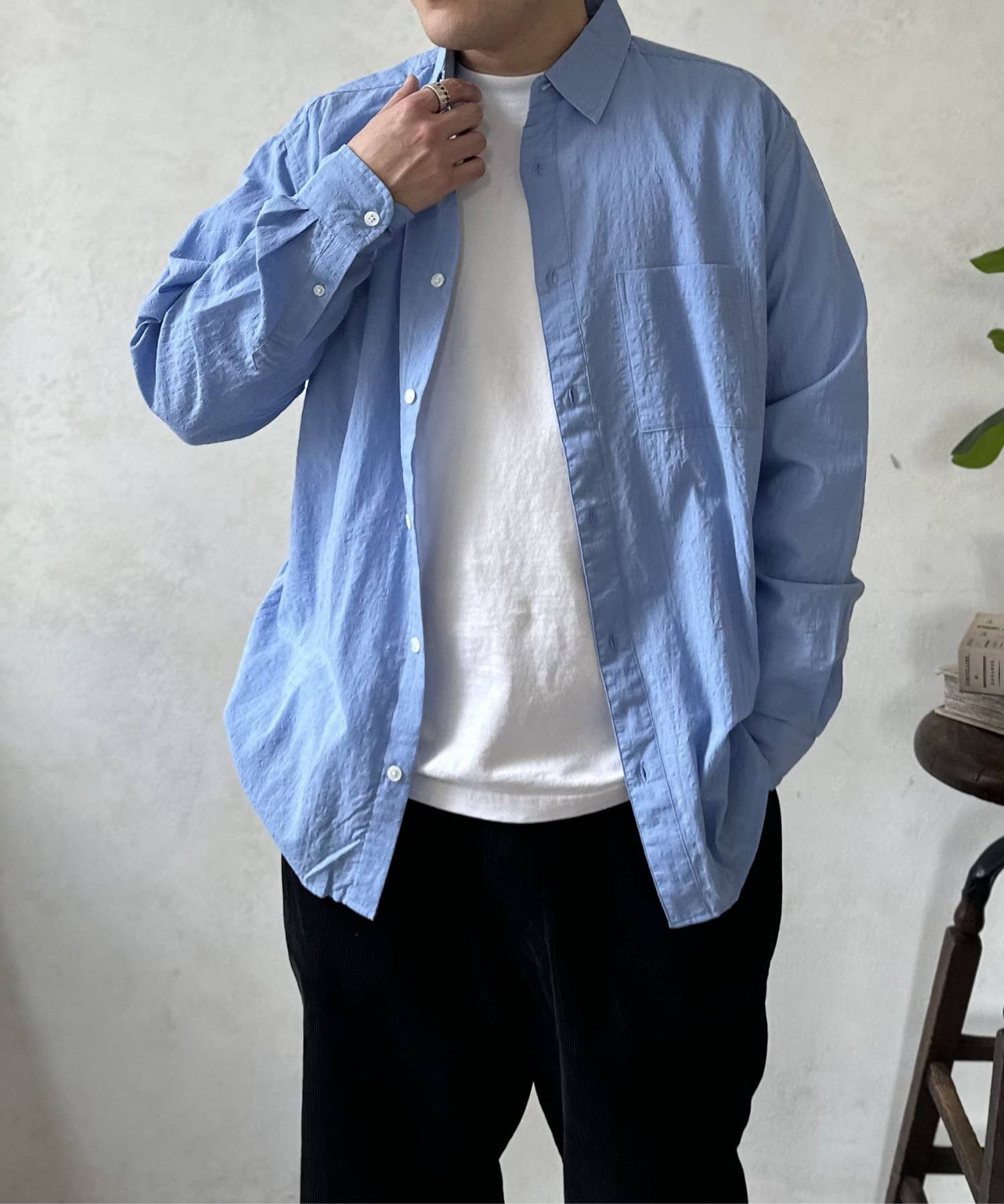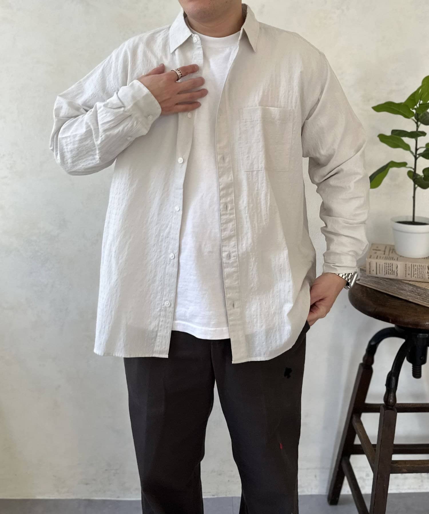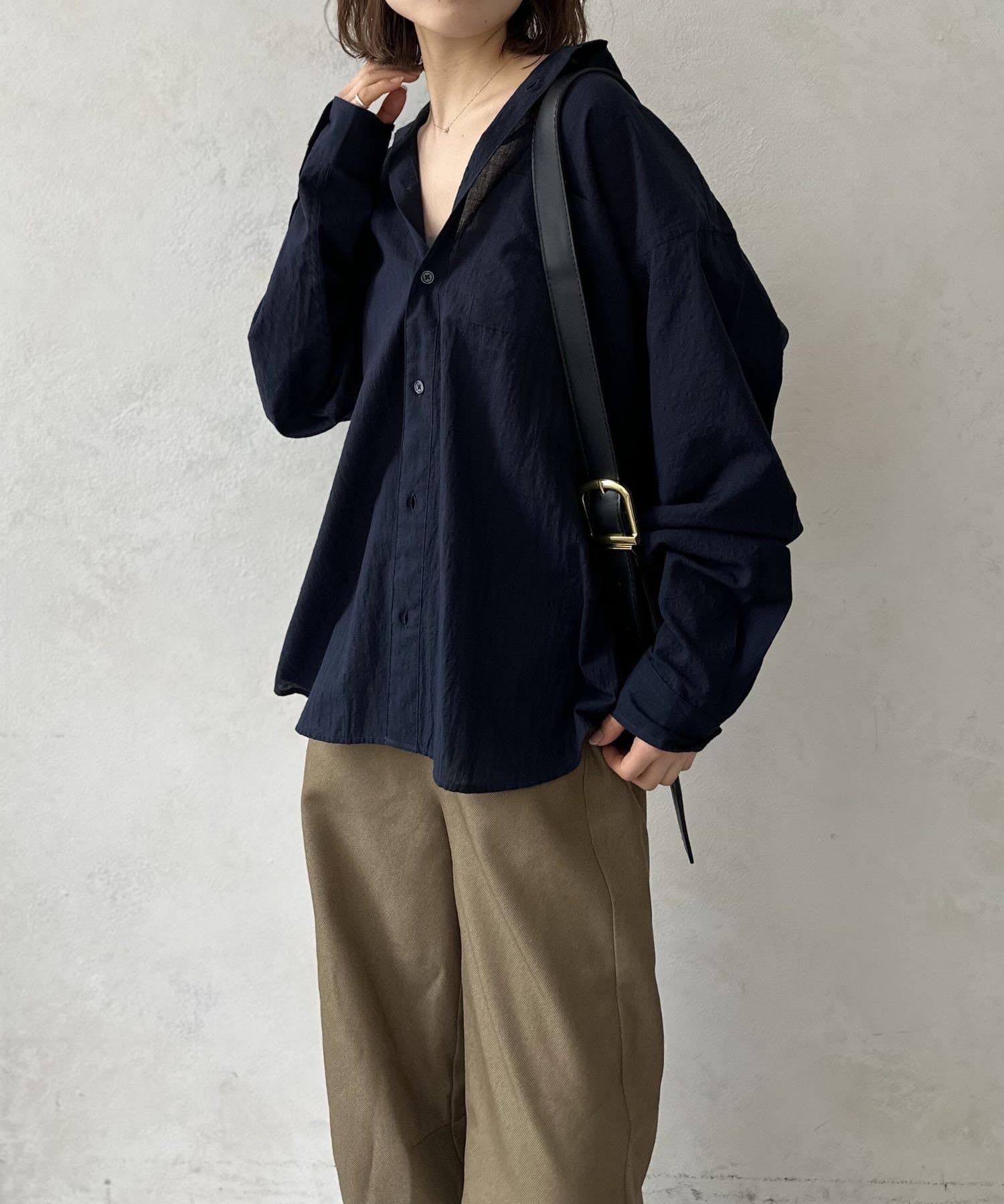 白Tにこのエアリーシャツを重ねるだけで、一気にオシャレ見えするので一枚持っていて間違いないアイテムです◎