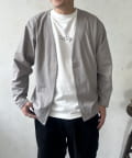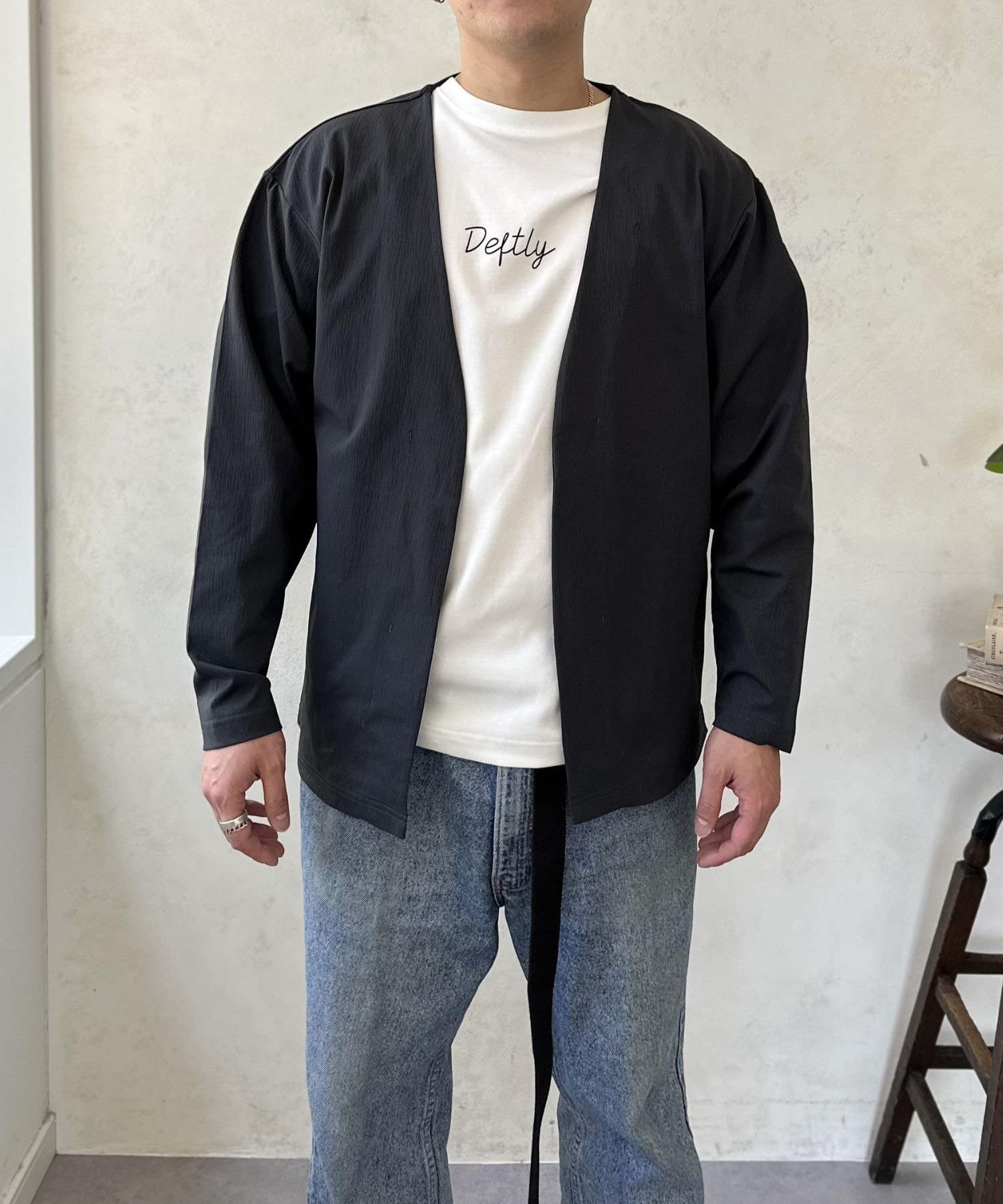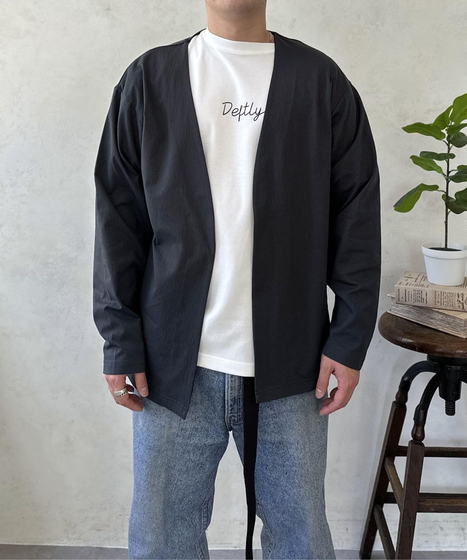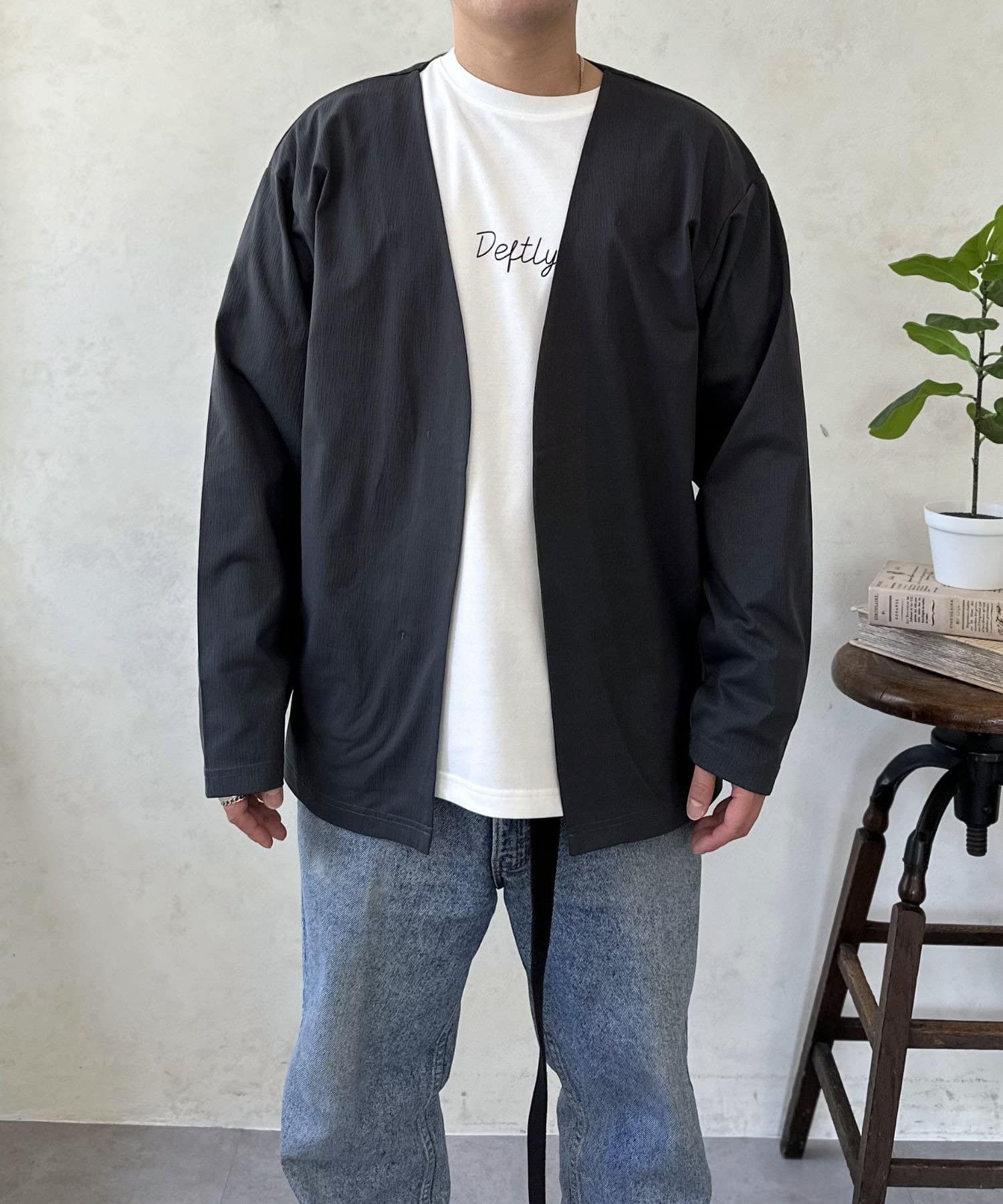 春先の羽織りとしてはもちろん、夏の冷房対策や秋口まで、ロングシーズン活躍してくれる頼れる一着です。襟のないすっきりとしたデザインなので、インナーを選ばず、どんなスタイルにもスマートに馴染みます。