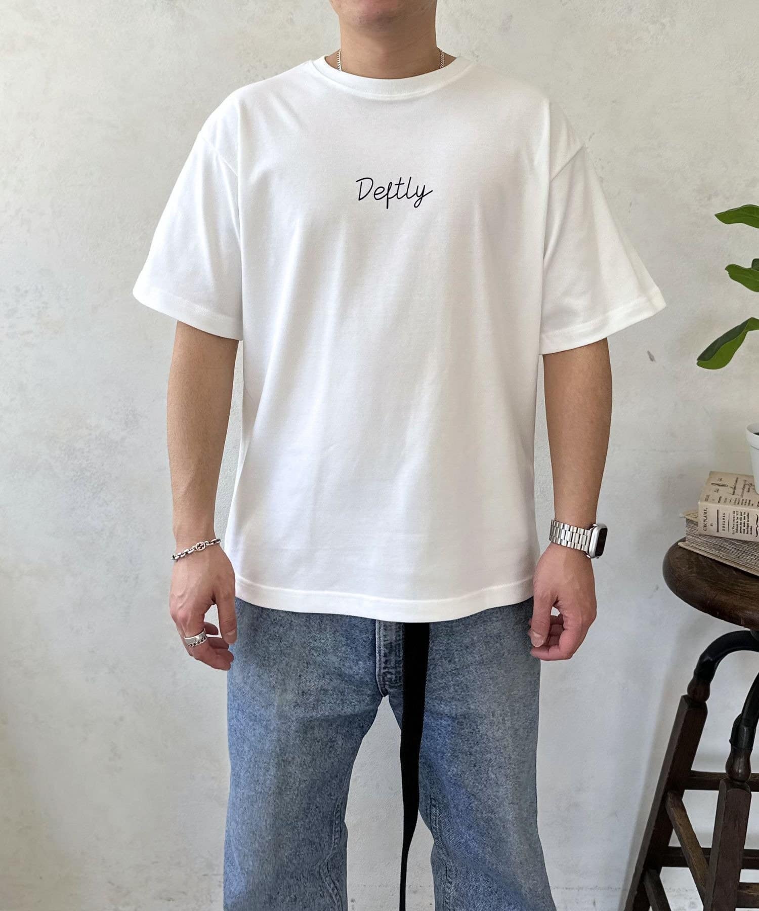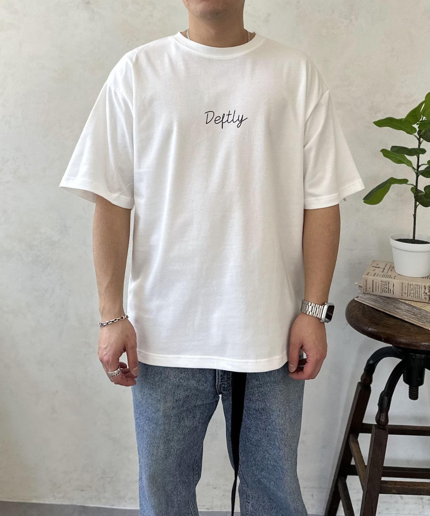 セットのTシャツは、胸元にさりげなくあしらわれた筆記体ロゴがアクセント。シンプルながらも一枚で着て様になるデザインは、夏の主役トップスとして大活躍します。