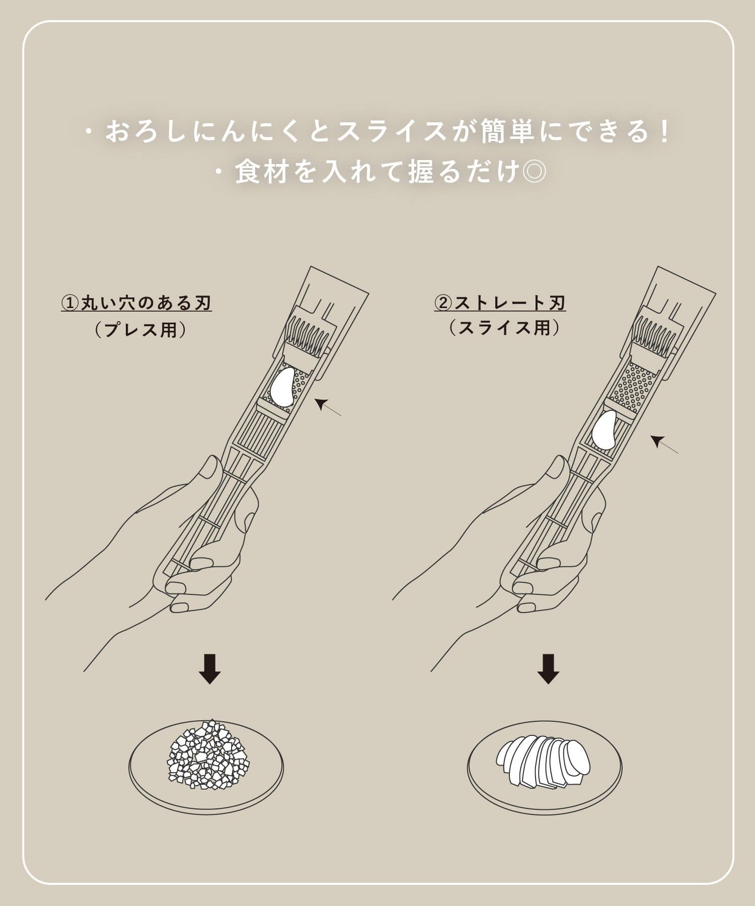 ●にんにくをセットして握るだけで簡単におろしにんにくとスライスが作れます。