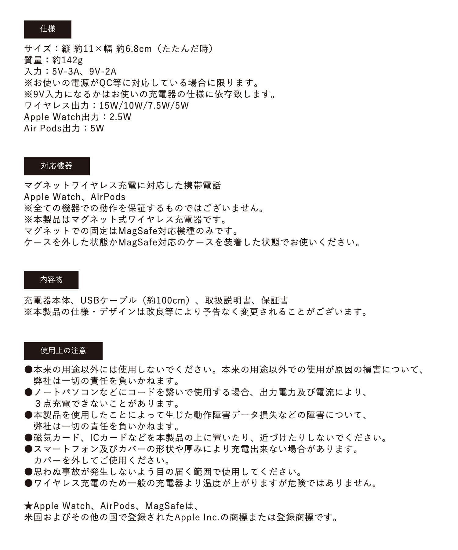 購入場所:パルクローゼット旅行に行くときにiPhone、Apple Watch、イヤフォン同時に充電できて、かつ折り畳みできるものを探していたのでこれだ!とすぐ購入しました。本当にちゃんと充電できるか不安でしたが、3つ同時に充電できました。イヤフォンはAirPodsではないものですが、対応していました。ポーチなど付いていたらさらによかったです。