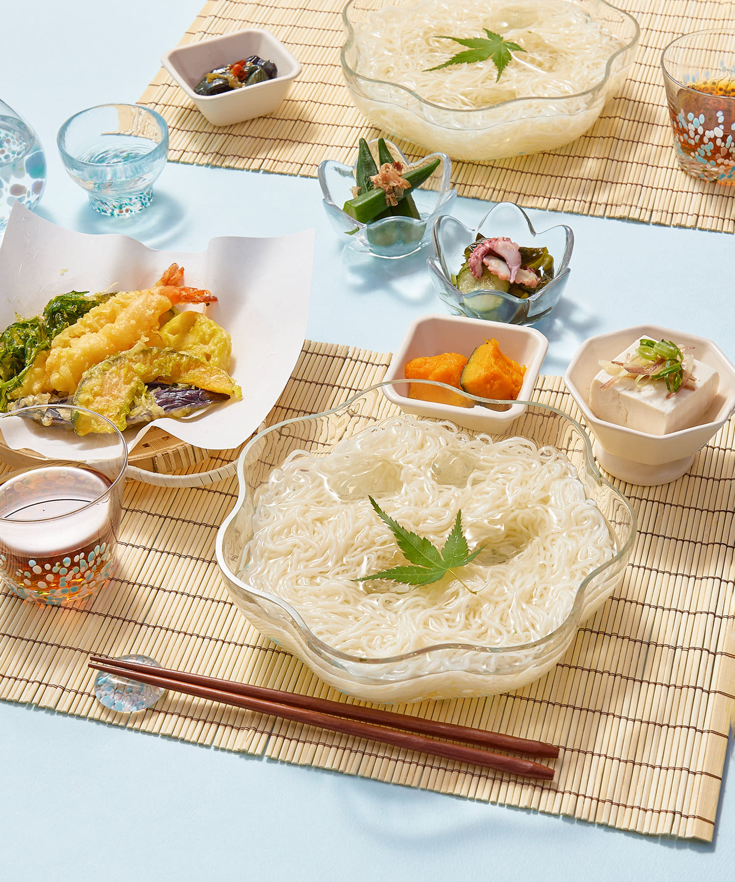 ●同シリーズで揃えて夏の料理を盛りつけると、より爽やかな食卓になります。
