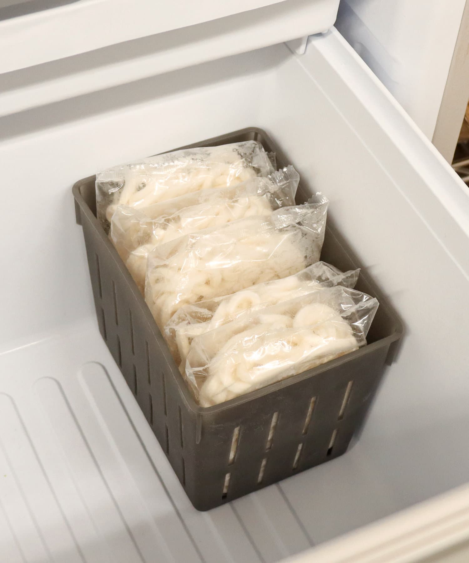●冷凍食品や冷凍うどんなどの収納に便利な冷凍庫用の収納ボックス。