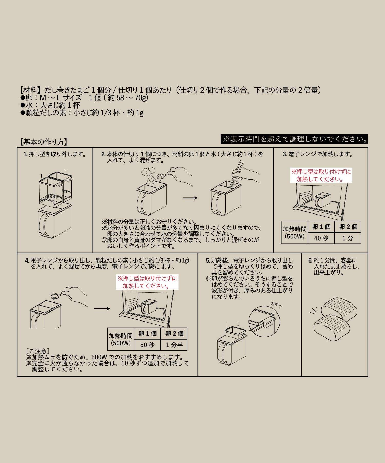 ●加熱後、本体を取り出す際や卵を混ぜる際はミトン等を使い、やけどにご注意ください。