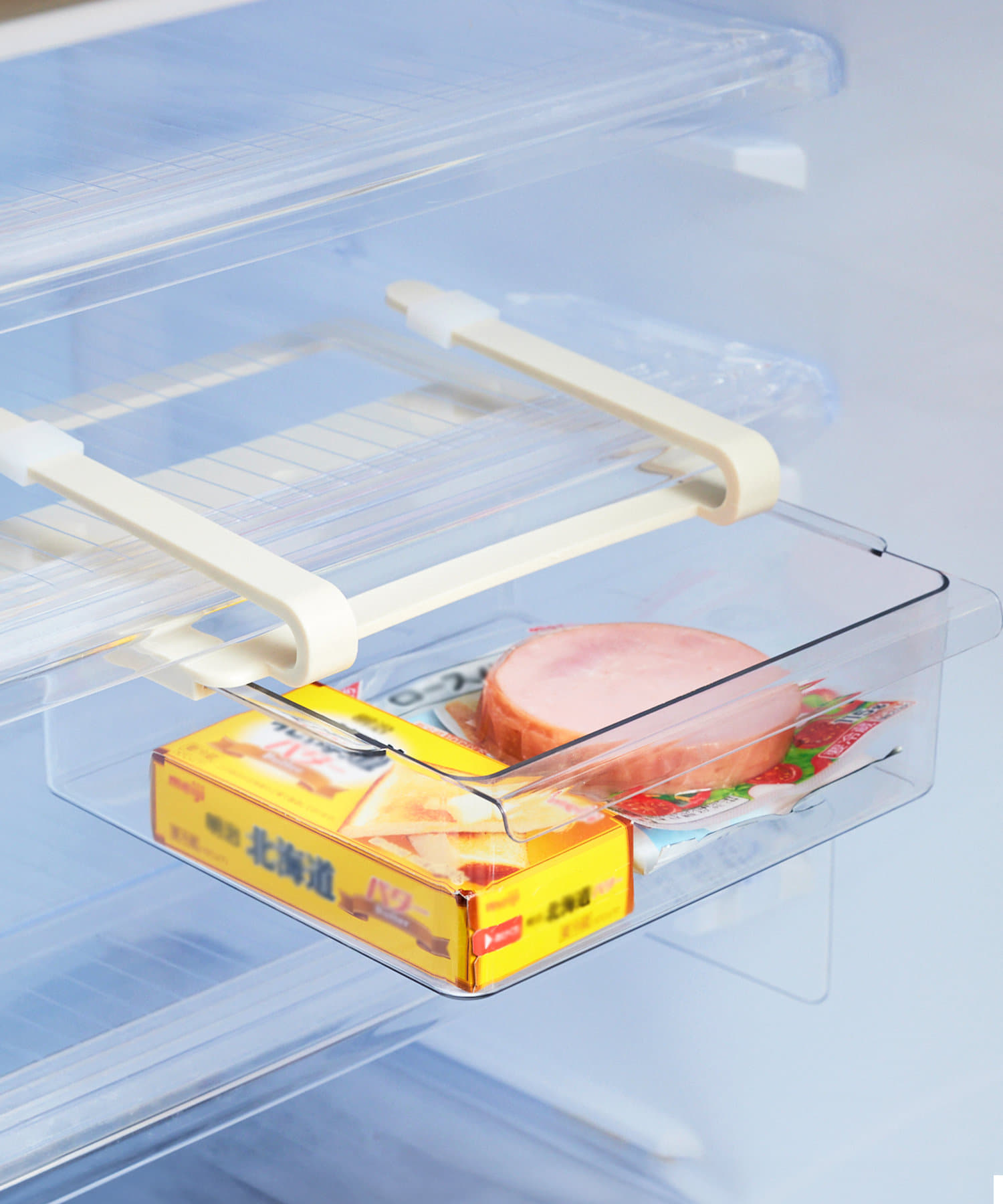 ●冷蔵庫の棚下スペースを有効活用できる収納トレイ。