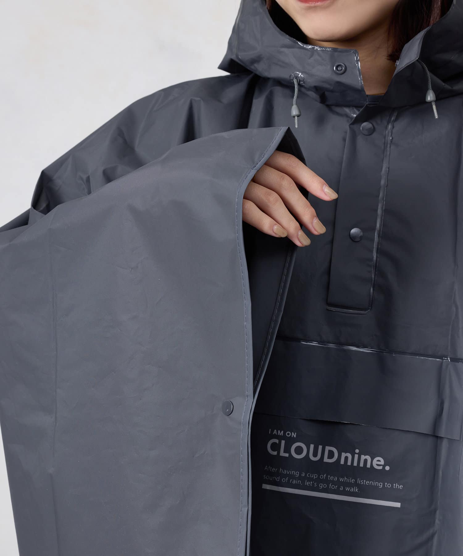 ●落ち着いた色味で大きめのサイズ感なので、男女兼用でお使いいただけるレインポンチョ。