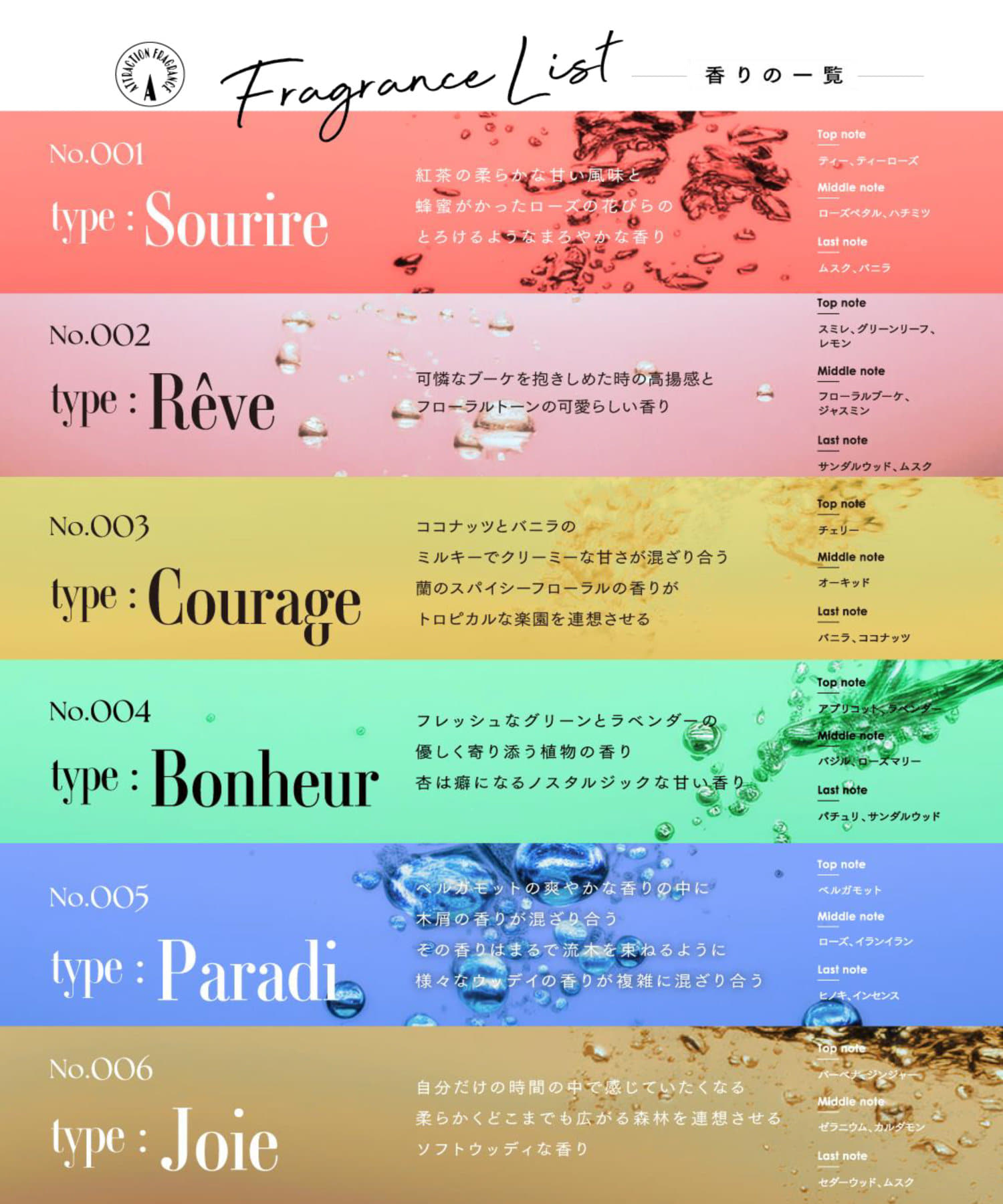 第3弾の香りは、1弾・2弾で販売した香りの中から、それぞれ2種類の香りをブレンドして1つの香りを作っています。