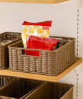 食器をそのままよりも取り出しやすく、ラタンと棚の雰囲気が合っていて、いい感じになりました。