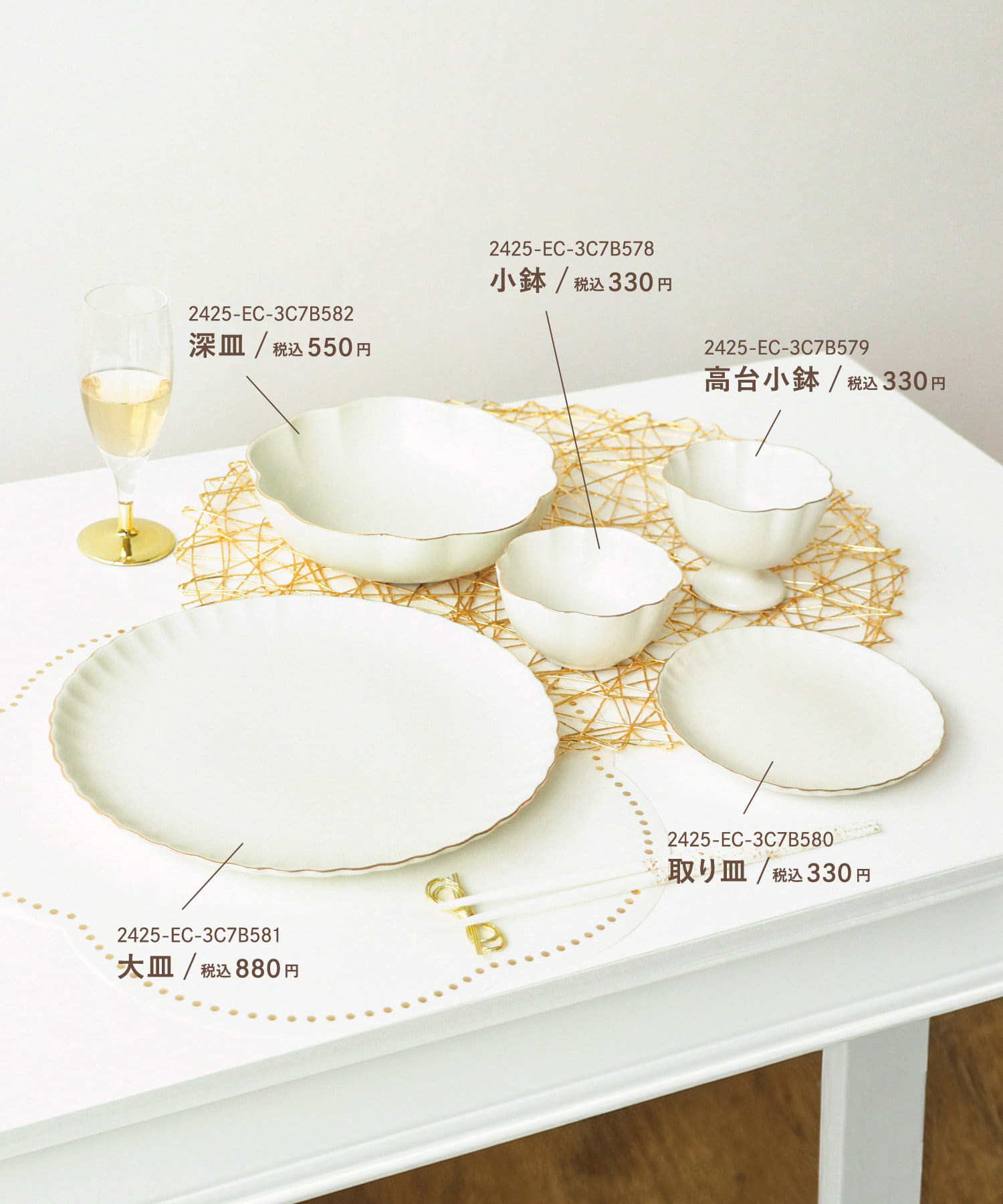 ●ホワイト×ゴールドの上品な配色で、お正月の食卓が特別感のある雰囲気に仕上がります。