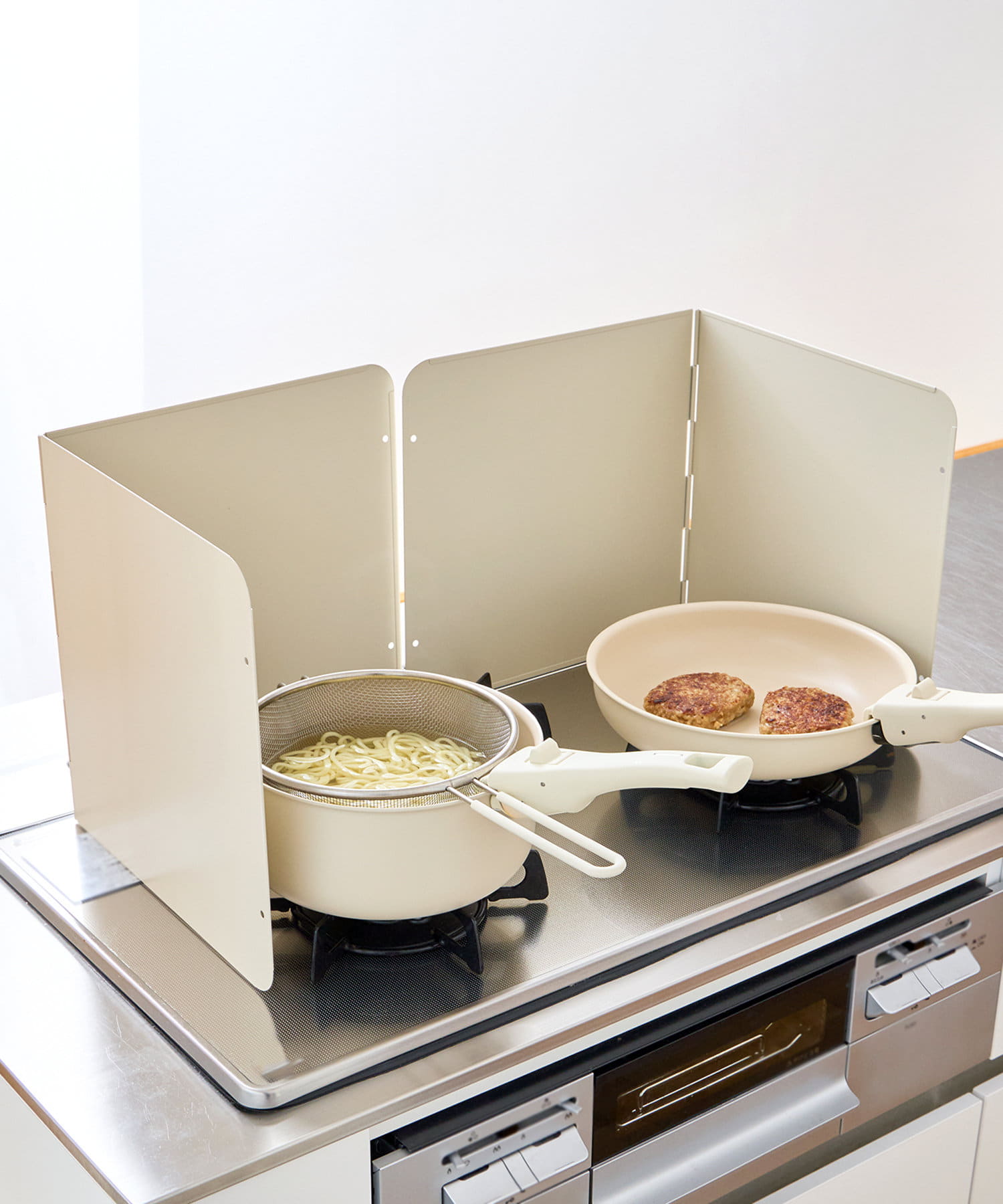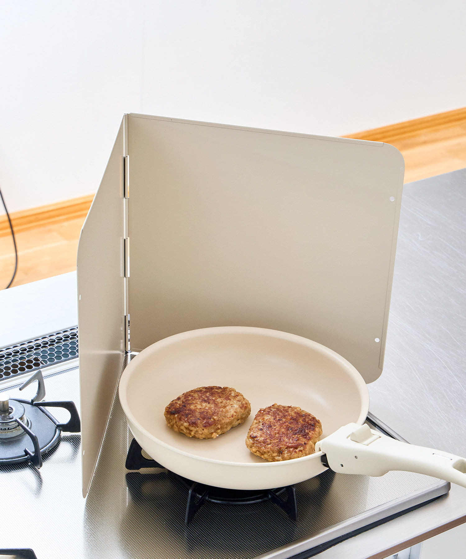 ●コンロにかけた鍋、フライパンなどの調理器具と本製品の間には必ず空間をあけて使用してください。近づけすぎると熱により変色する恐れがあります。
