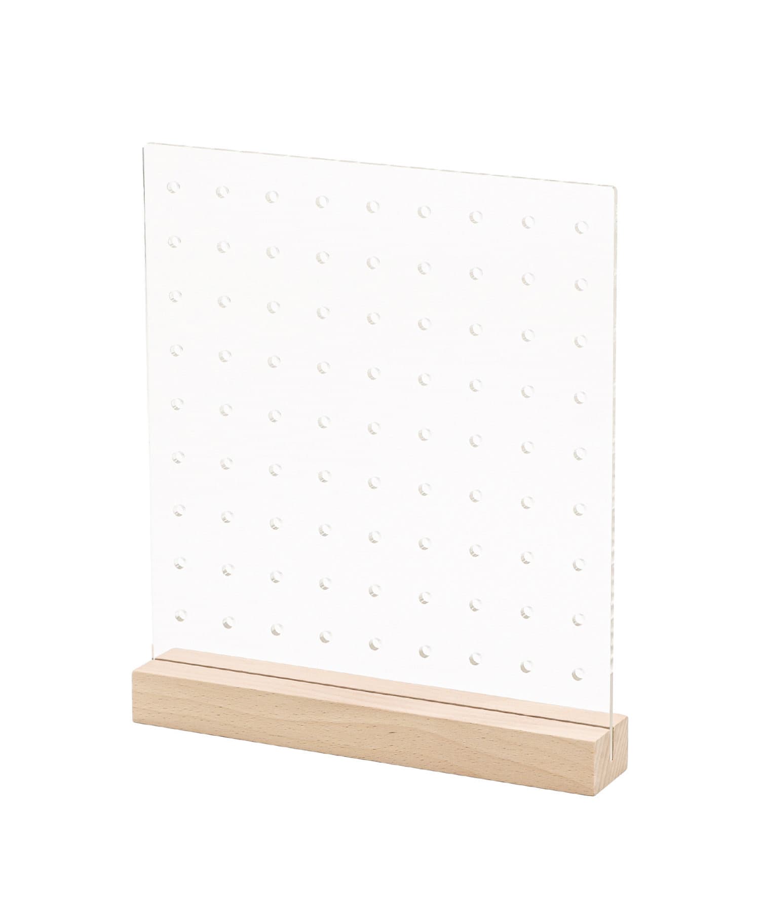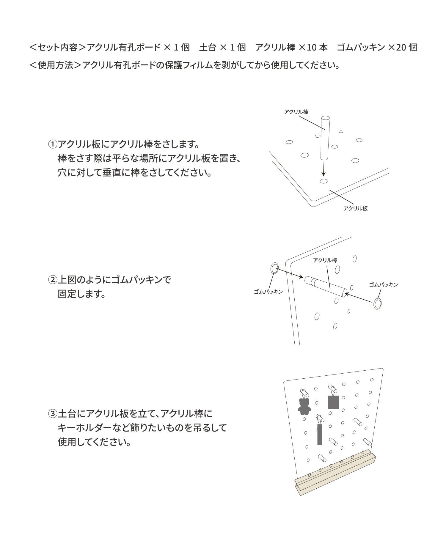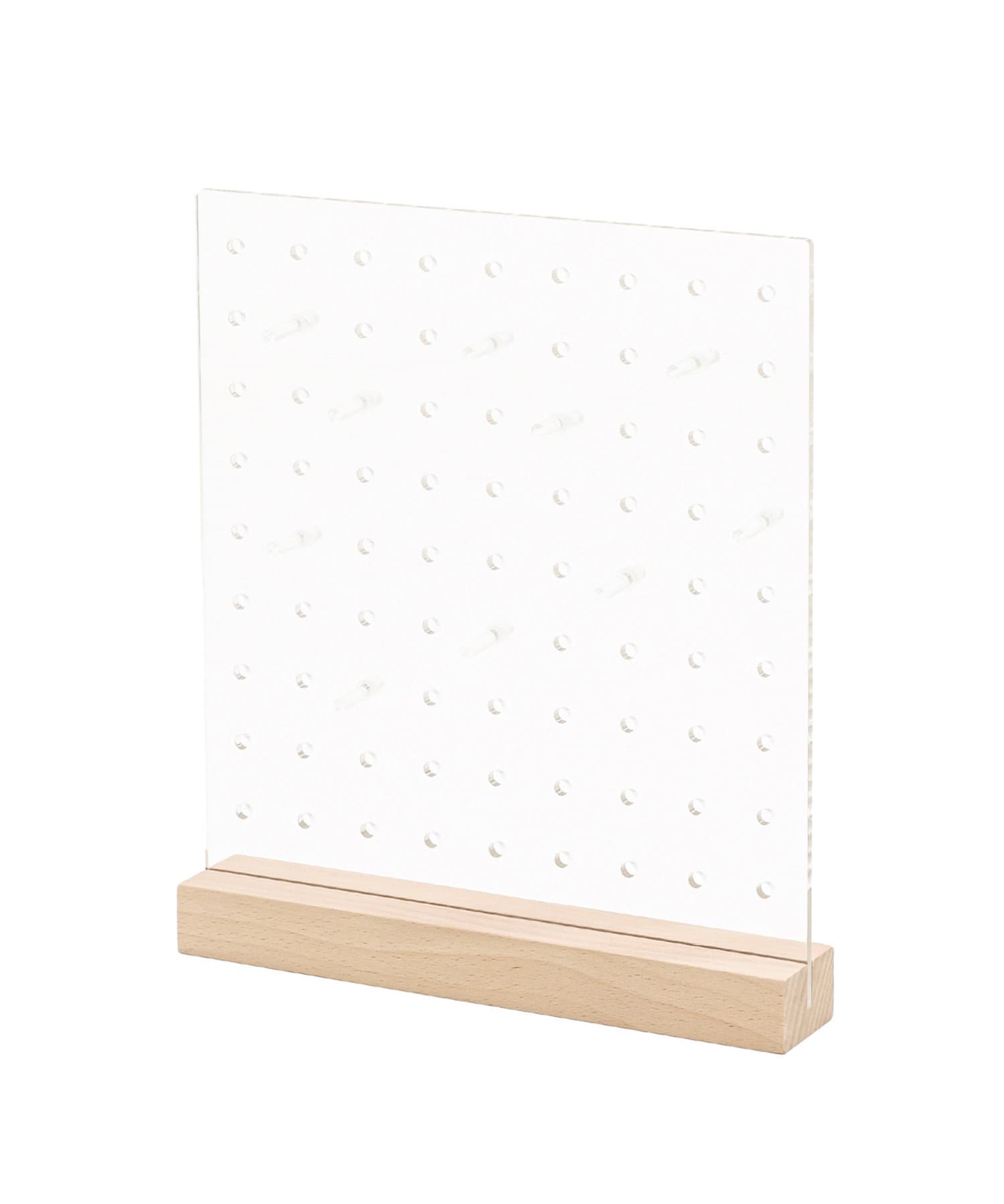 セット内容:アクリル有孔ボード×1個、土台×1個、アクリル棒×10本、ゴムパッキン×20個