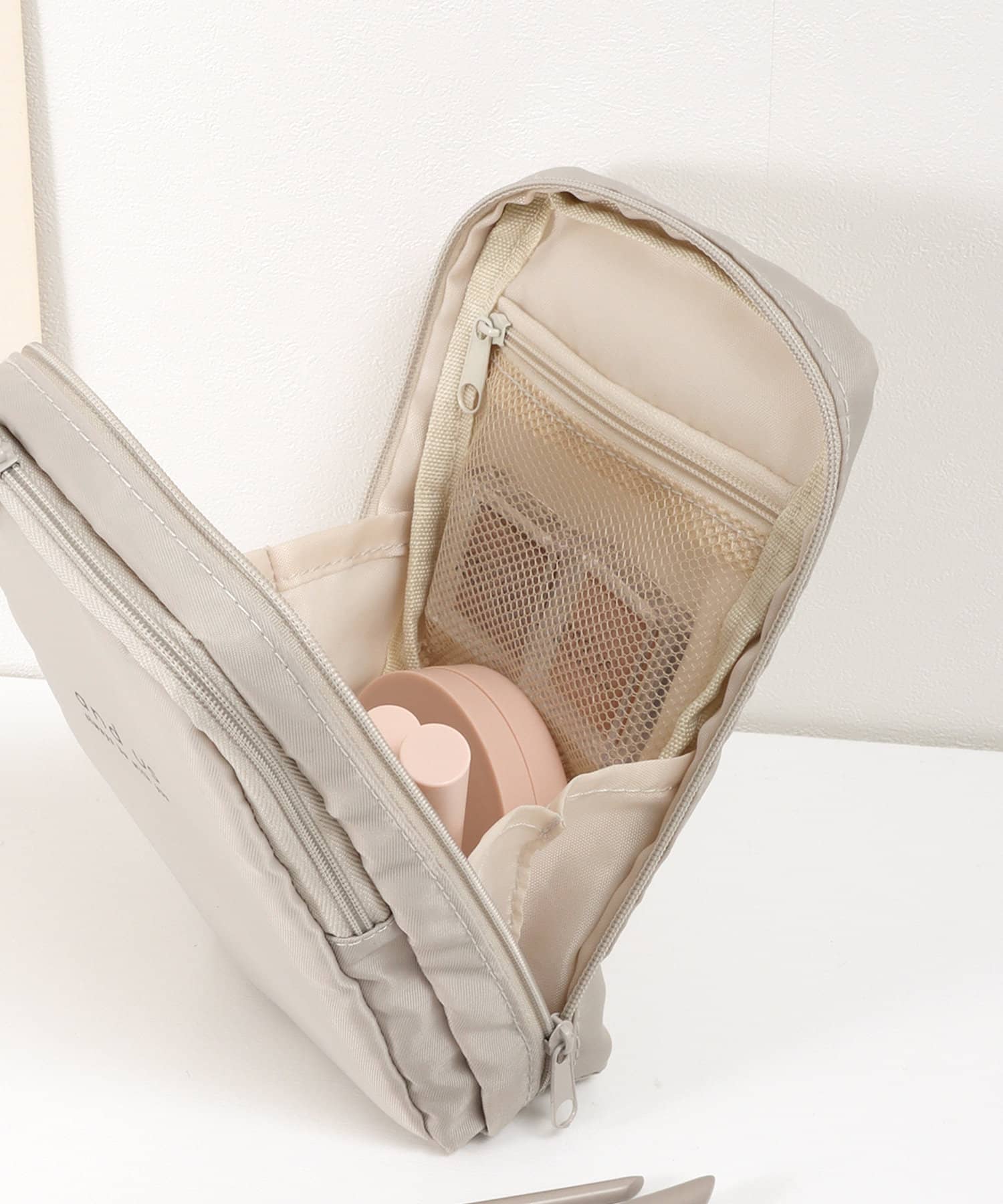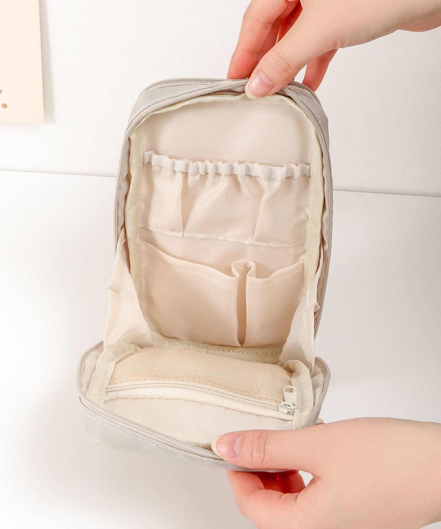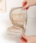 ●内側には細かなコスメが整頓しやすいように浅め、深め、メッシュなど様々な種類のポケットが付いています。