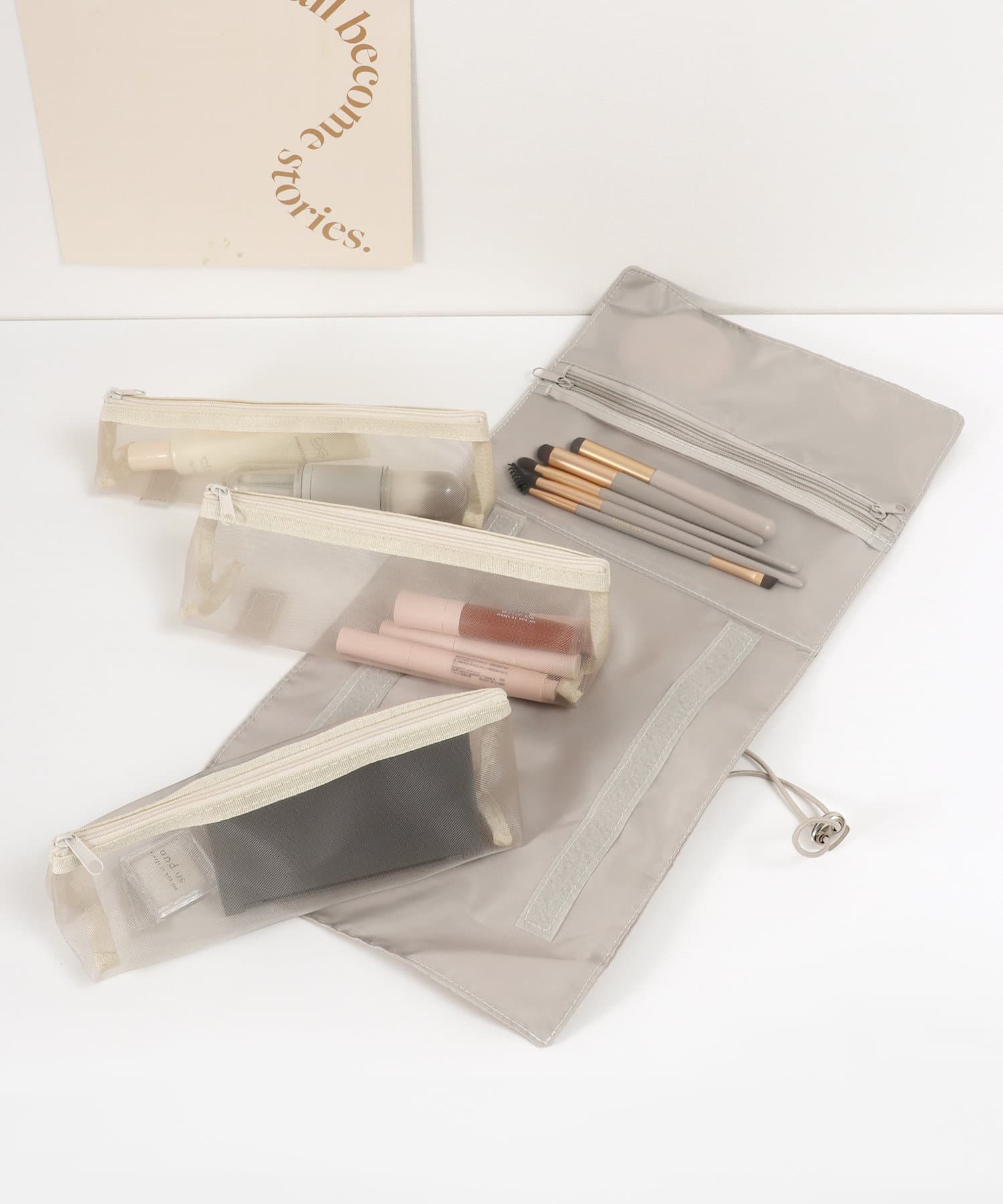 ●ヘアクリップなど細かいアイテムの収納に便利なファスナー付きのポケットや、透明ポケットも付属しております。