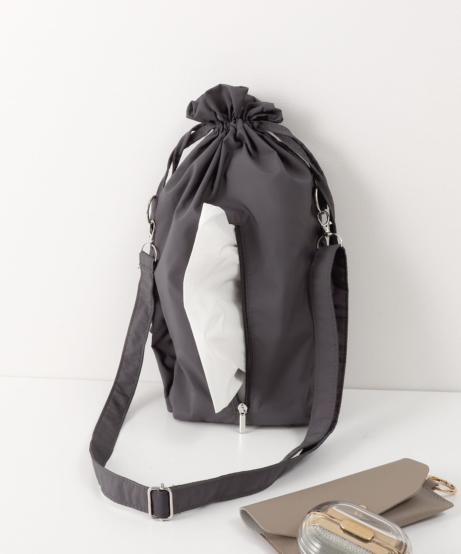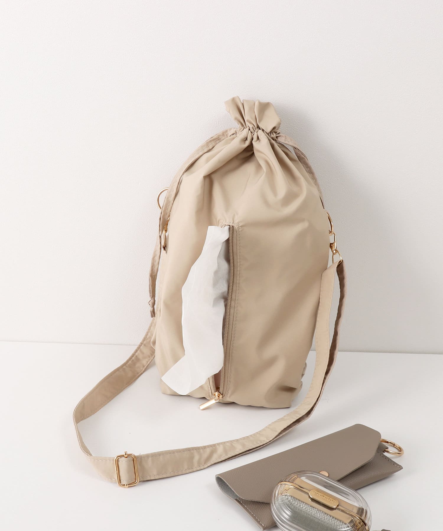 こちらの商品は箱ティッシュがバッグにそのまま入って、財布も小物も入る別ポケット、更に小さいポケットがあり、ショルダーもついています。