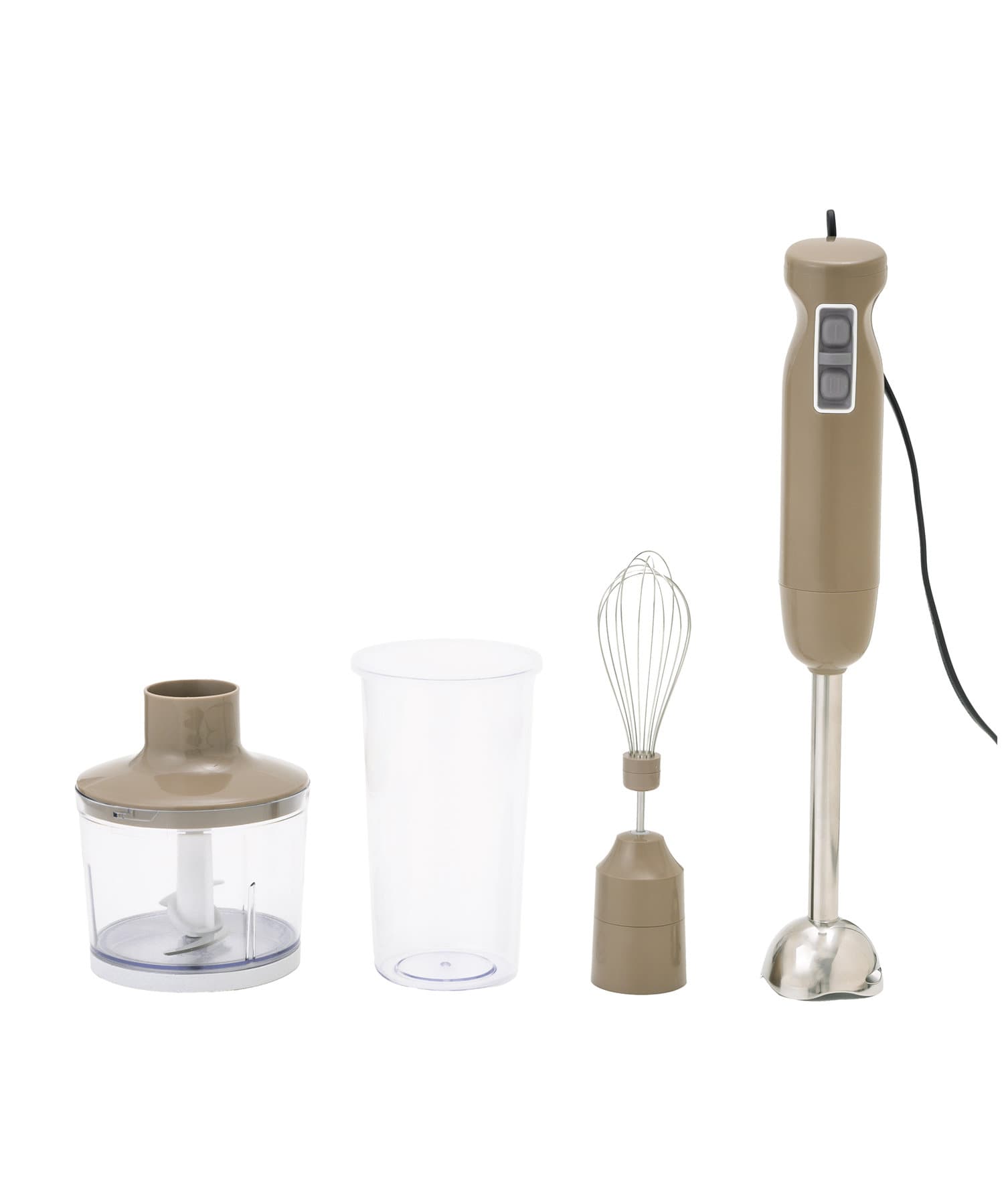 セット内容:本体、ホイッパー、ホイッパー用アタッチメント、チョッパーボトル、ボトルカバー、ブレンダーカップ用フタ、チョッパーボトル専用カッター、ブレンダーカップ、ブレンダースティック、取扱説明書