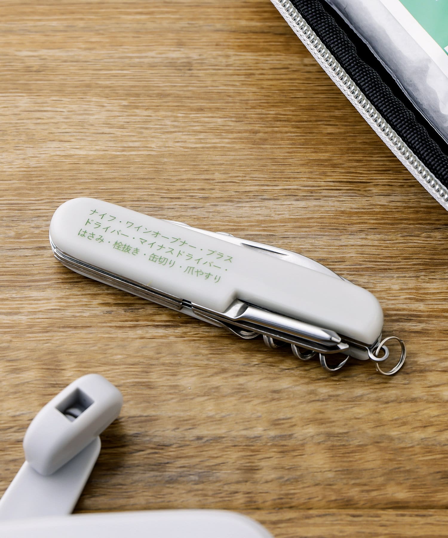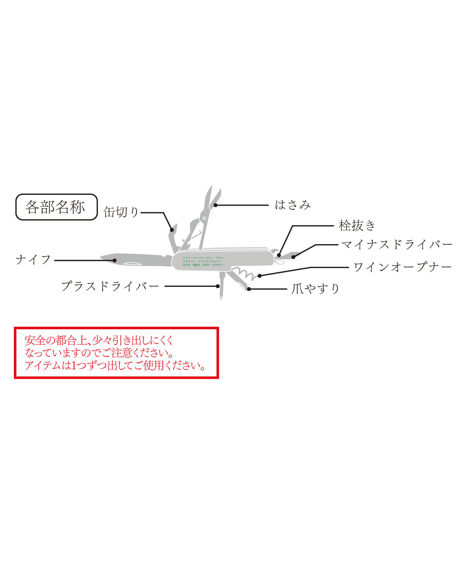●ナイフ・はさみ・プラスドライバー・マイナスドライバー・栓抜き・ワインオープナー・缶切り・爪やすりの8つの機能が備わっています。