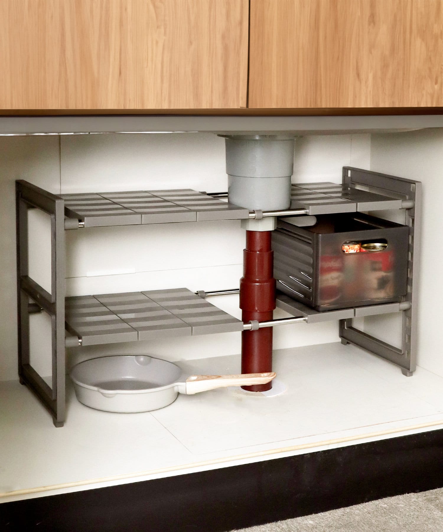 ●シンク下などに合わせて、幅と高さを調節できる便利な収納棚。