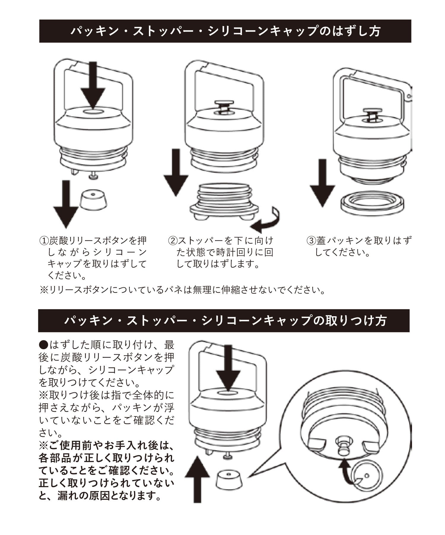●蓋パッキン、ストッパー、シリコーンキャップを洗った後は、全てのパーツをきちんと組み立ててください。