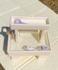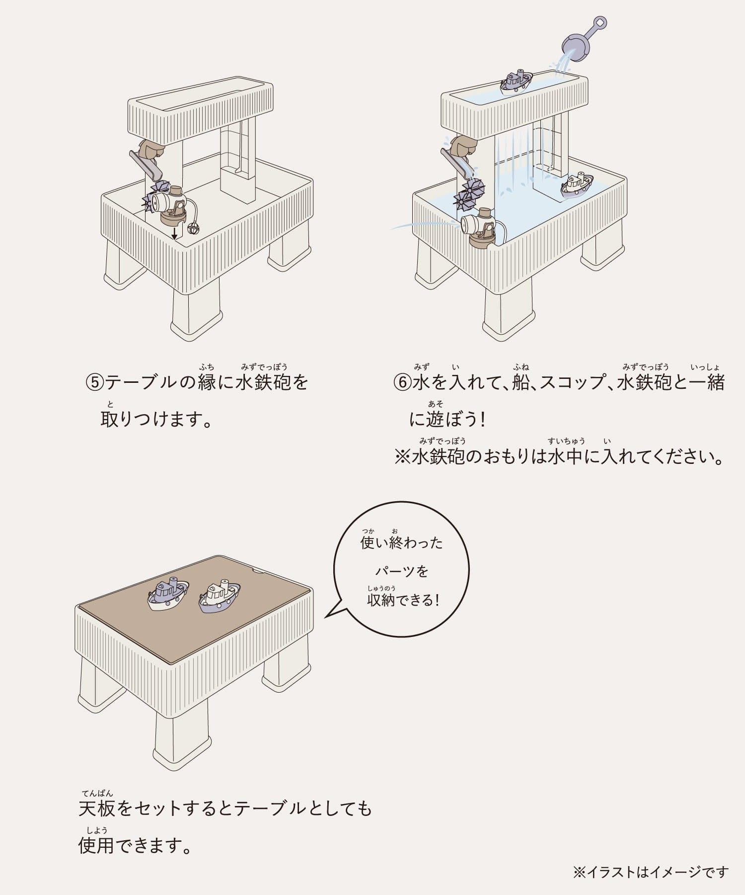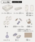 セット内容:テーブル大×1、テーブル小×1、支柱A×1、支柱B×1、脚×4、支柱用パーツ×各1、水鉄砲×1、スコップ×1、船×2、天板×1