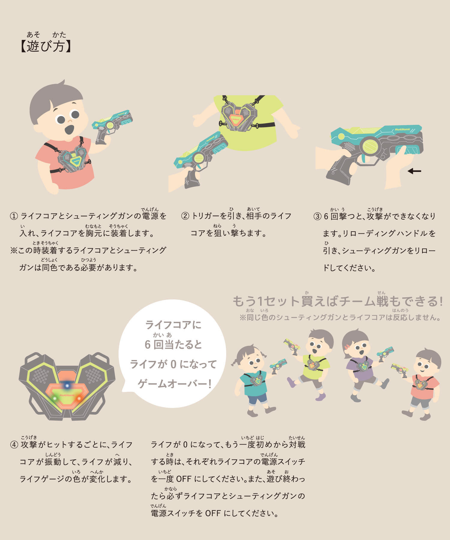 ●ライフコアとシューティングガンは微弱電波で連動しています。5~10mの範囲でご使用ください。
