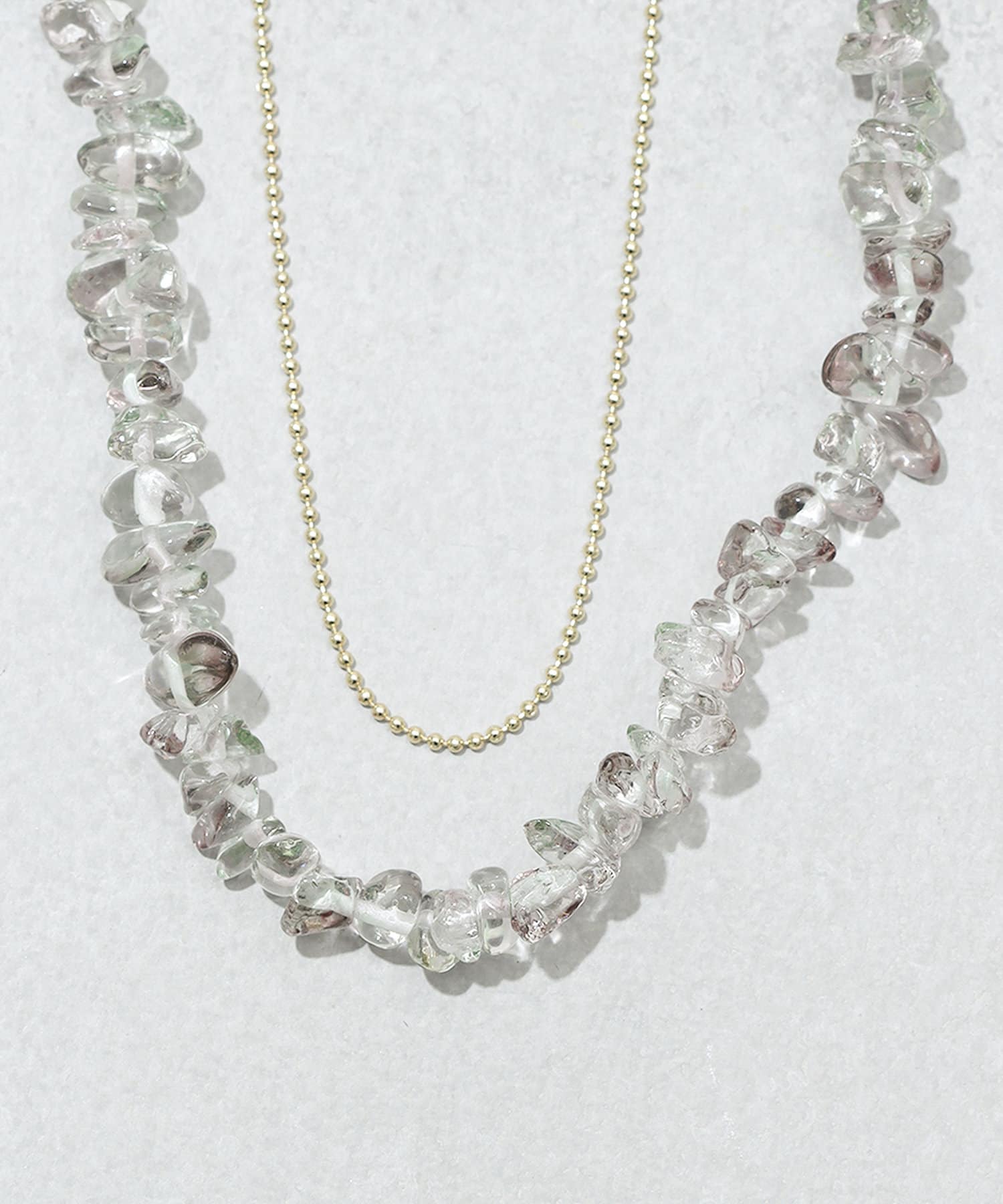 透き通ったビーズにチェーンがついているネックレスです。短めなのでTシャツの上やワンピースなどの上に付けても良さそうです。暑くなるのでビーズ系のネックレスが欲しかったので即購入でした。