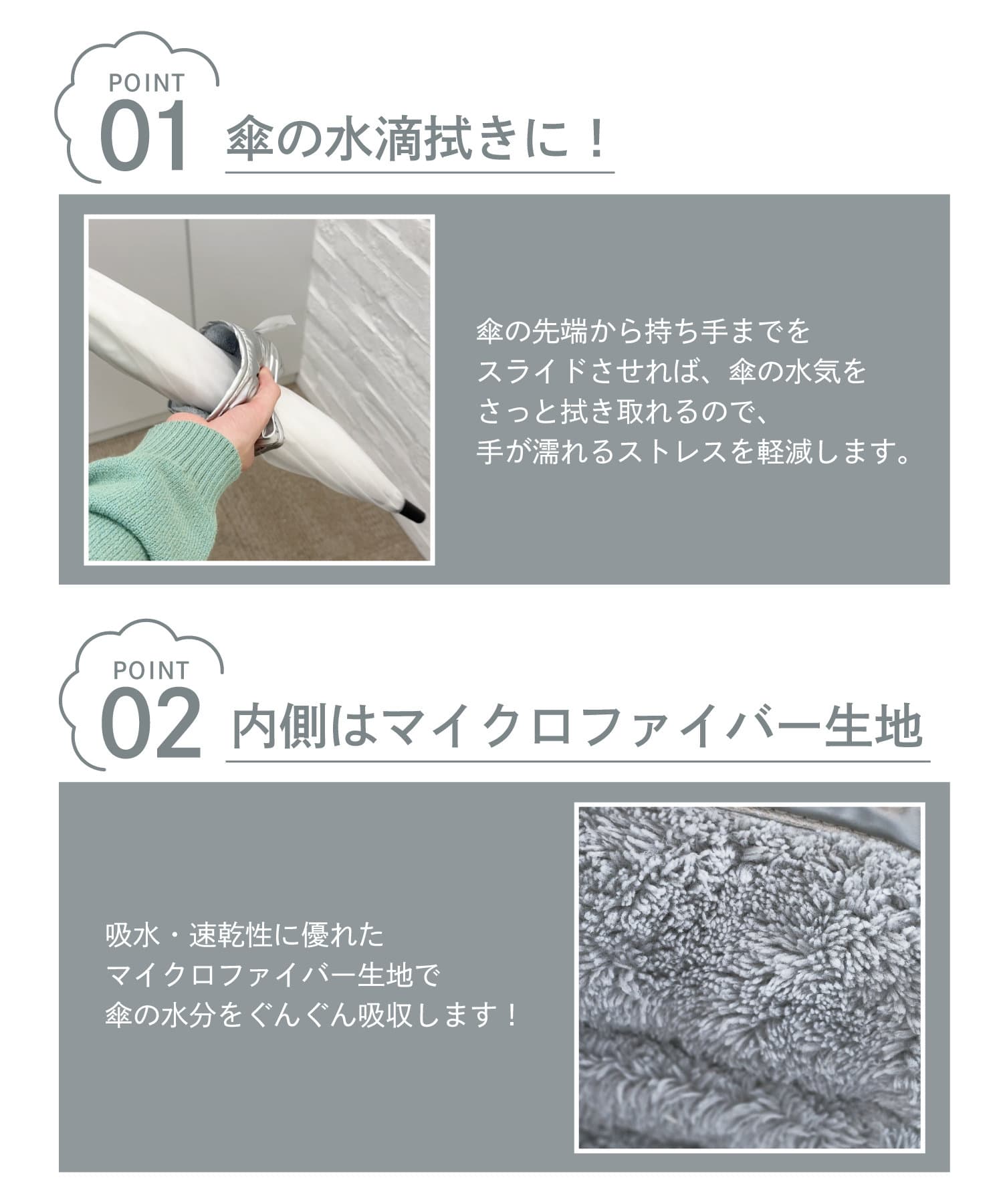 ●濡れた傘の水気をさっと拭き取って手が濡れるストレスを軽減!