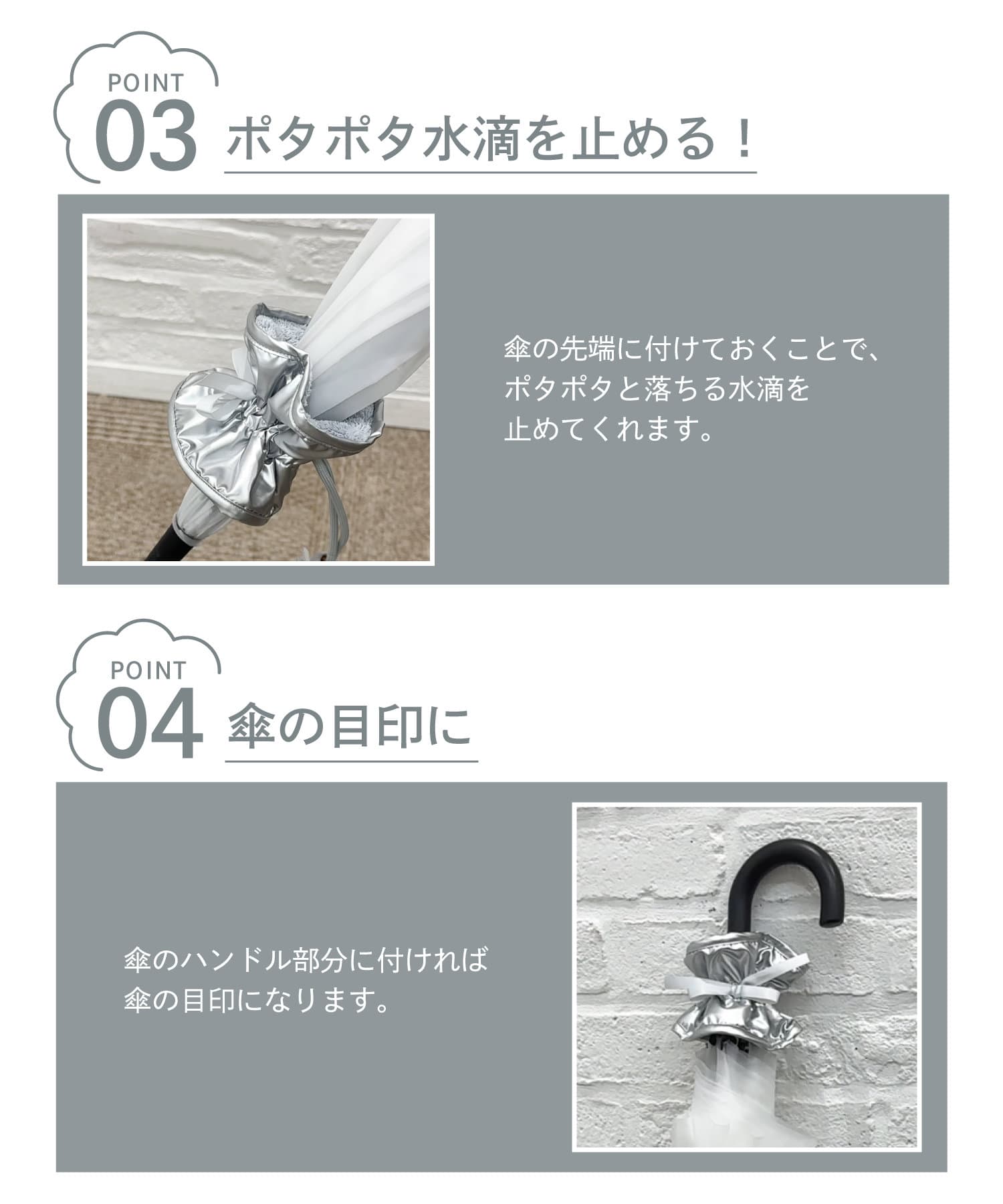 ●水気を拭き取ったあと傘の先端に付けておくことで、落ちる水滴を止めてくれます。