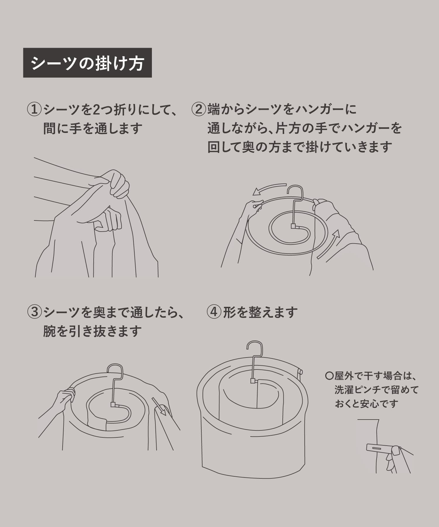 ●屋外で干す場合は、洗濯ピンチで留めておくと安心です。