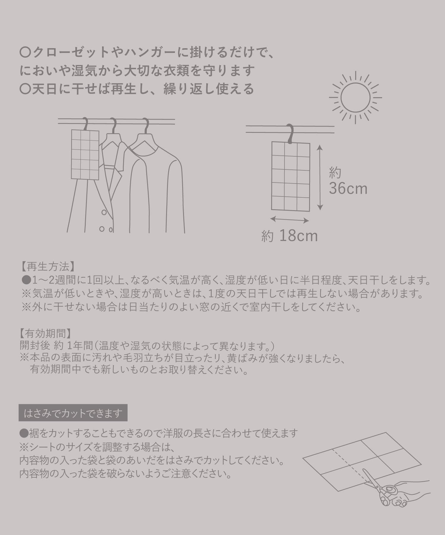 ●クローゼットやハンガーに掛けるだけ!においや湿気から大切な衣類を守ります。