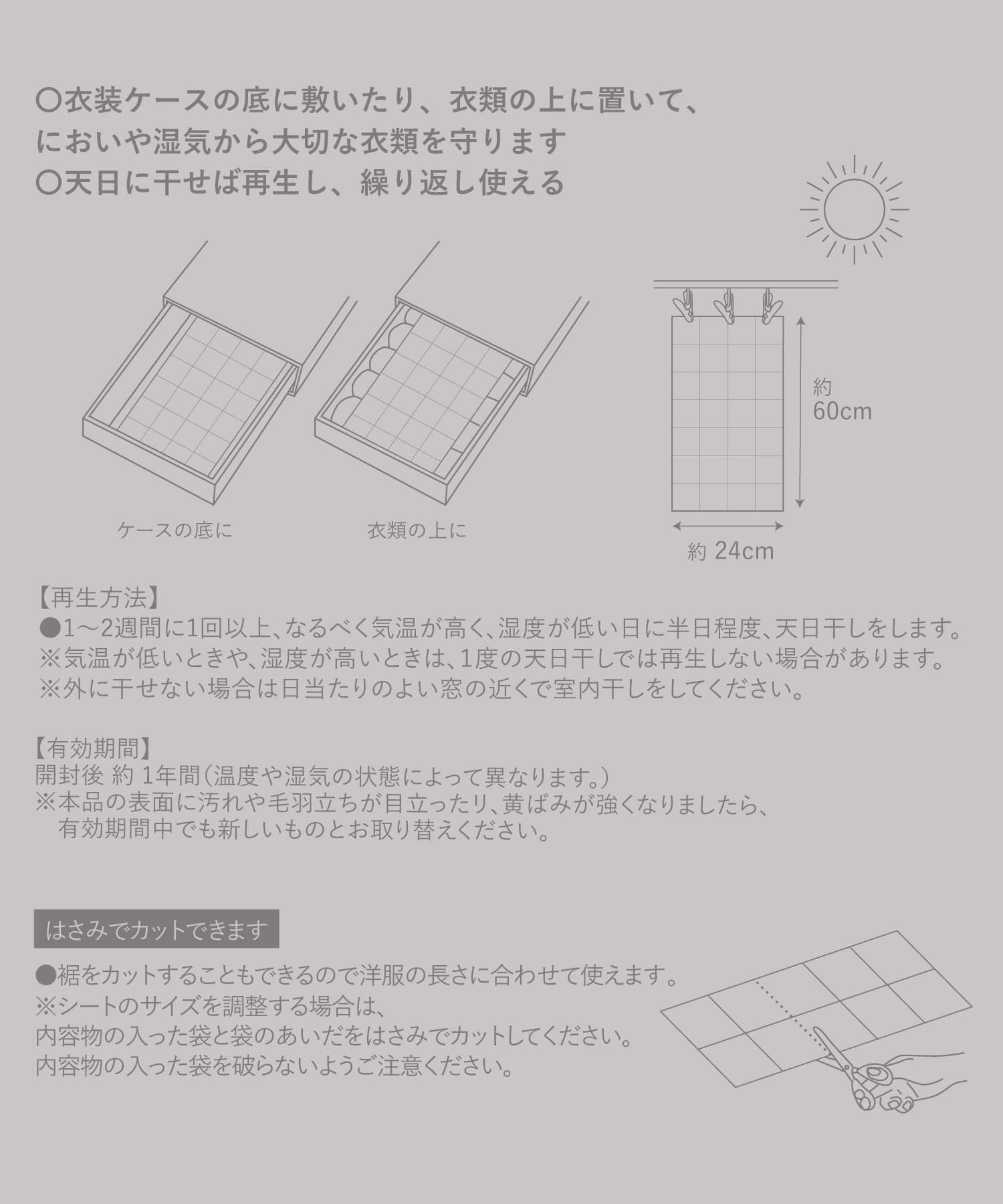 ●衣装ケースの底に敷いたり、衣類の上に置くことでにおいや湿気から大切な衣類を守ります。