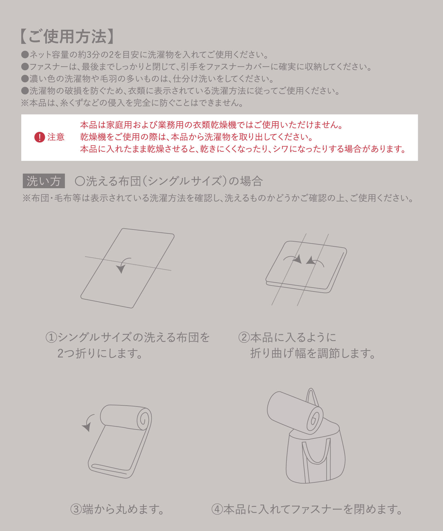 ●ドラム式洗濯機をご使用の場合は、本品のファスナーでドラム内に傷がつく恐れがありますのでご注意ください。