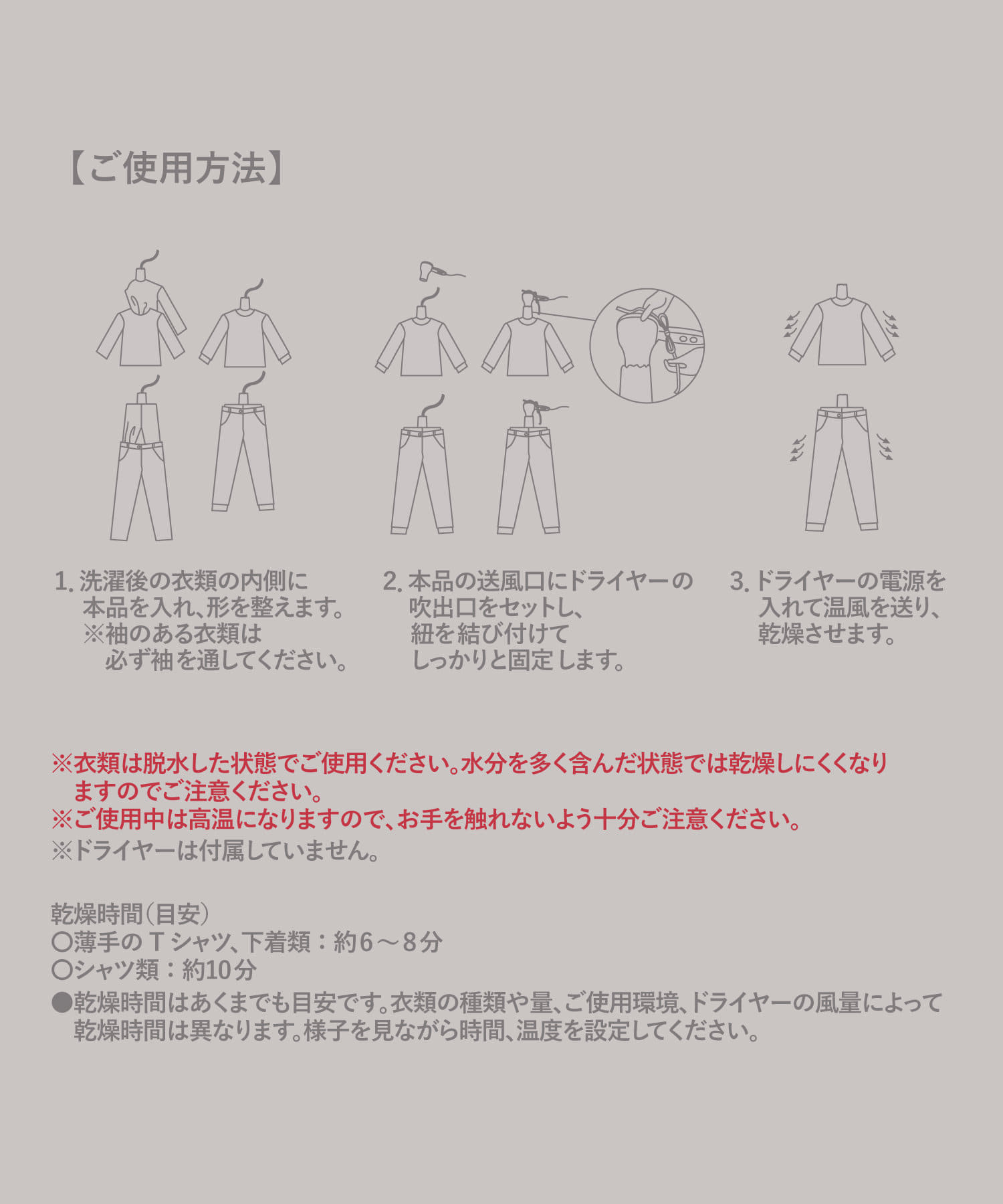●衣類のサイズ、形状、ドライヤーの機種によってはご利用いただけない場合があります。
