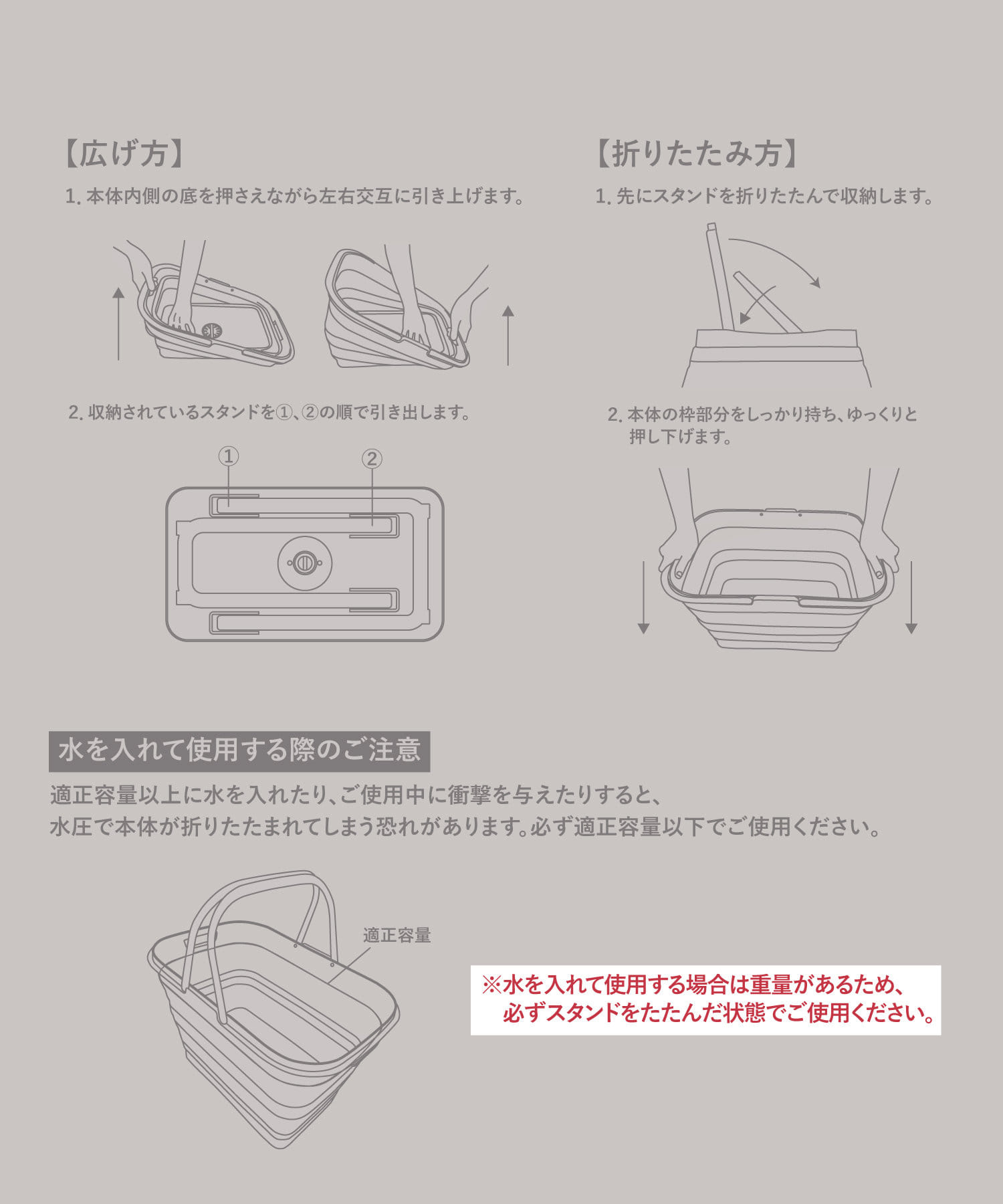※水を入れて使用する場合は重量があるため、必ずスタンドをたたんだ状態でご使用ください。