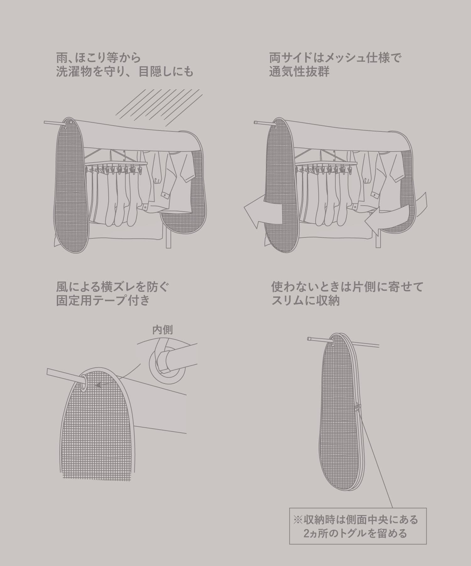 ●物干し竿に通し、内側の固定テープでしっかりと固定されていることをご確認の上、ご使用ください。